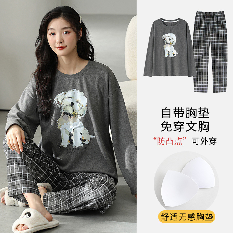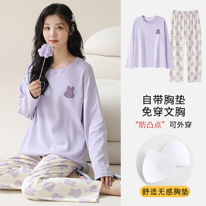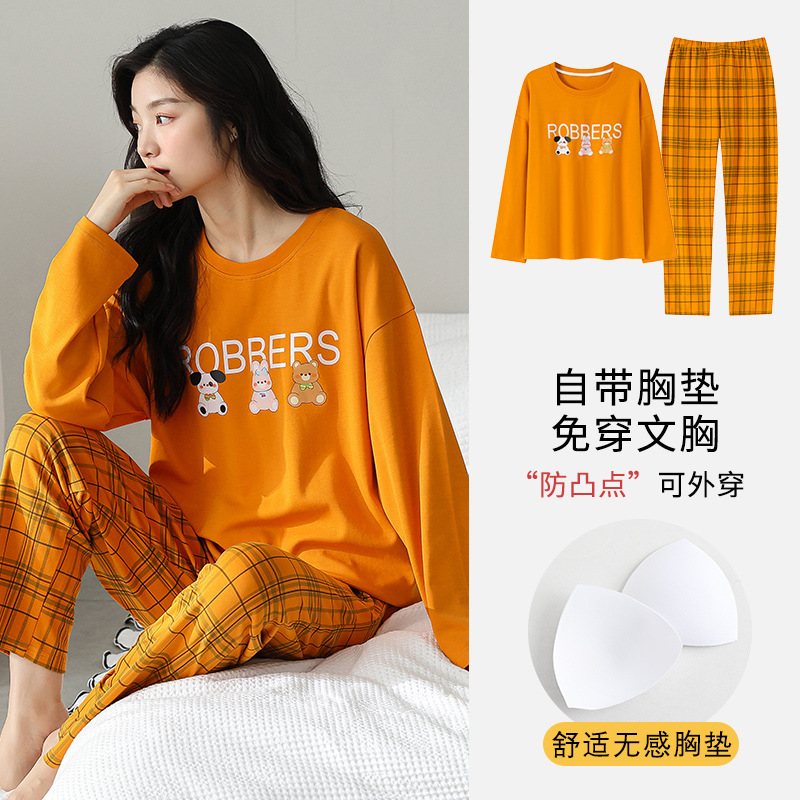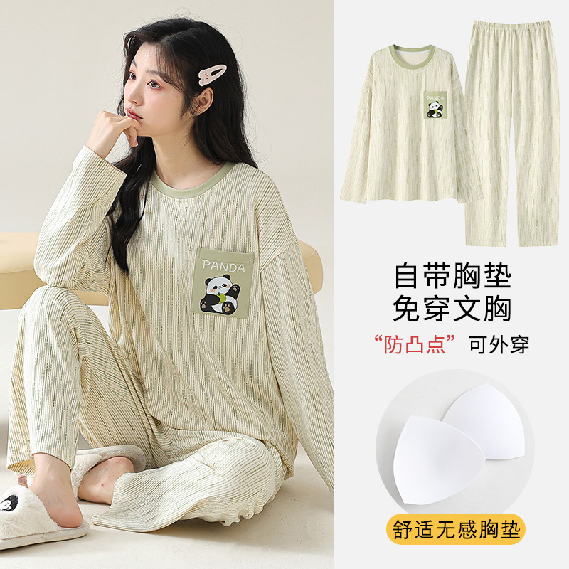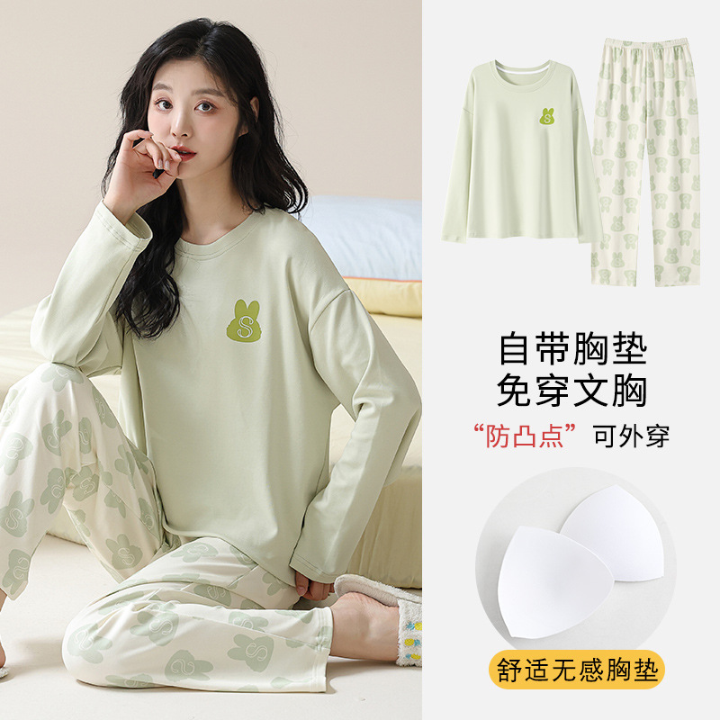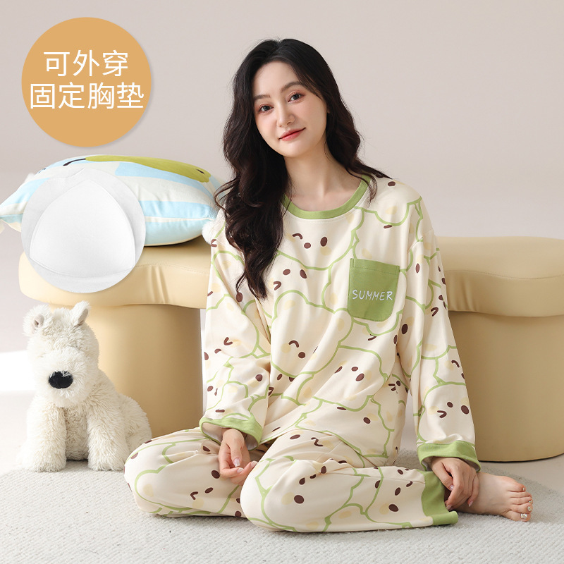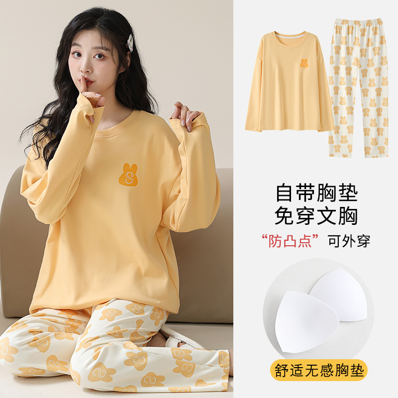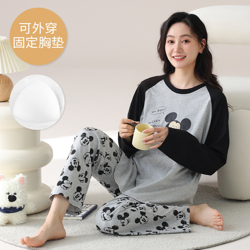 2025 긴 소매 잠옷 여성의 가을 만화 얇은 코튼 홈 옷 봄, 가을, 겨울 세트 입고 가슴 패드 외부