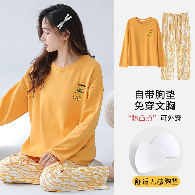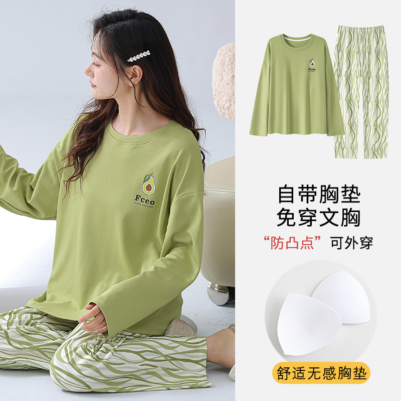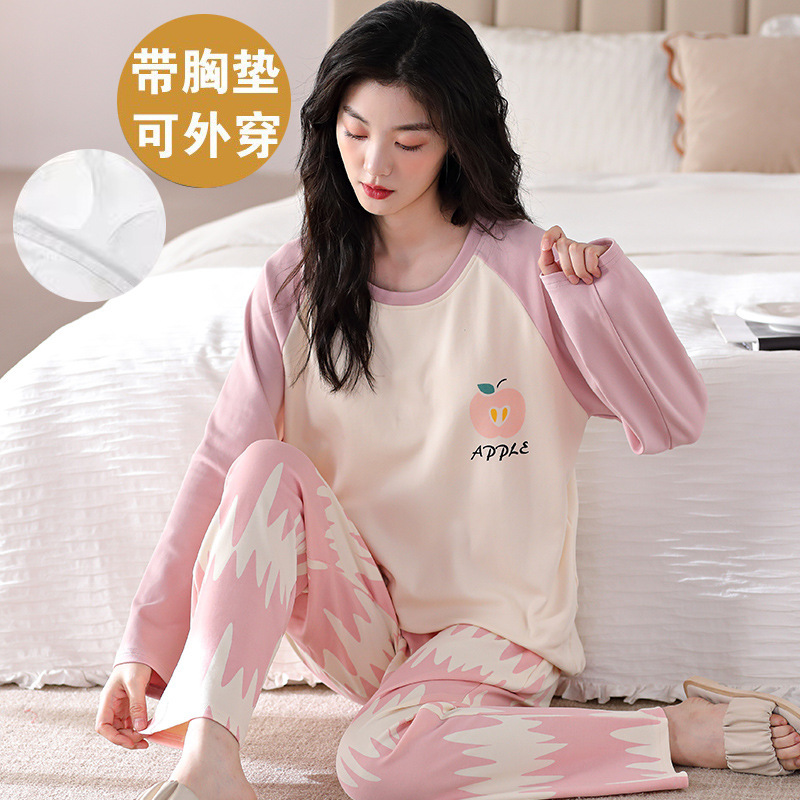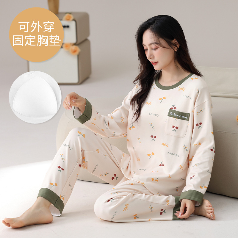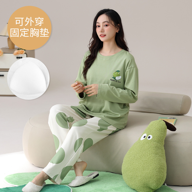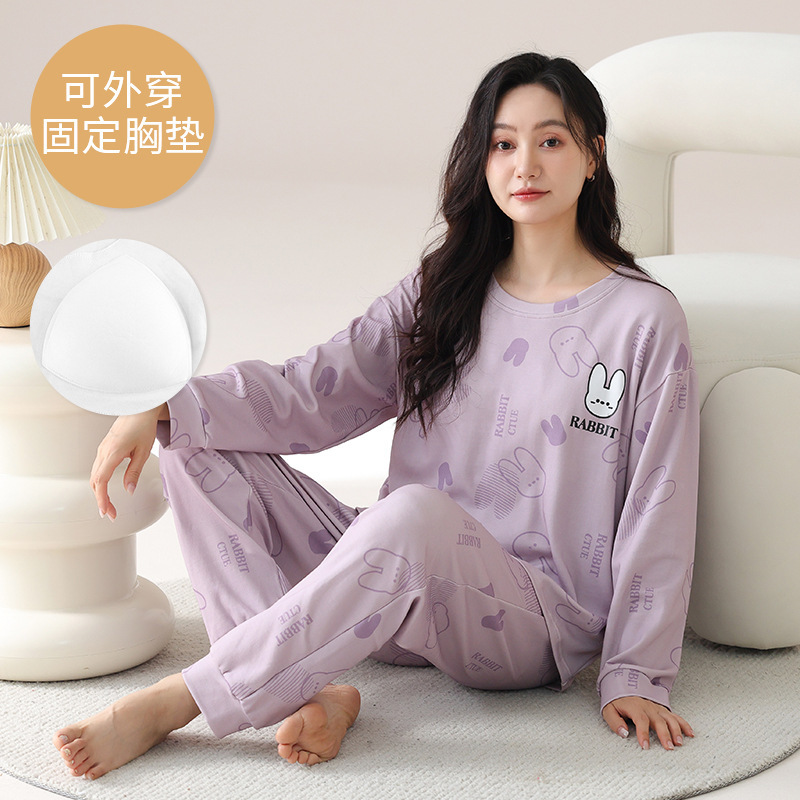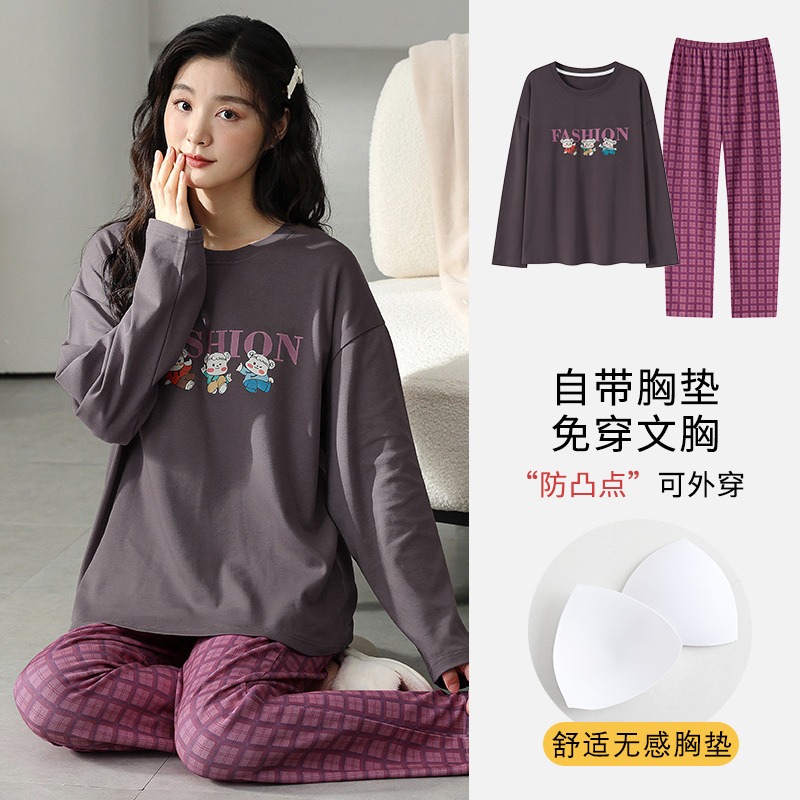 2025 긴 소매 잠옷 여성의 가을 만화 얇은 코튼 홈 옷 봄, 가을, 겨울 세트 입고 가슴 패드 외부