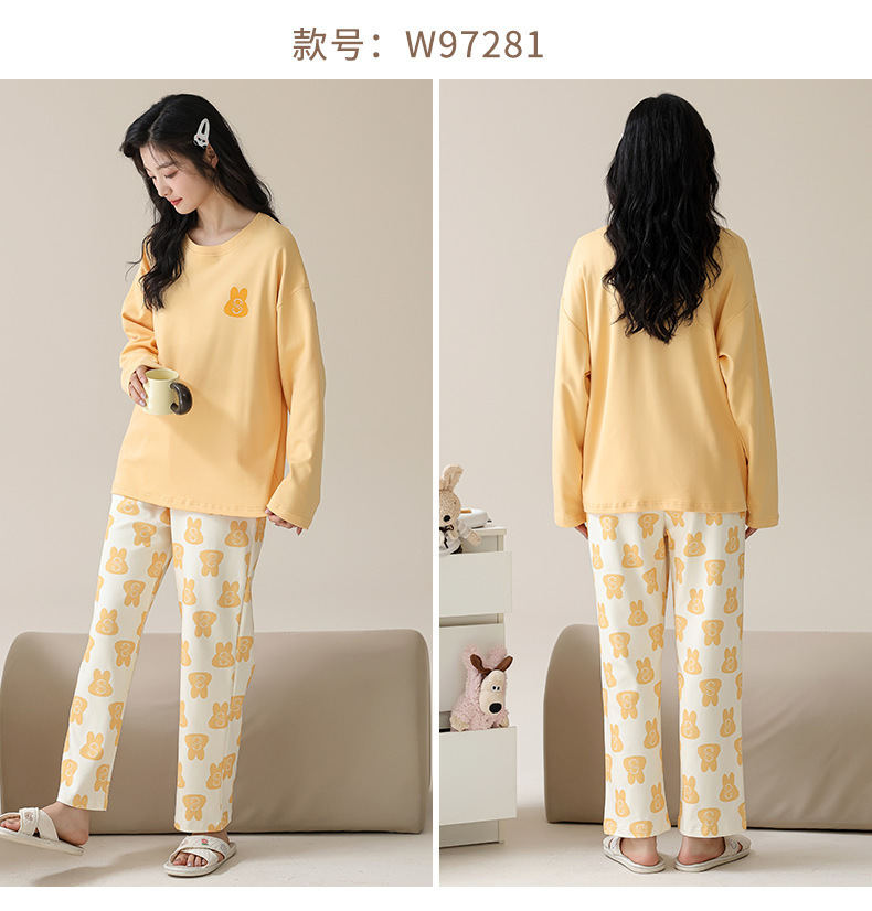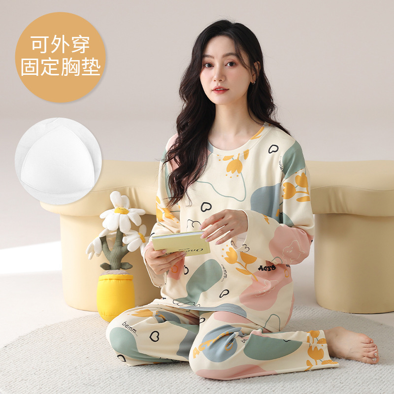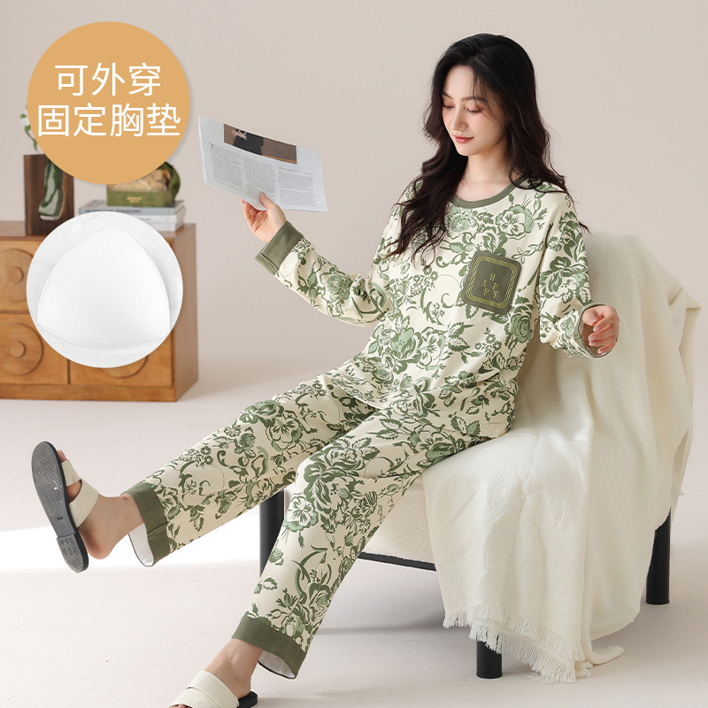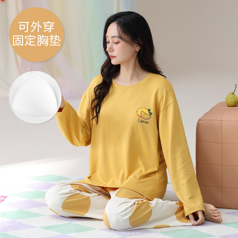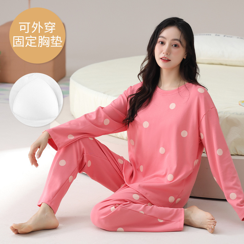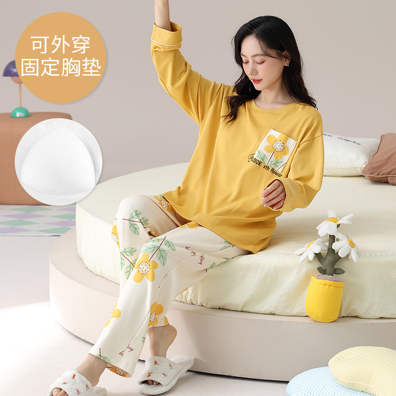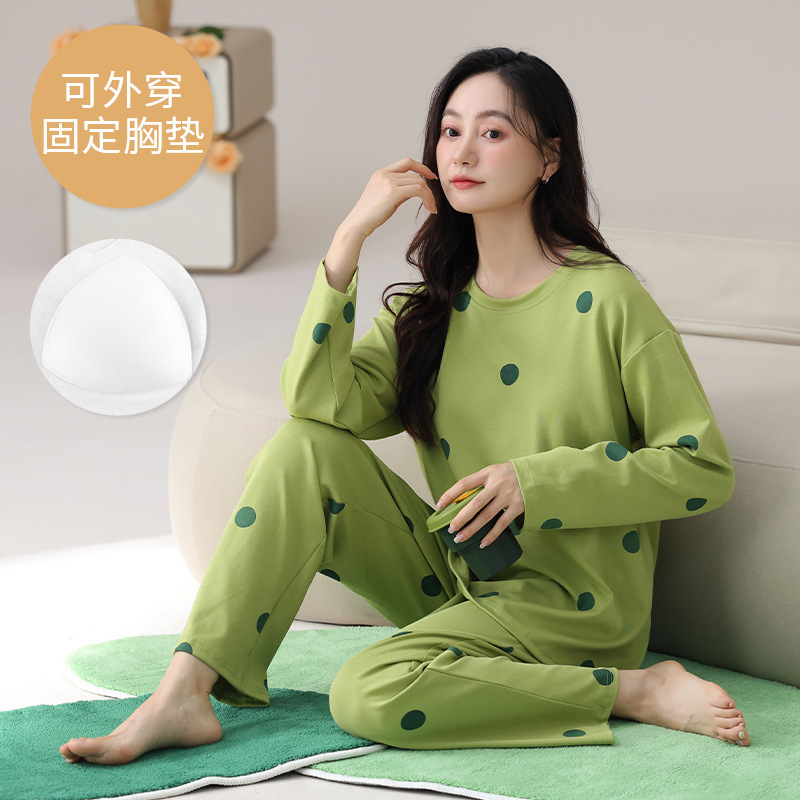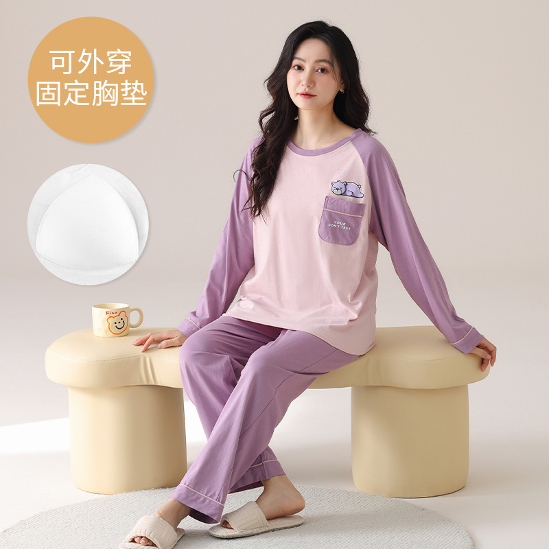 2025 긴 소매 잠옷 여성의 가을 만화 얇은 코튼 홈 옷 봄, 가을, 겨울 세트 입고 가슴 패드 외부