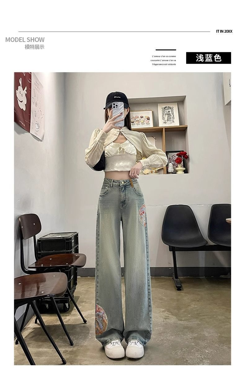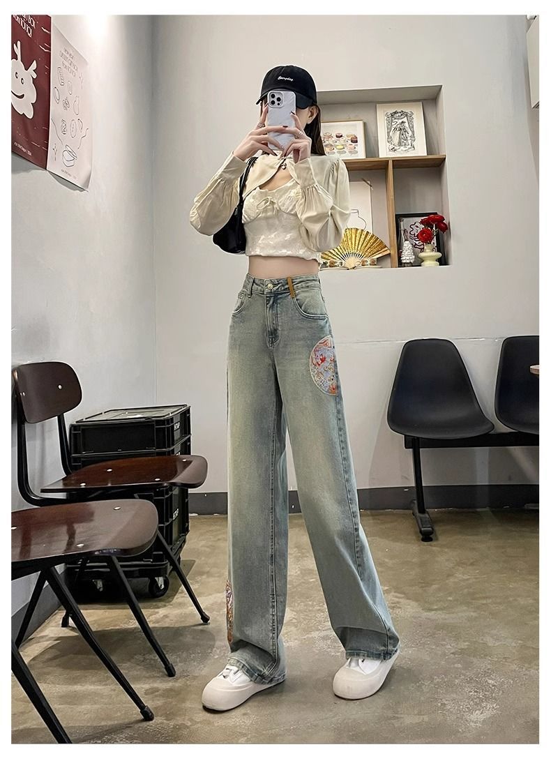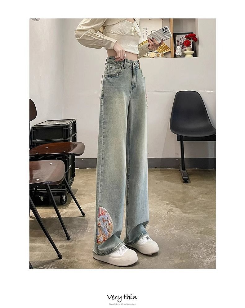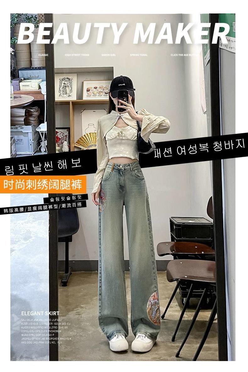 인기있는 Guofeng 자수 스트레이트 청바지 여성의 2025 봄 높은 허리 슬리밍 작은 좁은 넓은 다리 바지스토어 가기