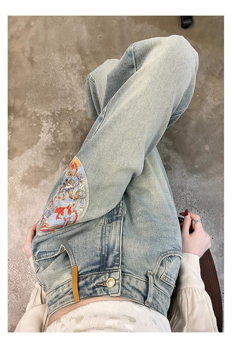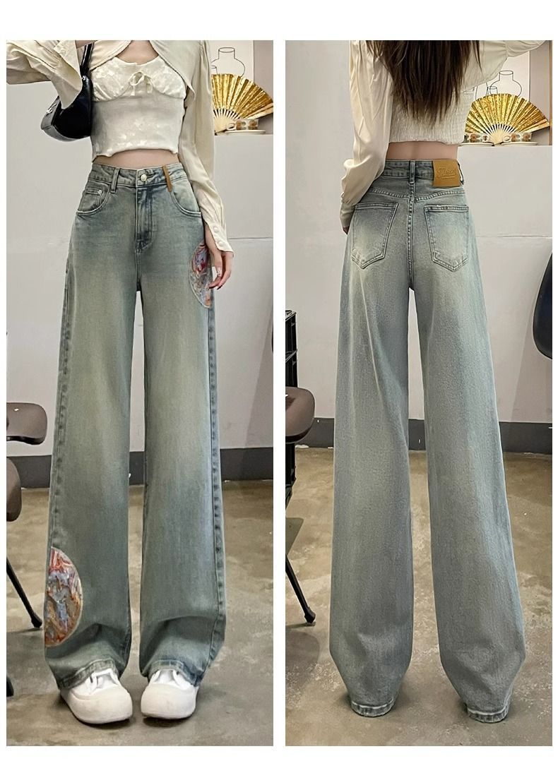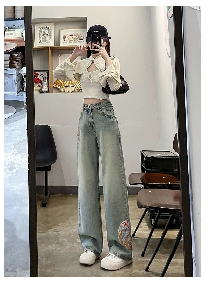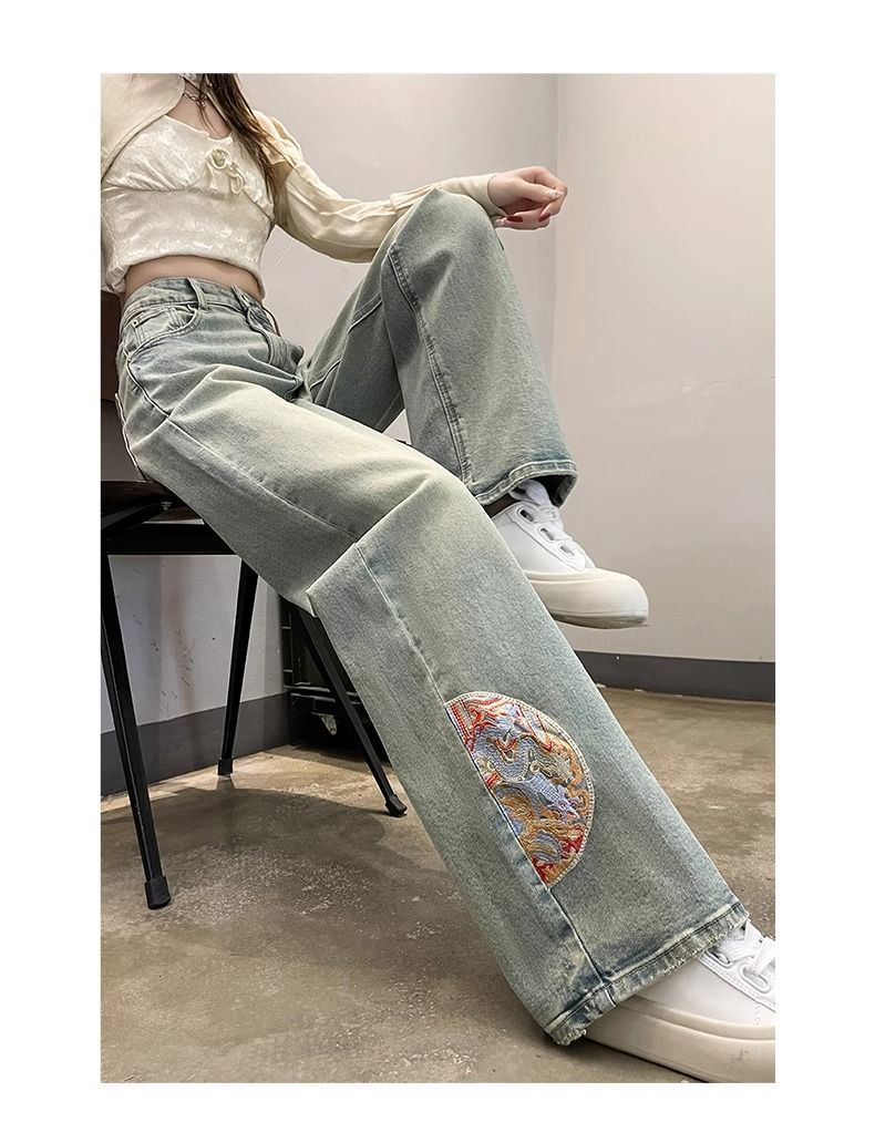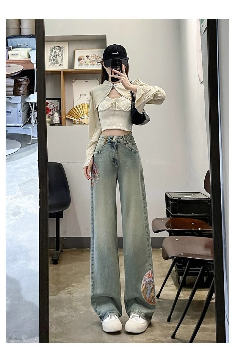 인기있는 Guofeng 자수 스트레이트 청바지 여성의 2025 봄 높은 허리 슬리밍 작은 좁은 넓은 다리 바지스토어 가기