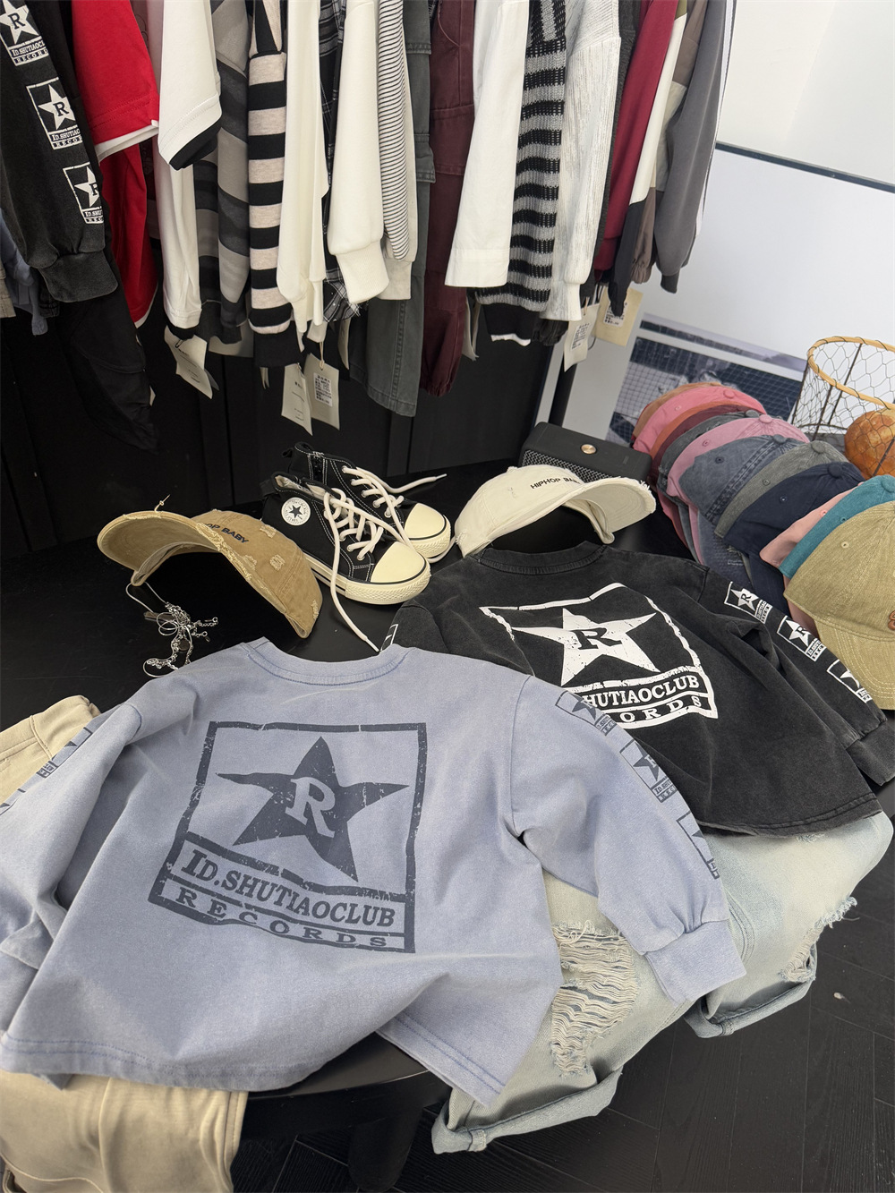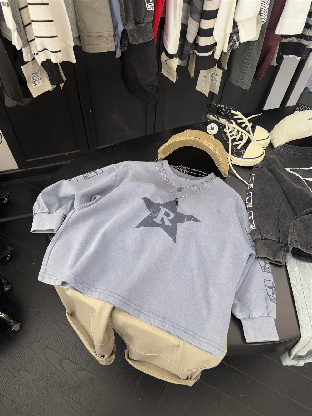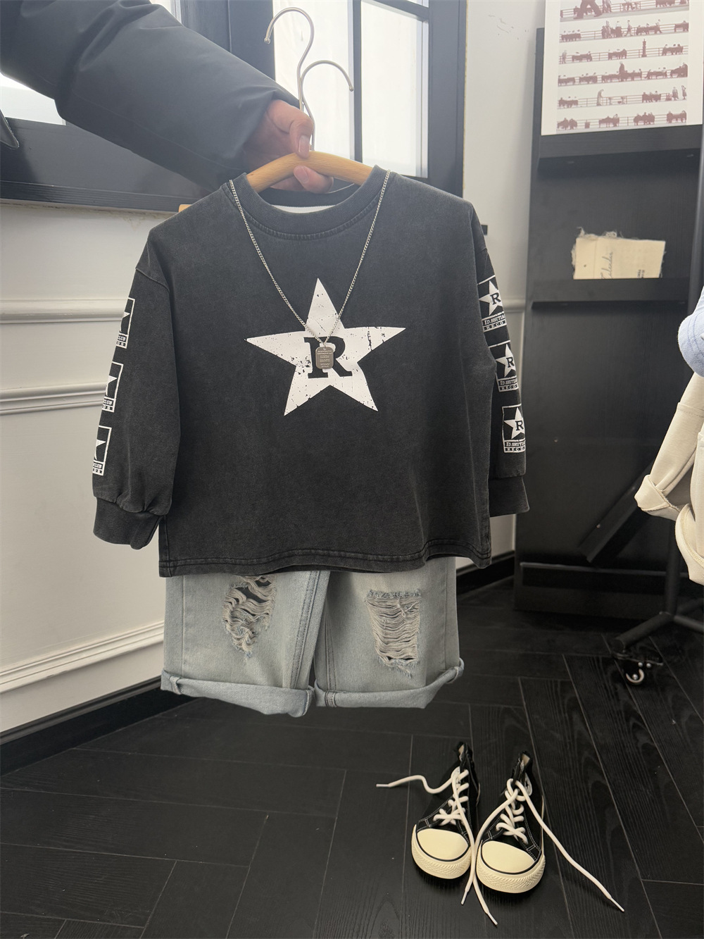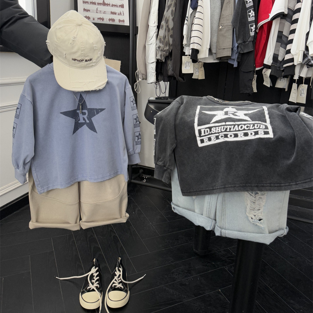 2025 봄 어린이 아메리칸 스타일 구식 화이트 5 성급 편지 긴 소매 티셔츠 소년의 중립 튀김 컬러 레트로 탑스토어 가기