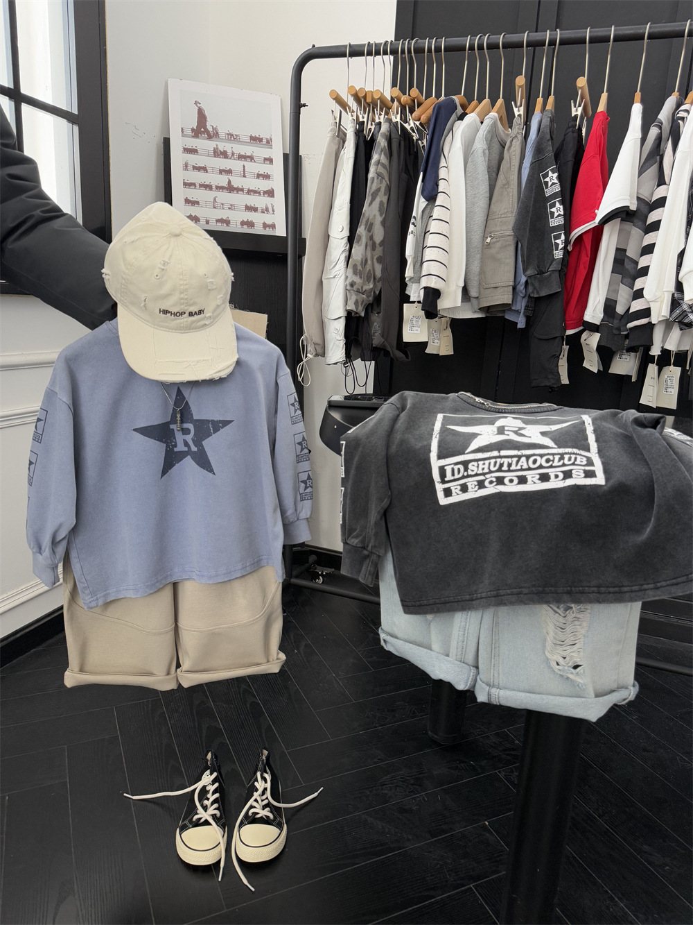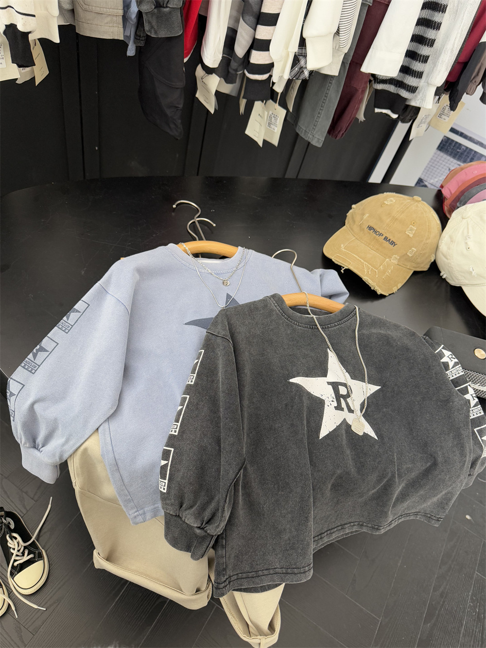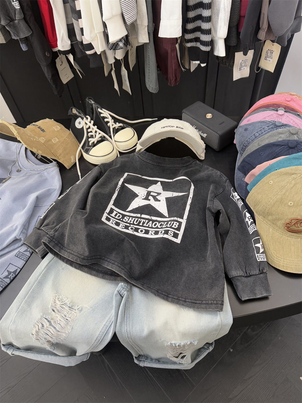 2025 봄 어린이 아메리칸 스타일 구식 화이트 5 성급 편지 긴 소매 티셔츠 소년의 중립 튀김 컬러 레트로 탑스토어 가기