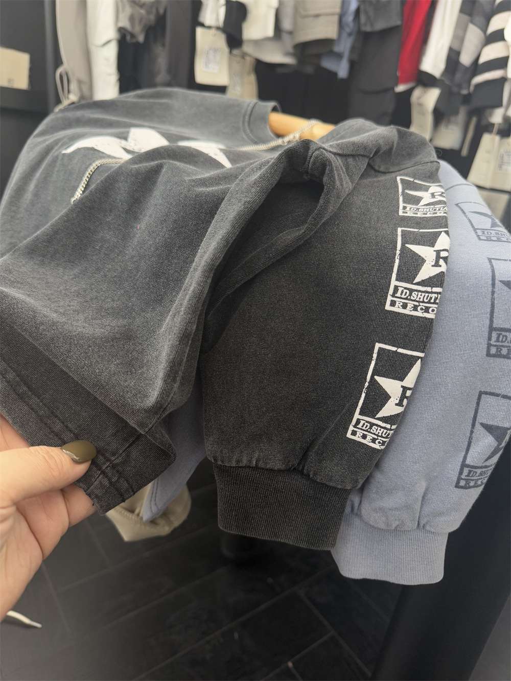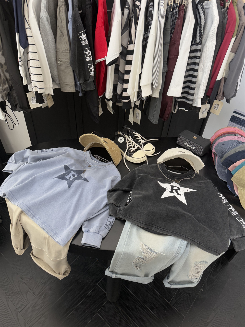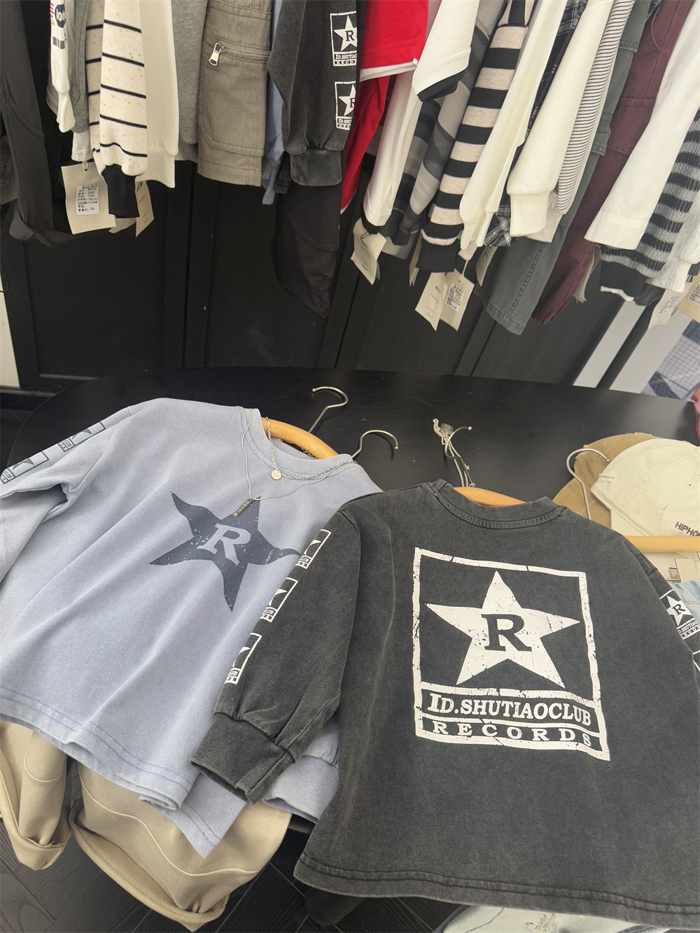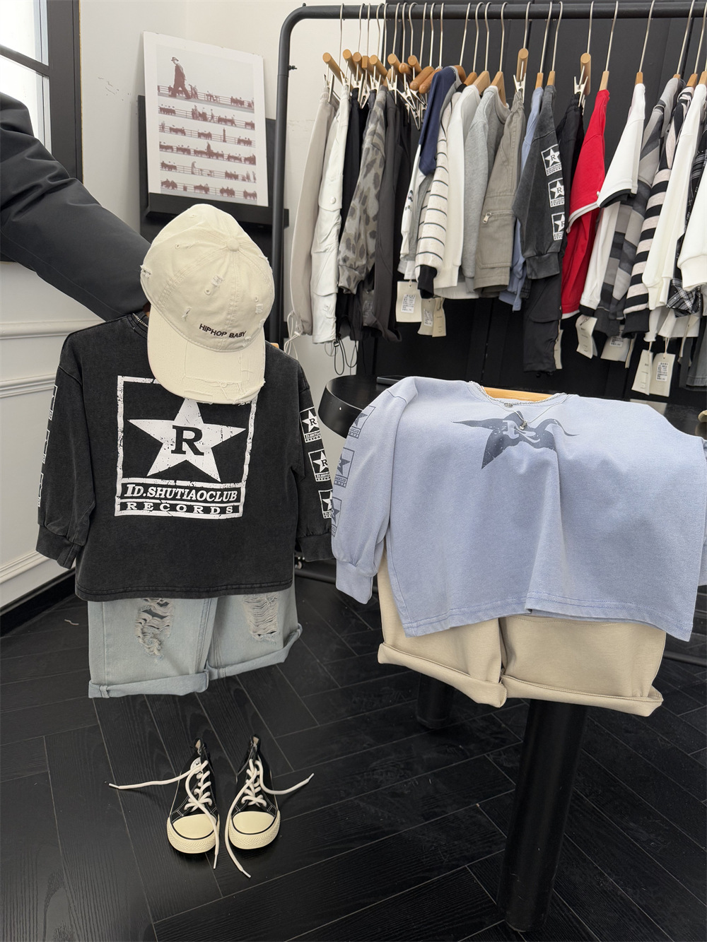 2025 봄 어린이 아메리칸 스타일 구식 화이트 5 성급 편지 긴 소매 티셔츠 소년의 중립 튀김 컬러 레트로 탑스토어 가기