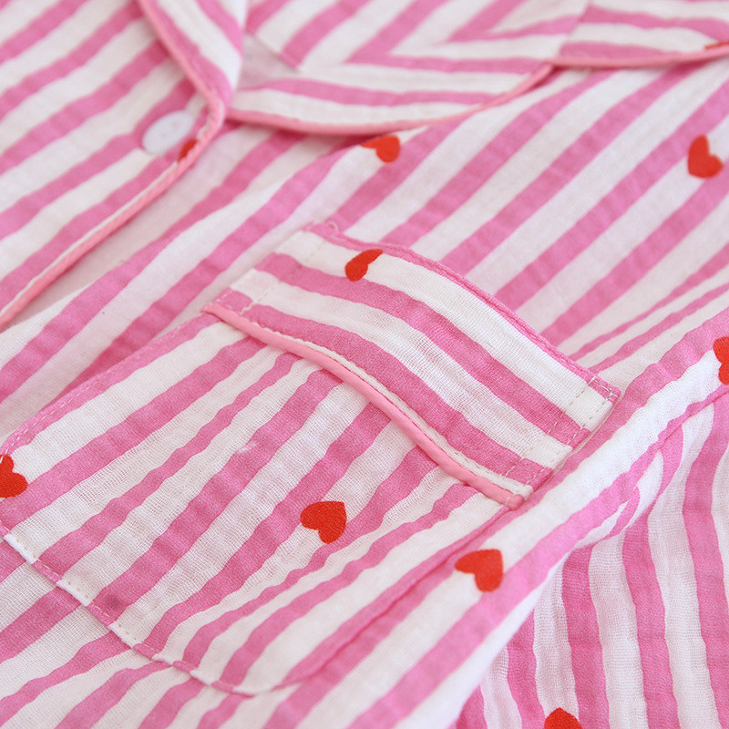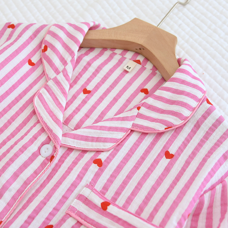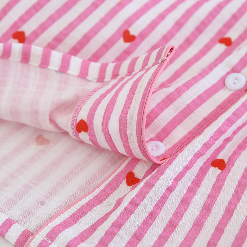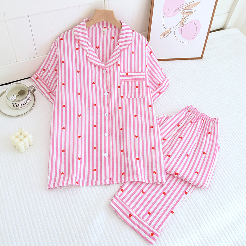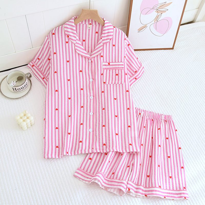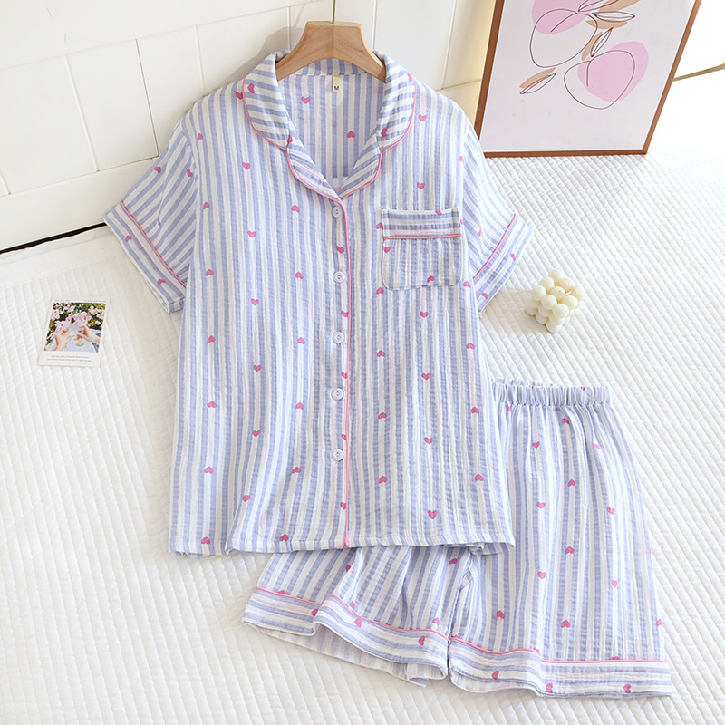 잠옷 여성의 새로운 여름 거즈 여성면 반팔 반바지 여름 홈 옷 투피스 세트 줄무늬 사랑