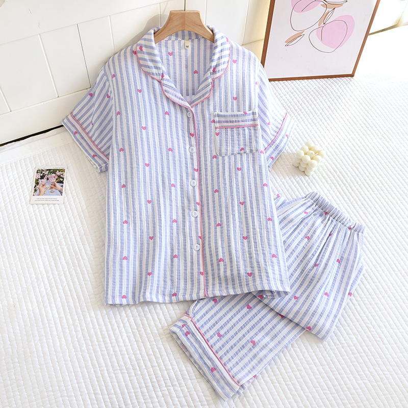 잠옷 여성의 새로운 여름 거즈 여성면 반팔 반바지 여름 홈 옷 투피스 세트 줄무늬 사랑스토어 가기