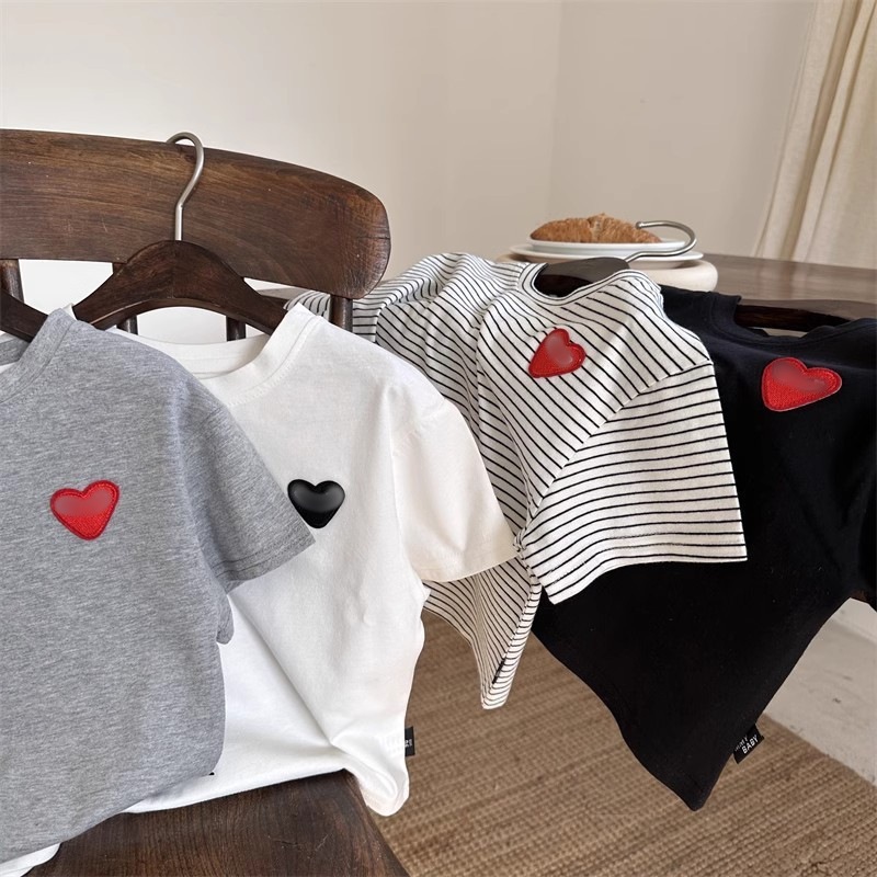 [아이스 실크 코튼] 클래스 A 반팔 2025 여름 소년 소녀 스트라이프 러브 베이비 솔리드 컬러 라운드 넥 탑 도매스토어 가기