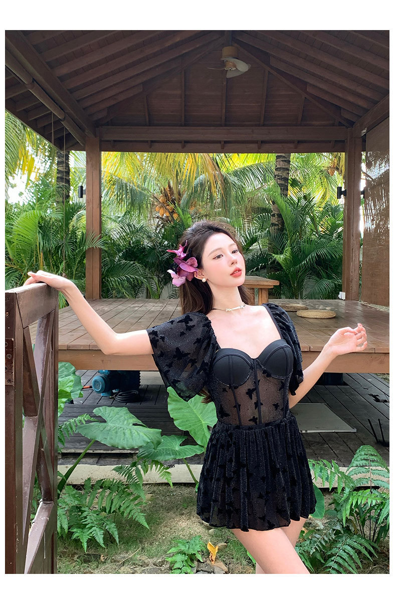 블랙 나비 파인 플래시 원피스 스커트 수영복 여성용 긴팔 육체 커버 슬림 원근감 섹시한 작은 가슴 수집 온천