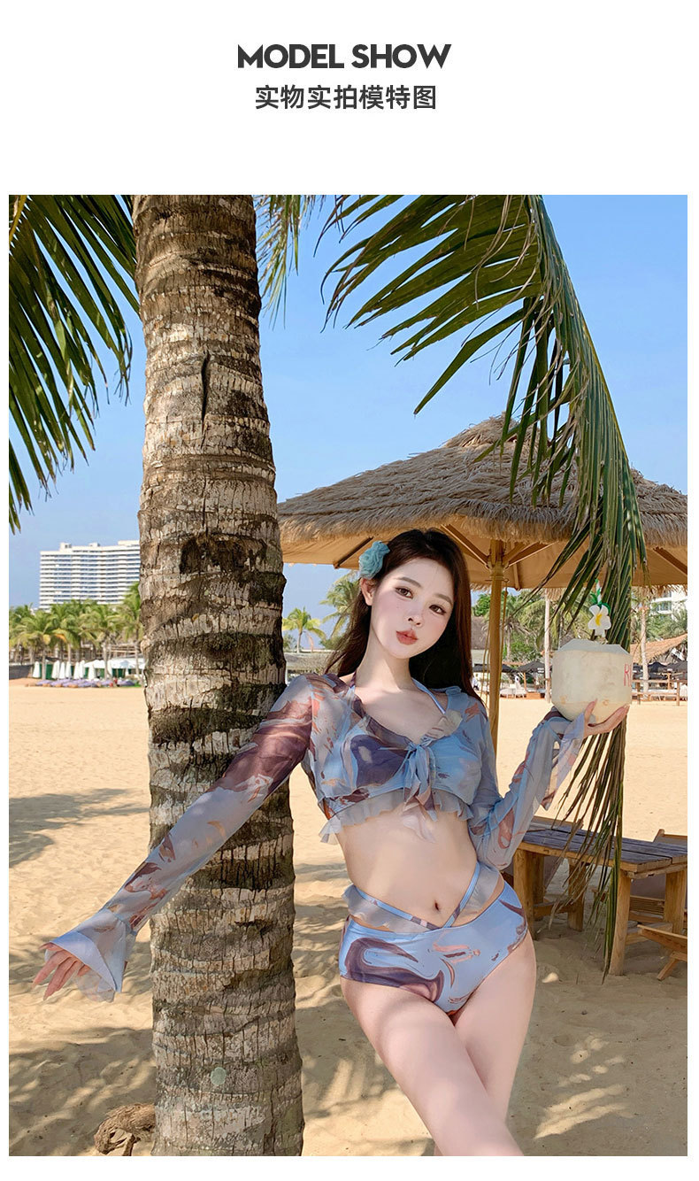 2025 새로운 스플릿 3 피스 수영복 여성 배꼽 커버 슬리밍 비치 홀리데이 온천 수영복 원근감 긴 소매 세트