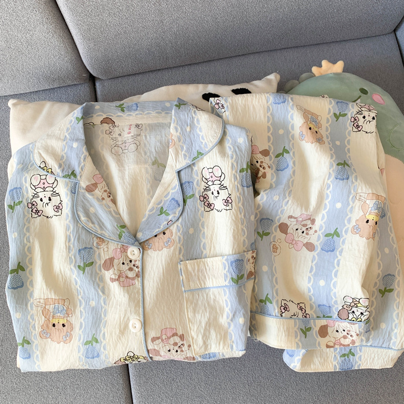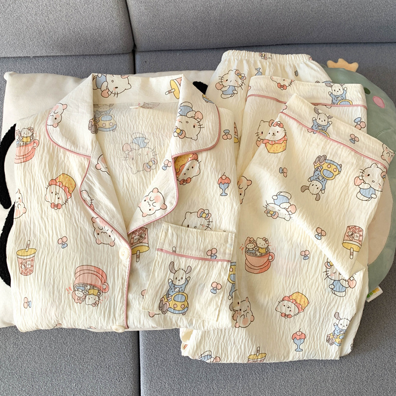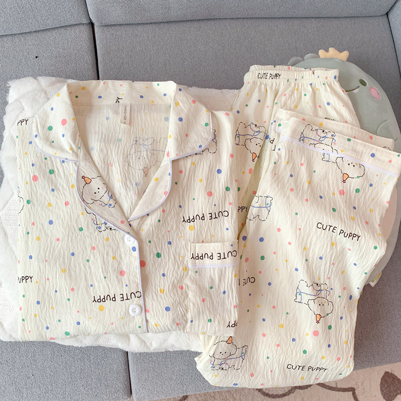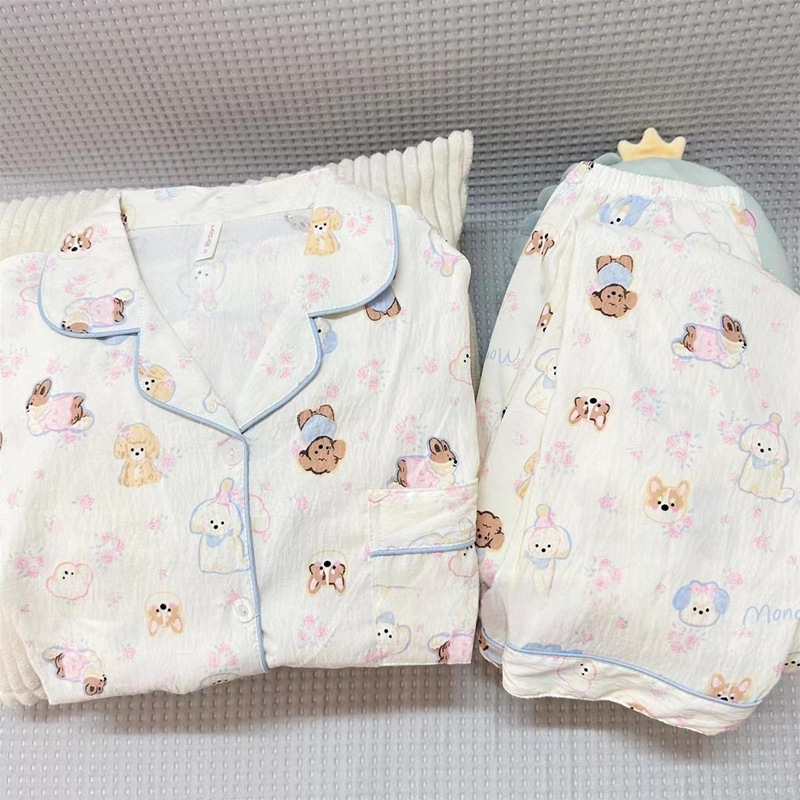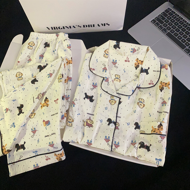 2025 새로운 면 거즈 봄과 가을 잠옷 여성의 여름 긴 소매 만화 일본 강아지 귀여운 느슨한 집 옷스토어 가기