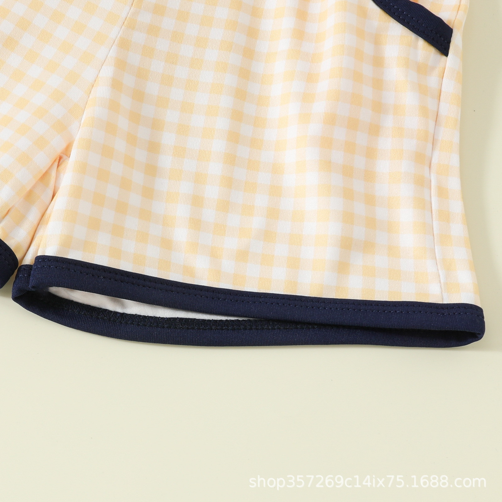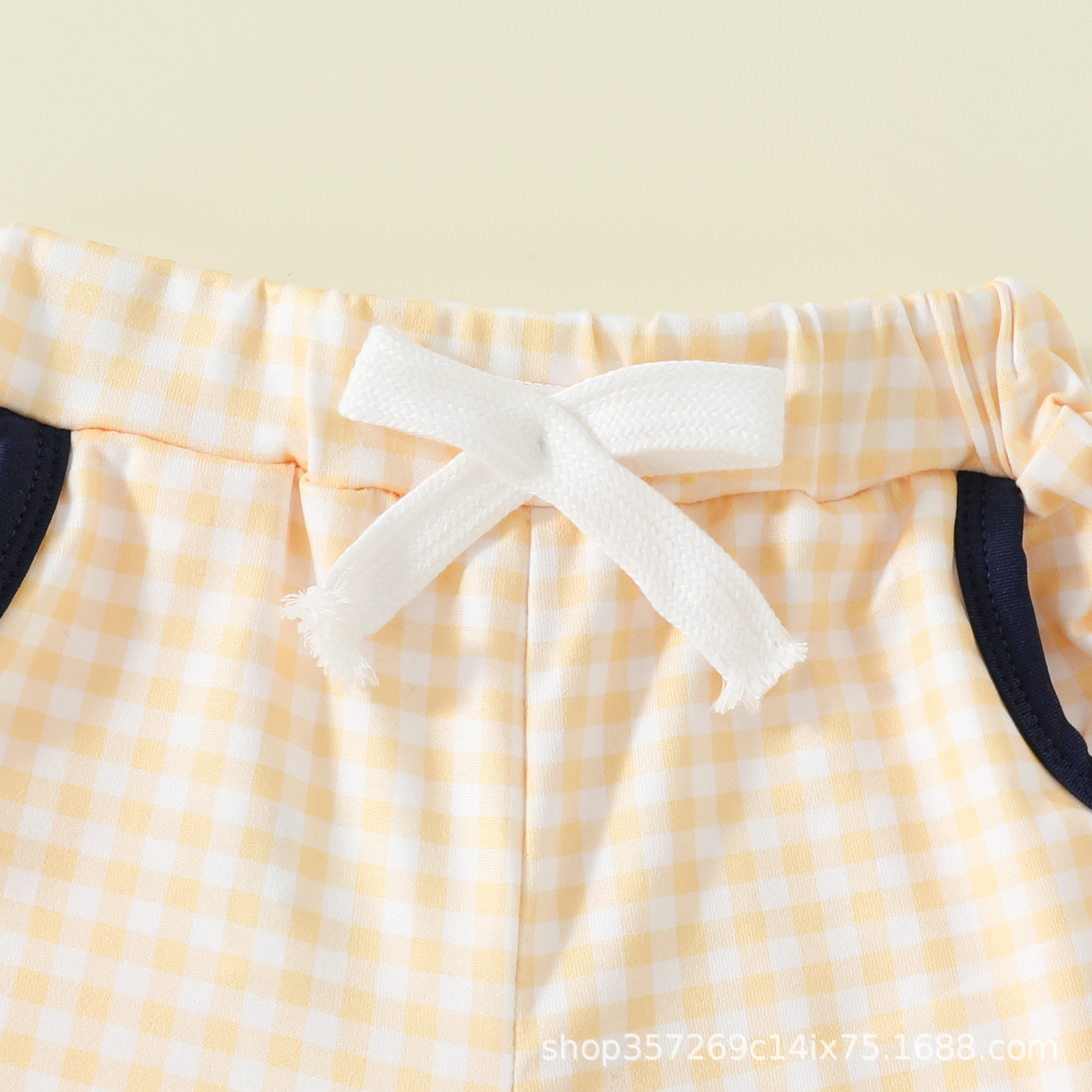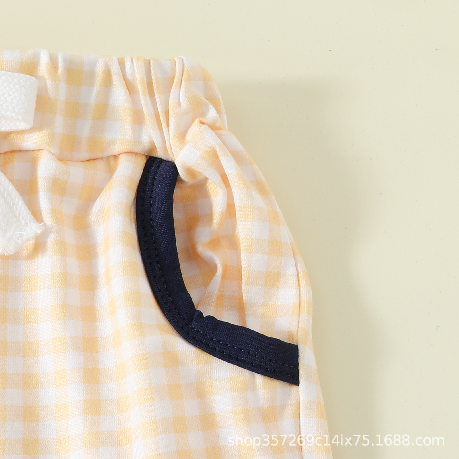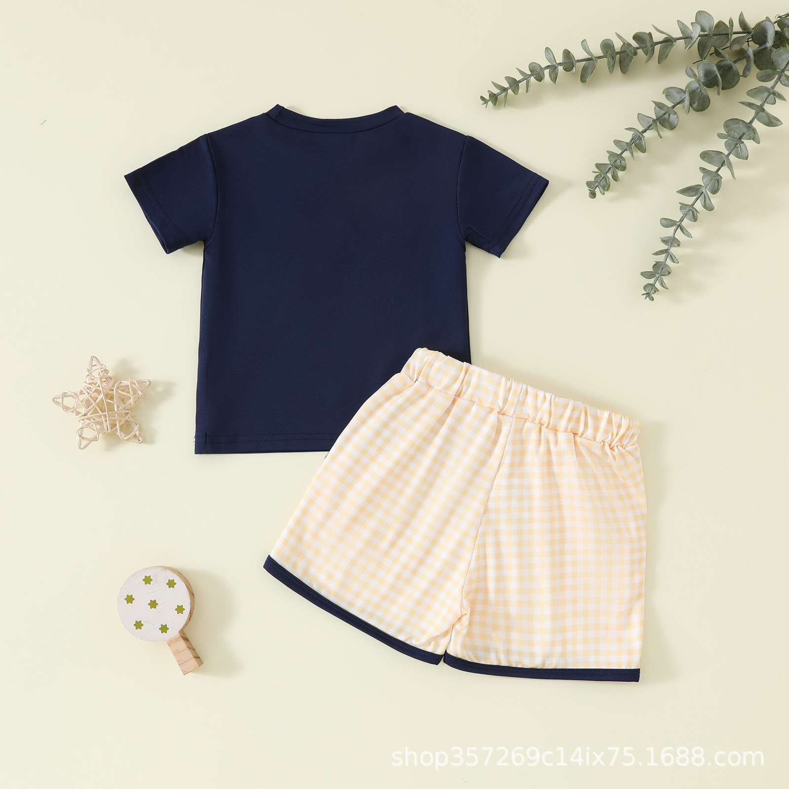 아기 소년 아동복 유럽과 미국의 자수 풀오버 아마존 어린이 여름 패션 둥근 목 단색 짧은 소매 격자 반바지