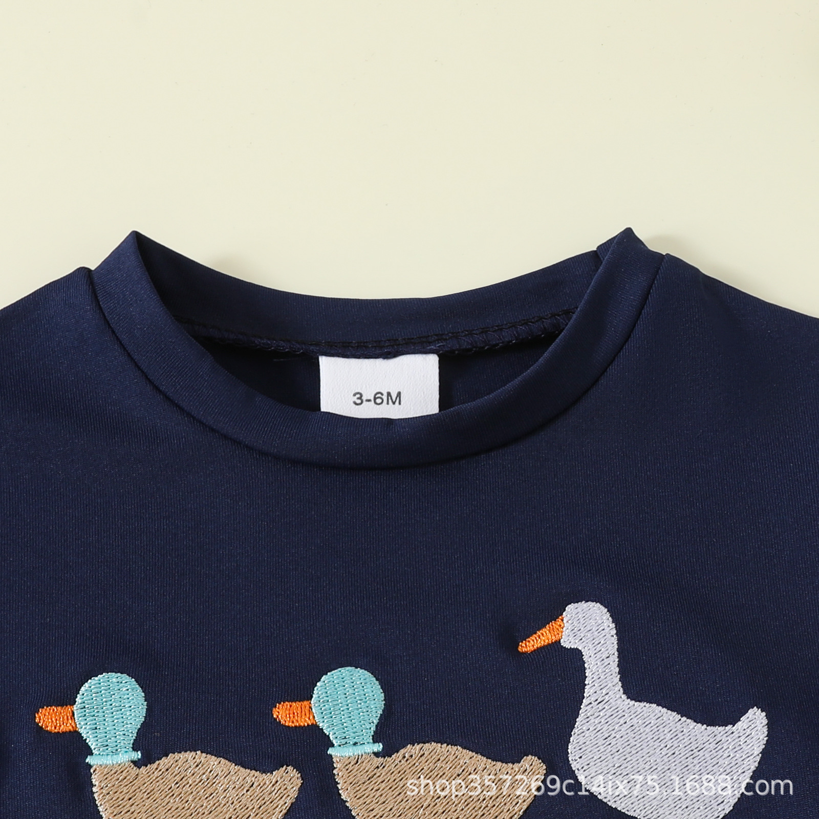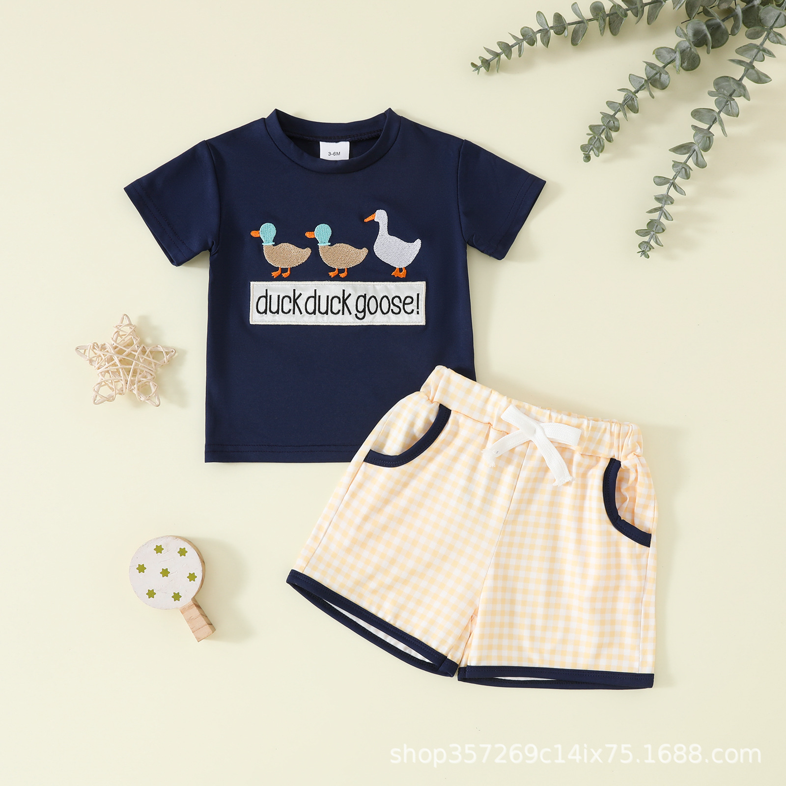 아기 소년 아동복 유럽과 미국의 자수 풀오버 아마존 어린이 여름 패션 둥근 목 단색 짧은 소매 격자 반바지스토어 가기