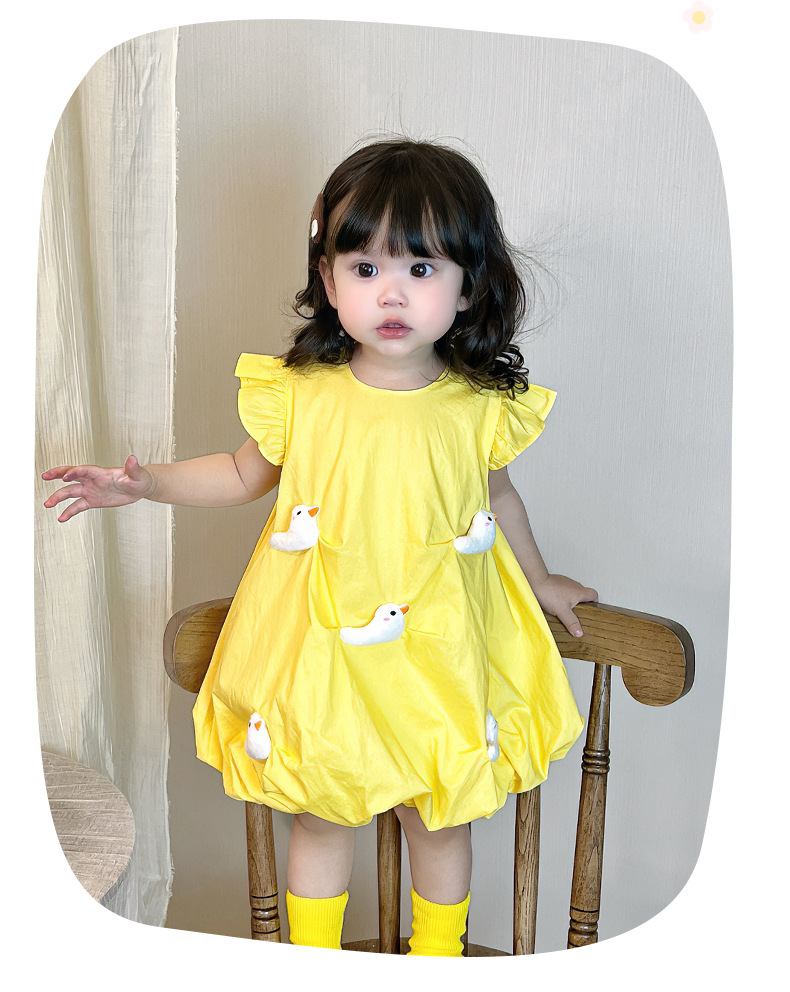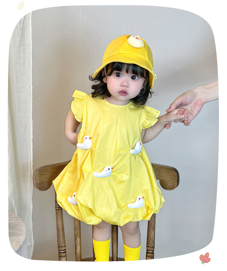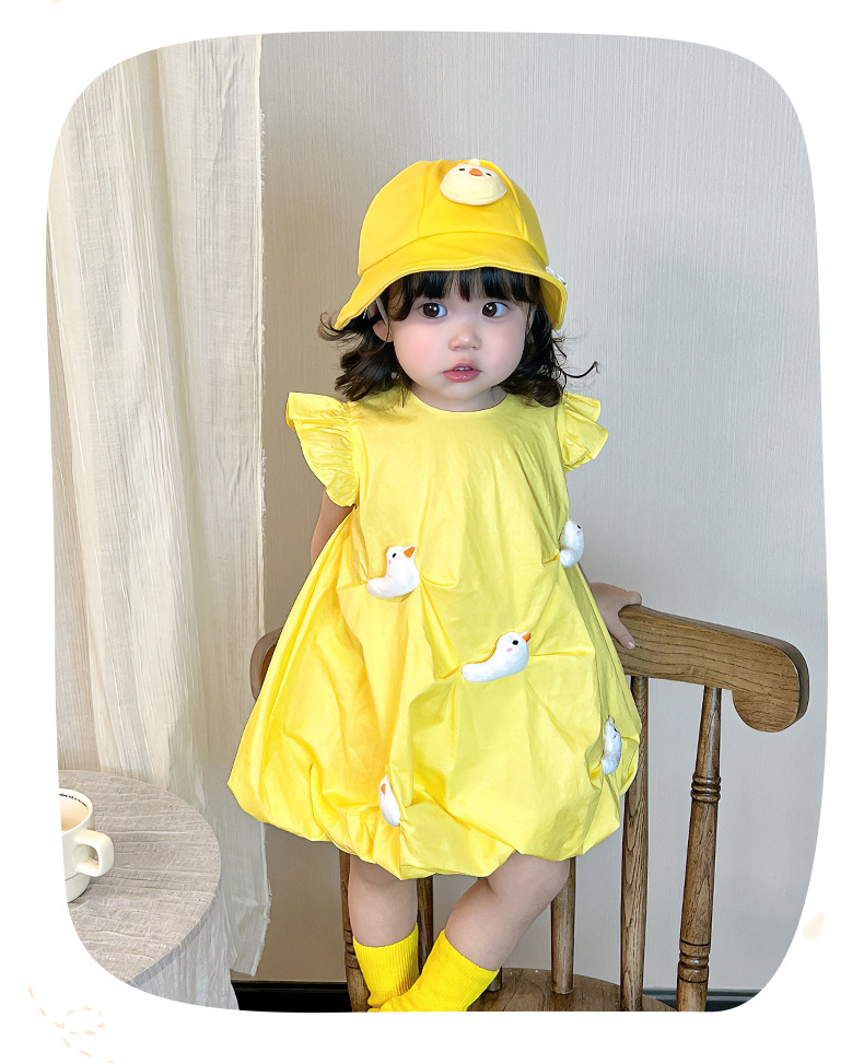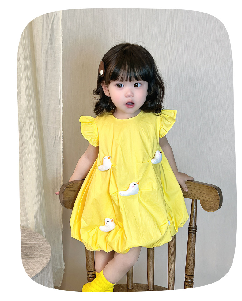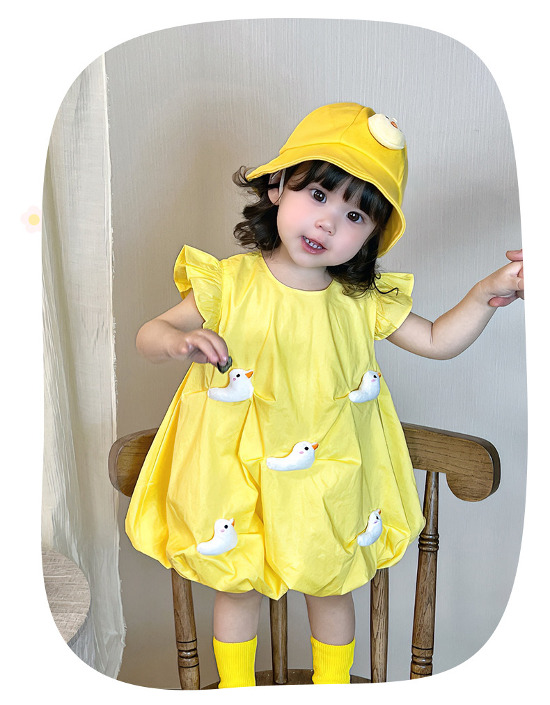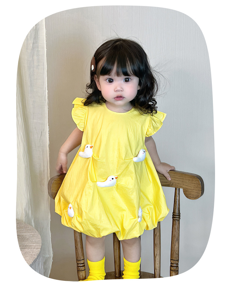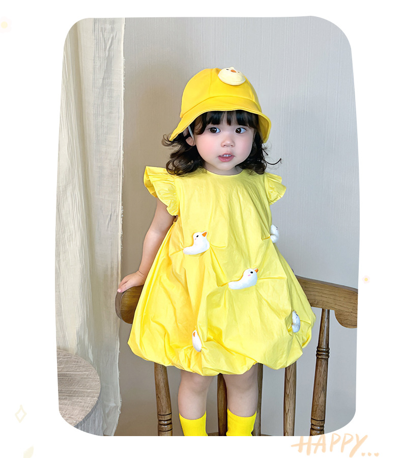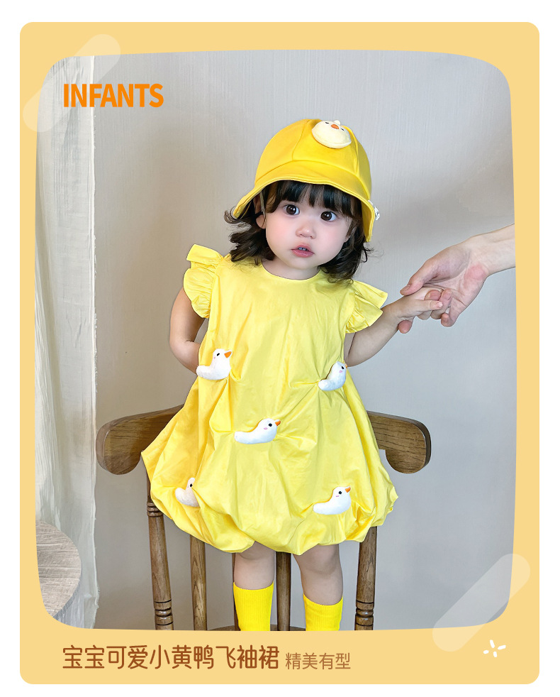 2025 아기 소녀 여름 작은 노란 오리 바지 치마 아기 한국 스타일 원피스 3692 어린이 비행 슬리브 서양식 치마스토어 가기