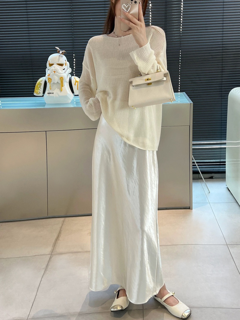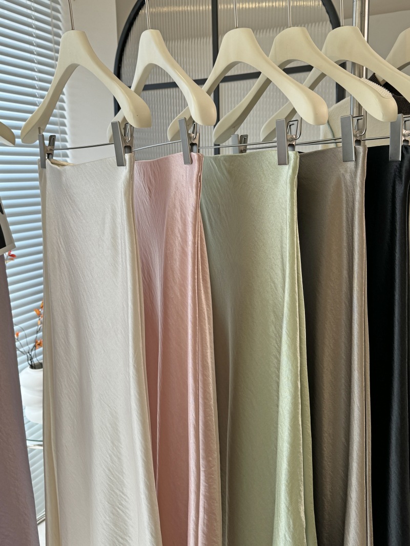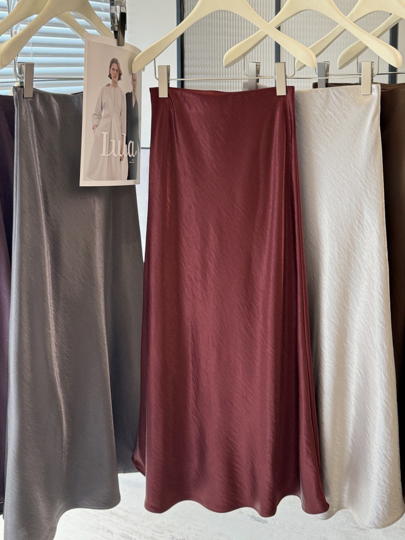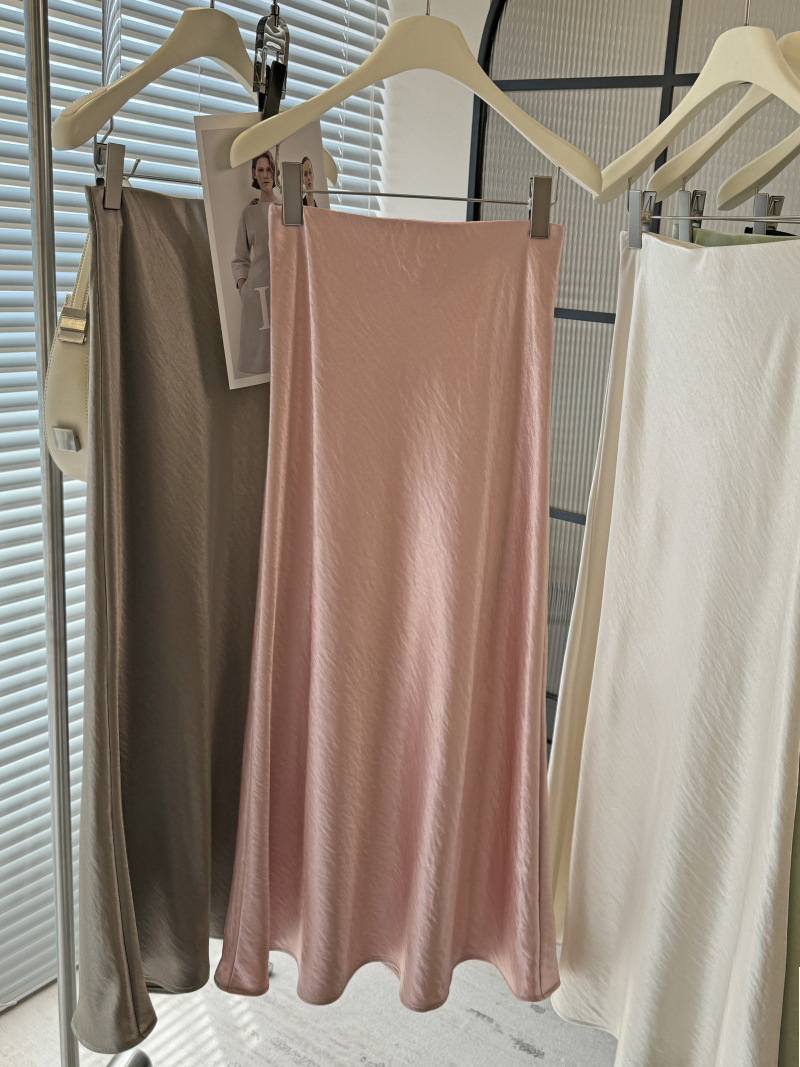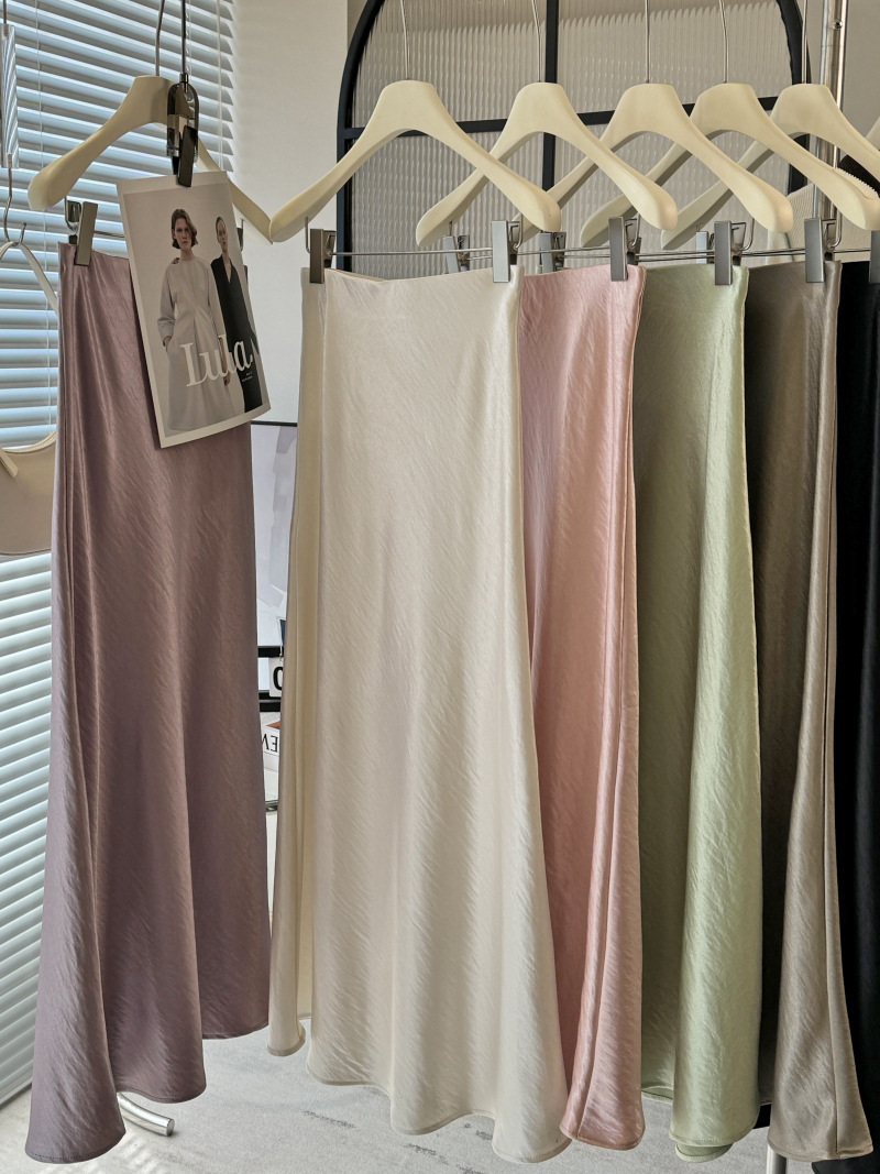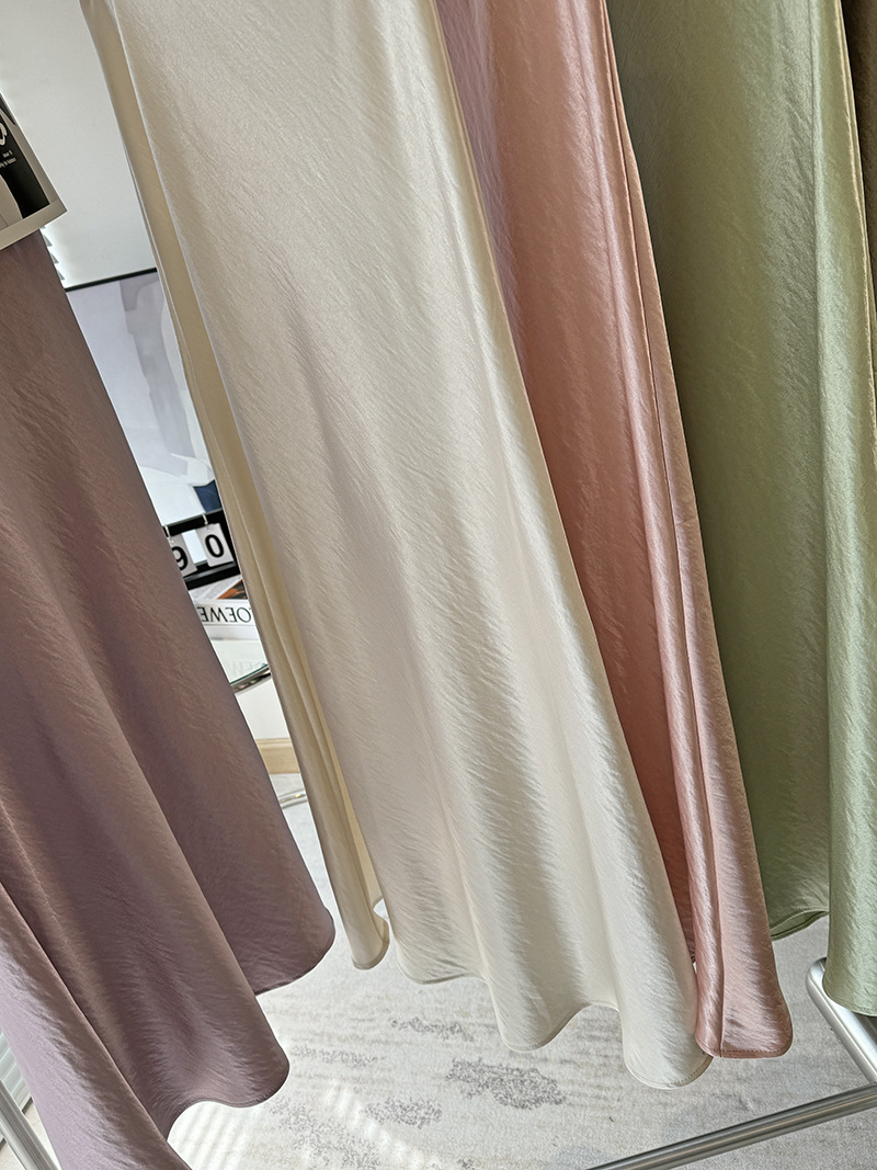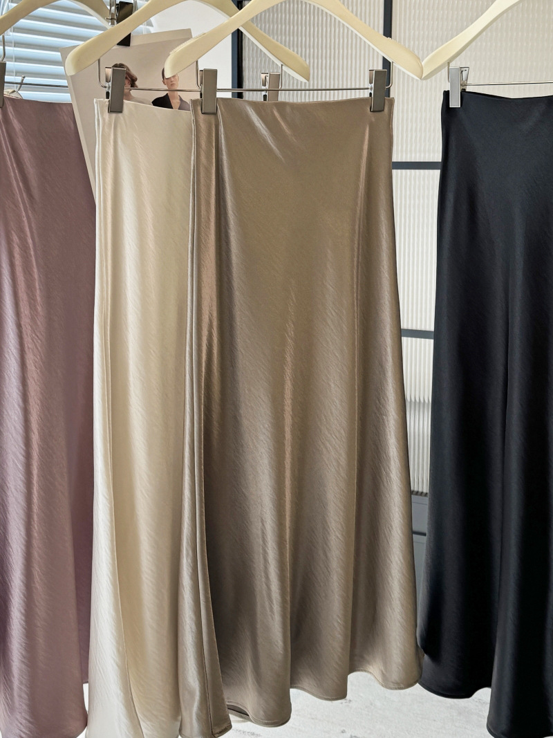 Acetic Acid Satin Fishtail Skirt 여성의 2025 우아한 간단한 유두 슬리밍 엉덩이 A- Line 중간 길이 치마