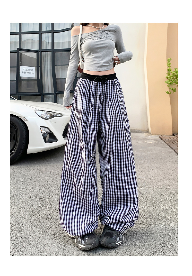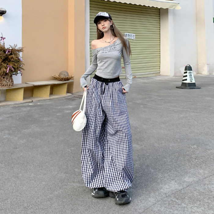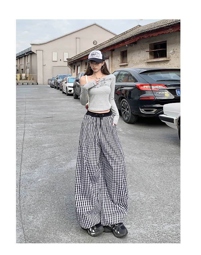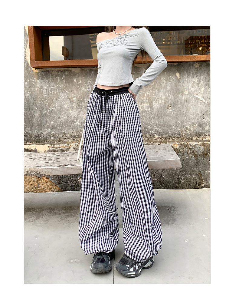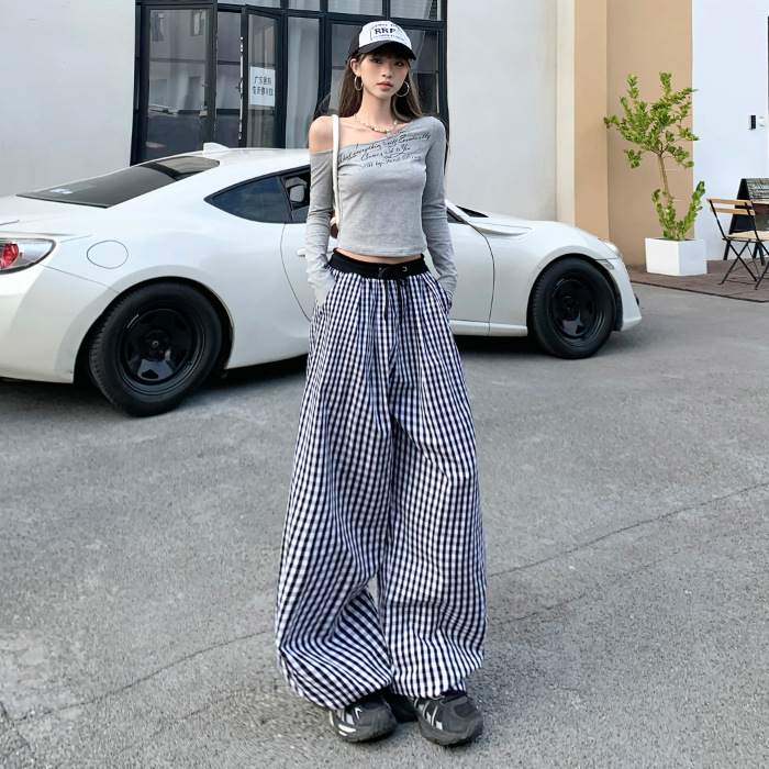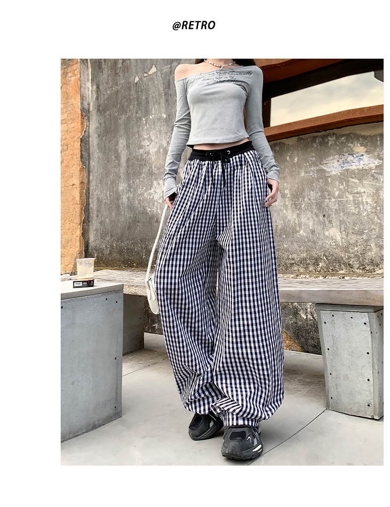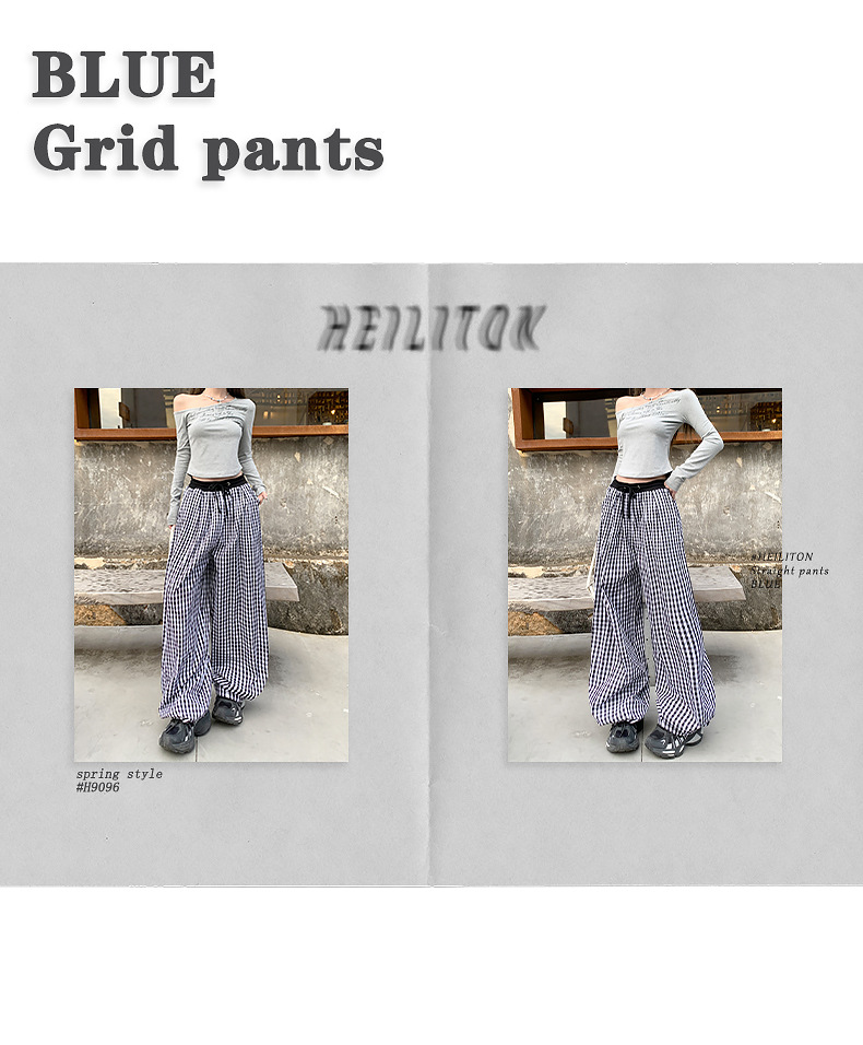 2025 봄 새로운 패션 디자인 바느질 격자 무늬 바지 여성 올매치 캐주얼 연령 감소 슬리밍 와이드 레그 바지
