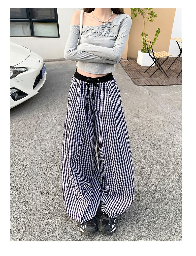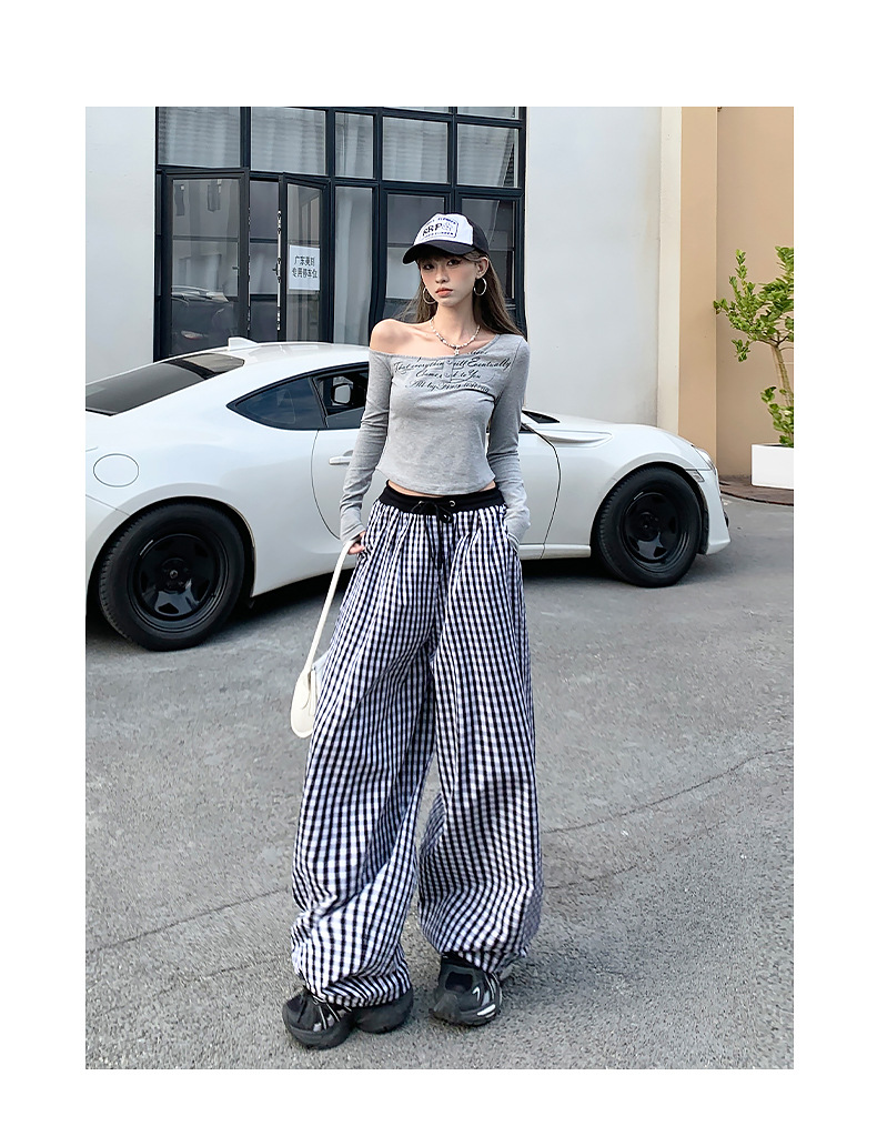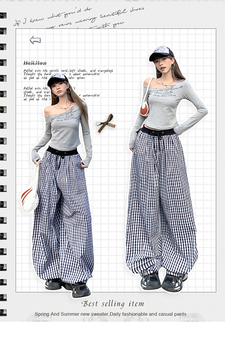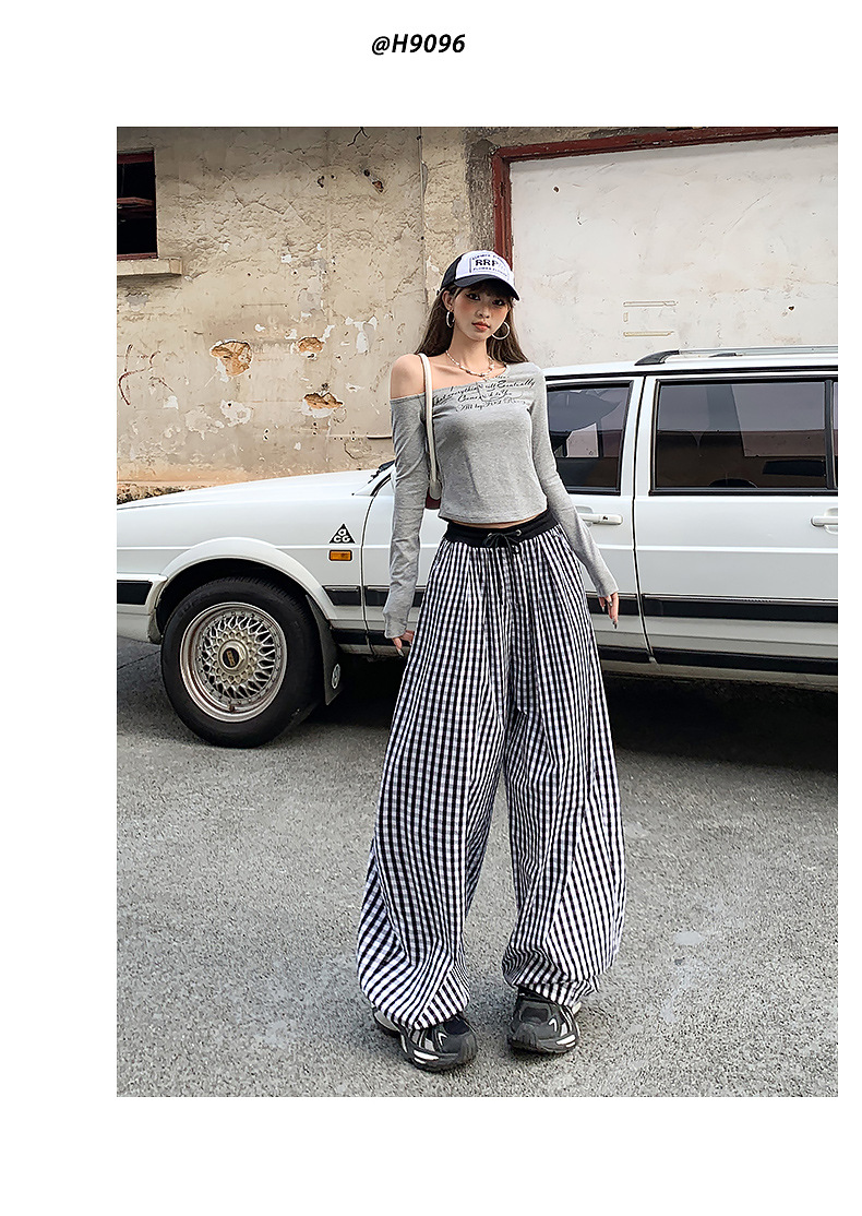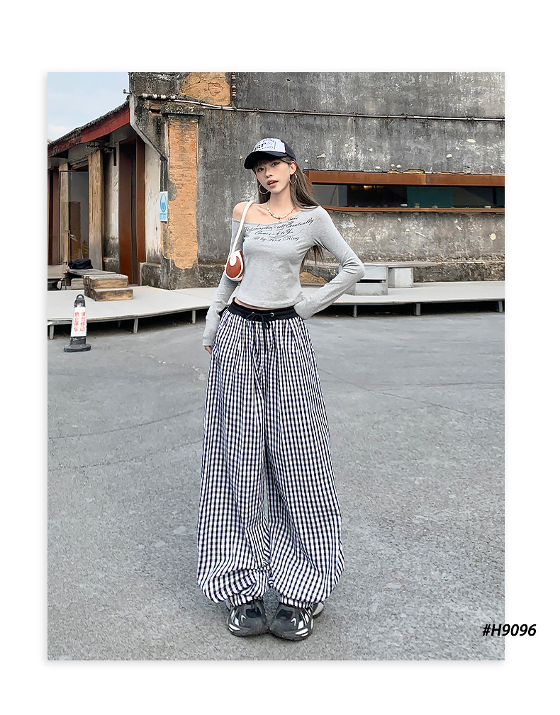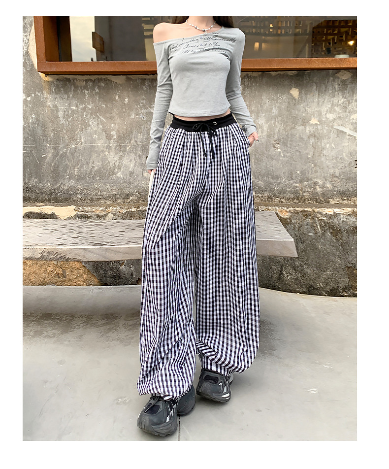 2025 봄 새로운 패션 디자인 바느질 격자 무늬 바지 여성 올매치 캐주얼 연령 감소 슬리밍 와이드 레그 바지