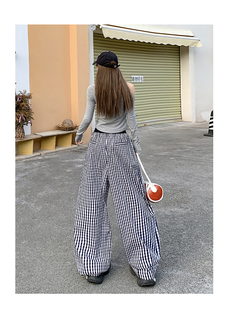 2025 봄 새로운 패션 디자인 바느질 격자 무늬 바지 여성 올매치 캐주얼 연령 감소 슬리밍 와이드 레그 바지스토어 가기