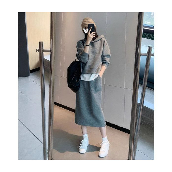 플러스 사이즈 여성의 초가을 캐주얼 패션 투피스 후드 스웨터 스커트 세트 지방 mm200 kg 300스토어 가기
