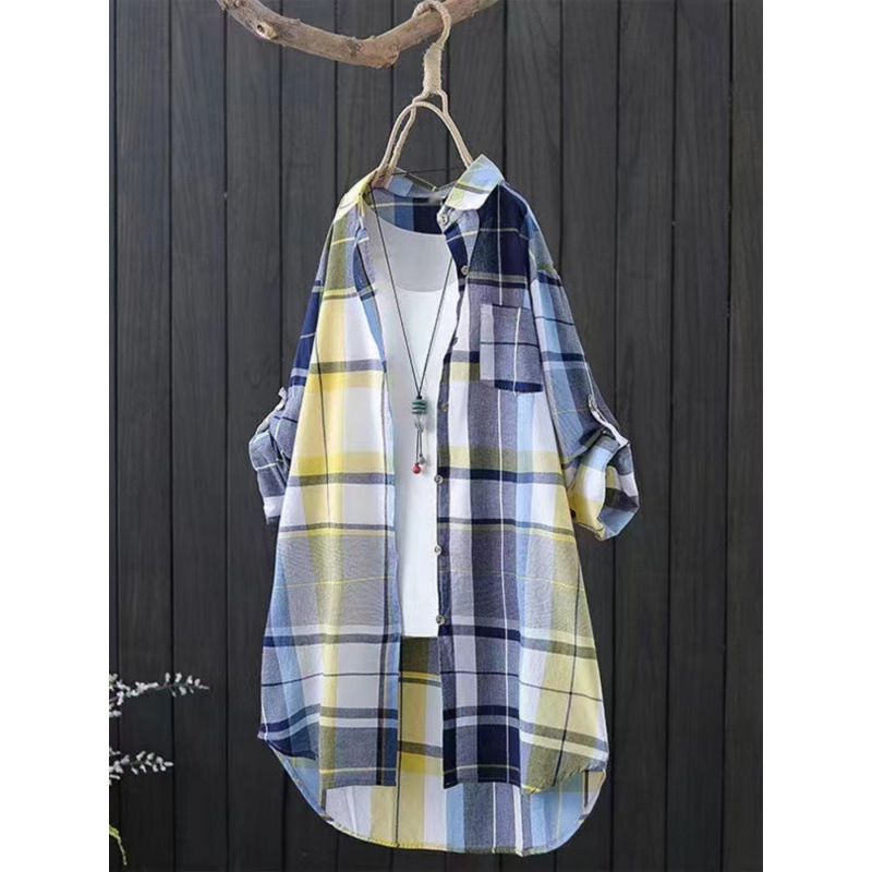 유럽과 미국의 플러스 사이즈 격자 무늬 셔츠 여자의 2024 긴팔 레트로 탑 느슨한 올매치 슬리밍 화려한 셔츠 카디건