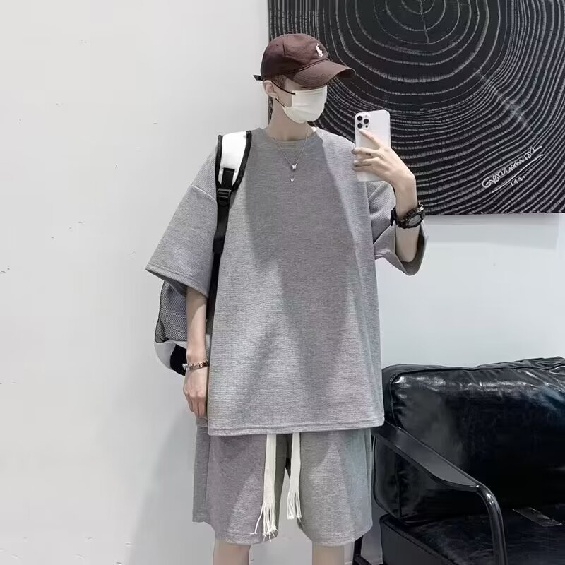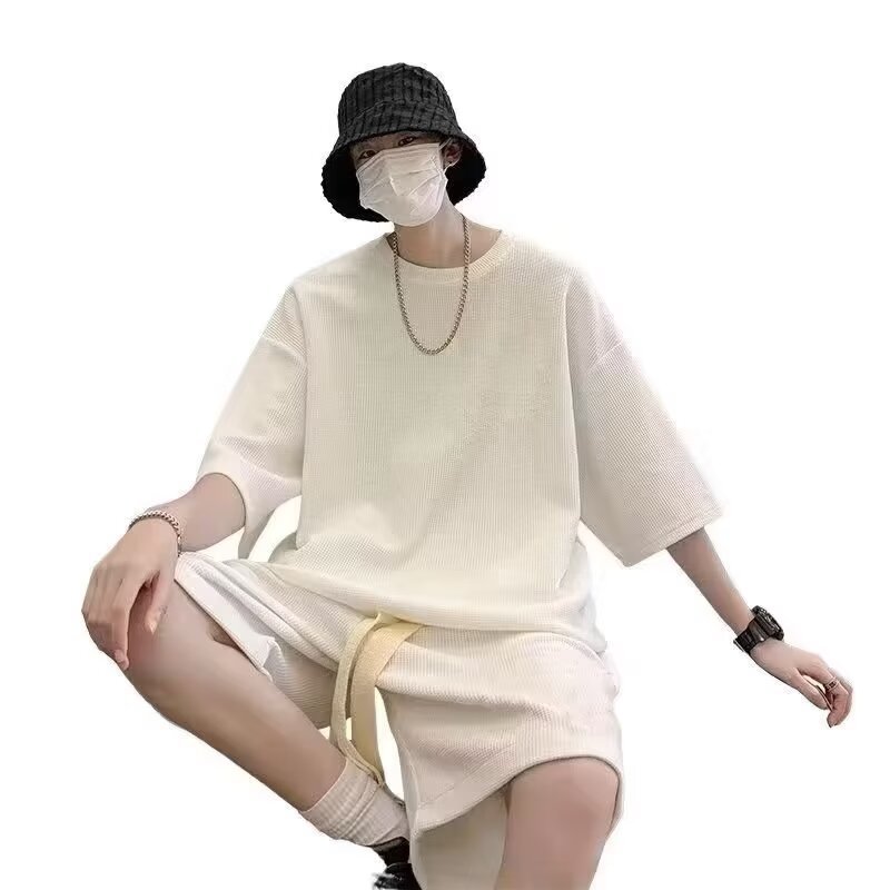 와플 세트 남자 반소매 반바지 세트 여름 느슨한 올매치 플러스 사이즈 뚱뚱한 잘 생긴 캐주얼 스포츠 세트
