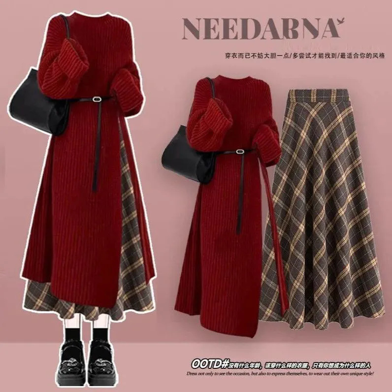 2024 크리스마스 붉은 가을과 겨울 여성의 하이 엔드 감각 게으른 스타일 니트 스웨터 슬리밍 격자 무늬 스커트 투피스 세트스토어 가기