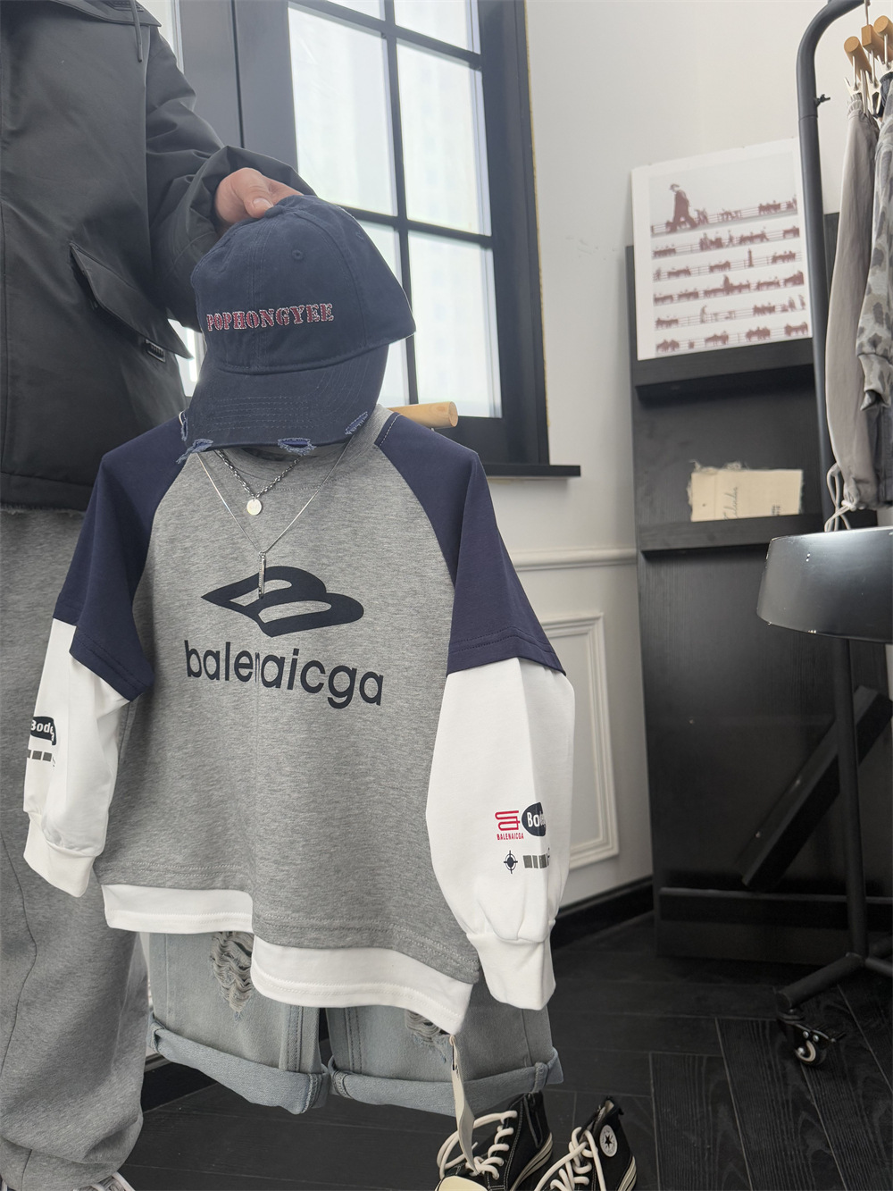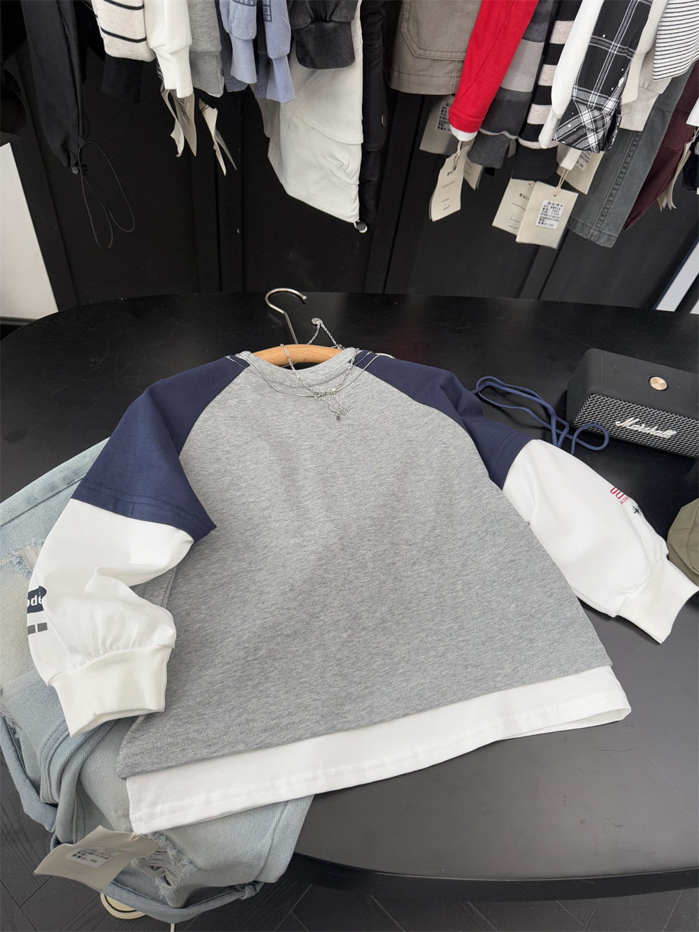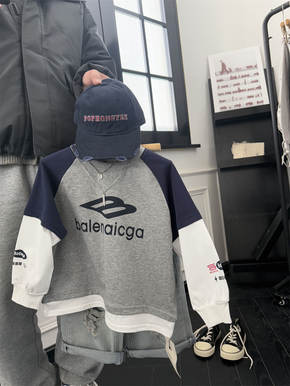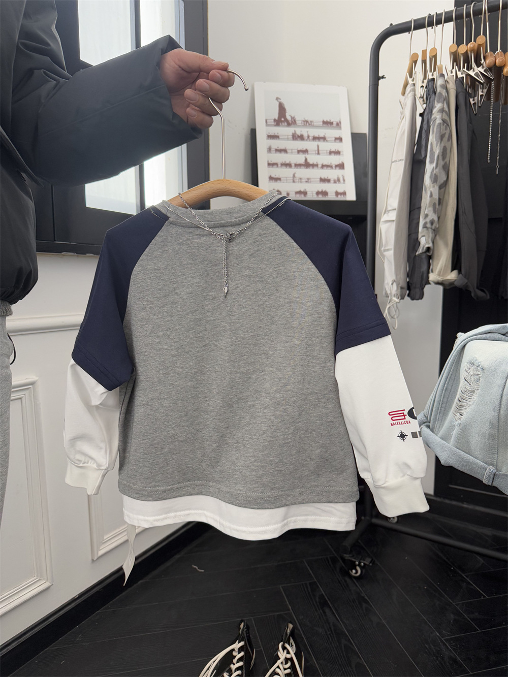 봄 아메리칸 스타일 컬러 대비 가짜 2 피스 라운드 넥 긴팔 티셔츠 어린이 컬러 블록 인쇄 편지 탑스토어 가기