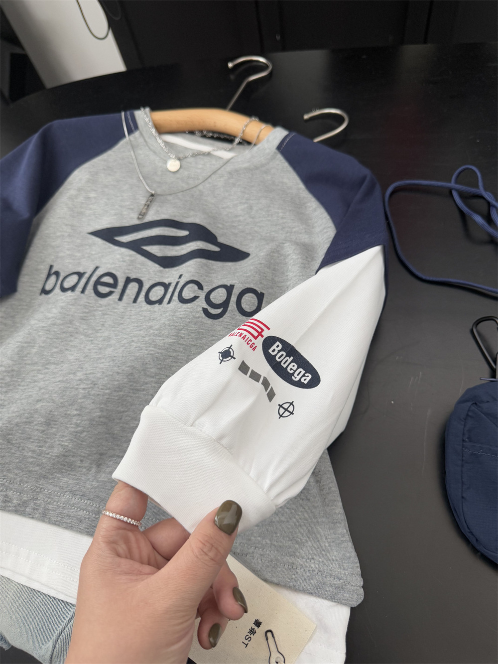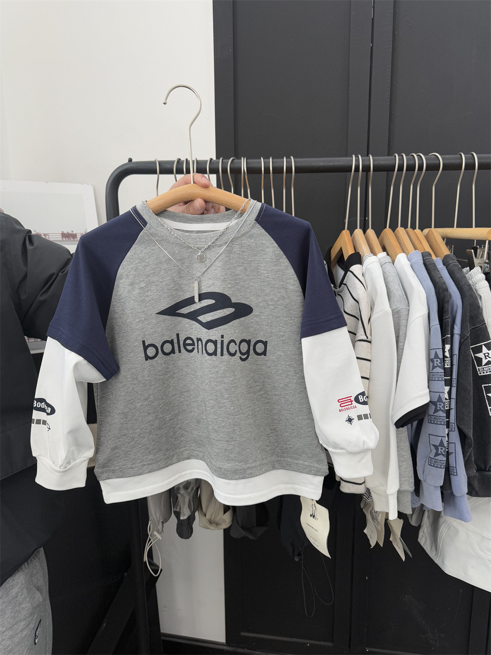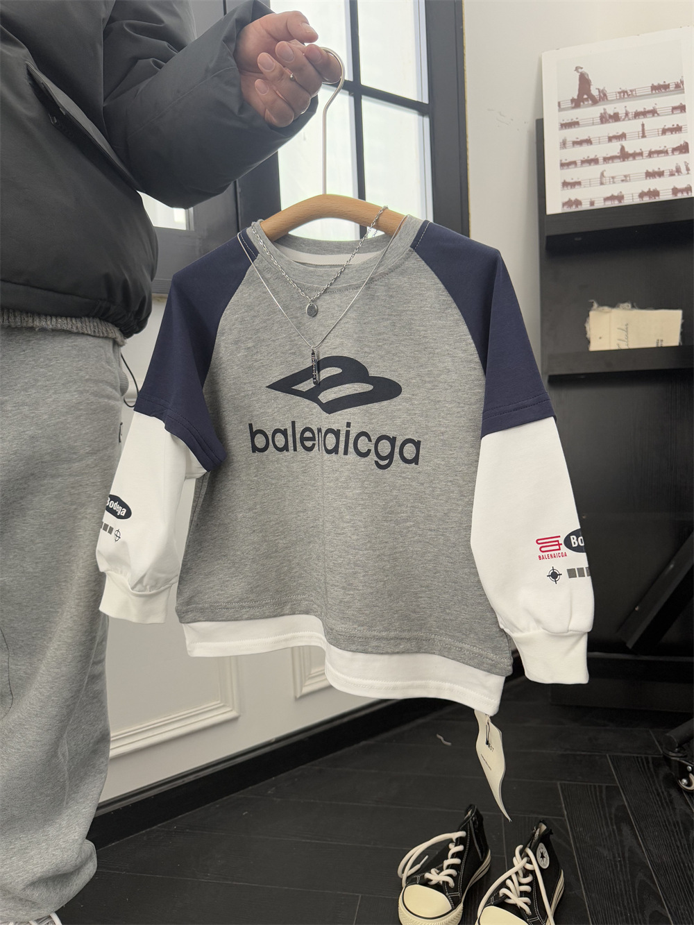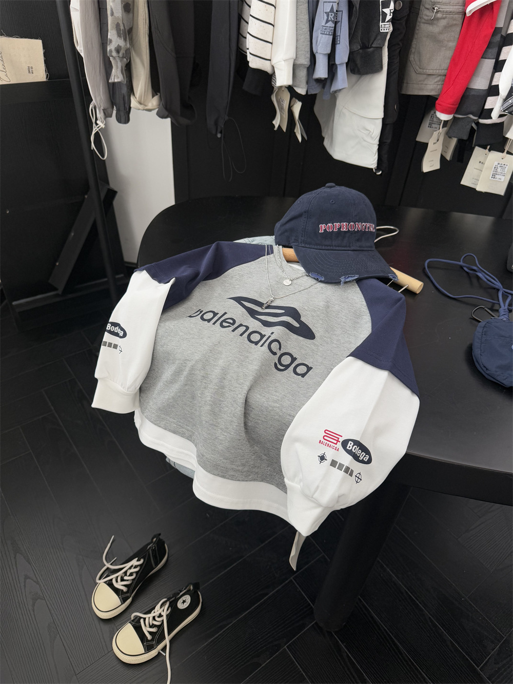 봄 아메리칸 스타일 컬러 대비 가짜 2 피스 라운드 넥 긴팔 티셔츠 어린이 컬러 블록 인쇄 편지 탑스토어 가기