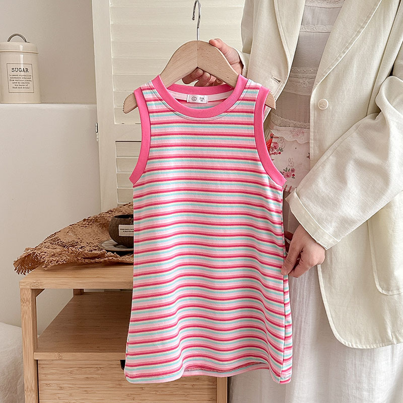 여자 조끼 치마 여름 2025 새로운 스타일 어린이 줄무늬 바닥 치마 어린 소녀 한국 민소매 원피스
