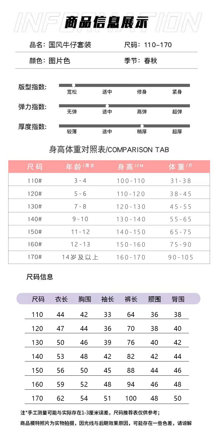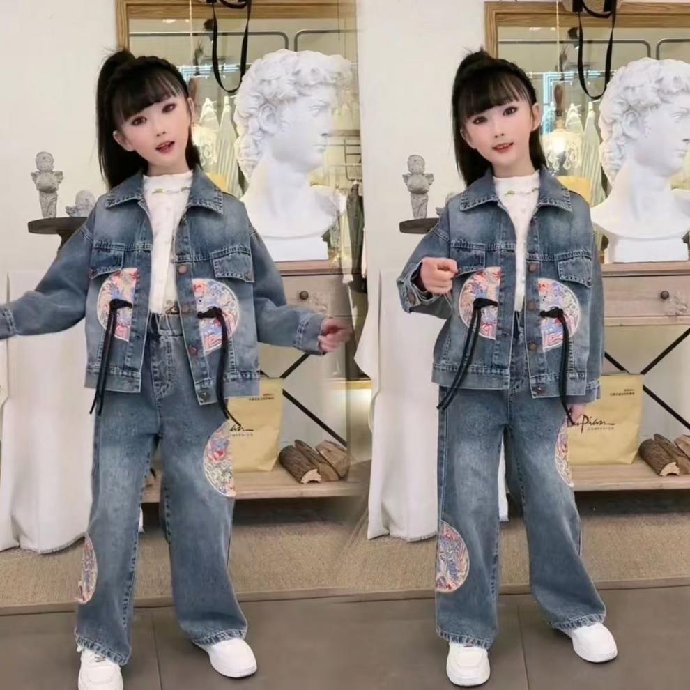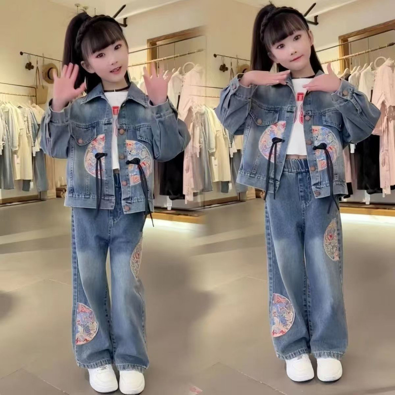 소녀의 가을 원피스 국가 스타일 세트 2024 새로운 CUHK 어린이 데님 세련된 투피스 빈티지 중국 스타일 봄과 가을 스타일스토어 가기
