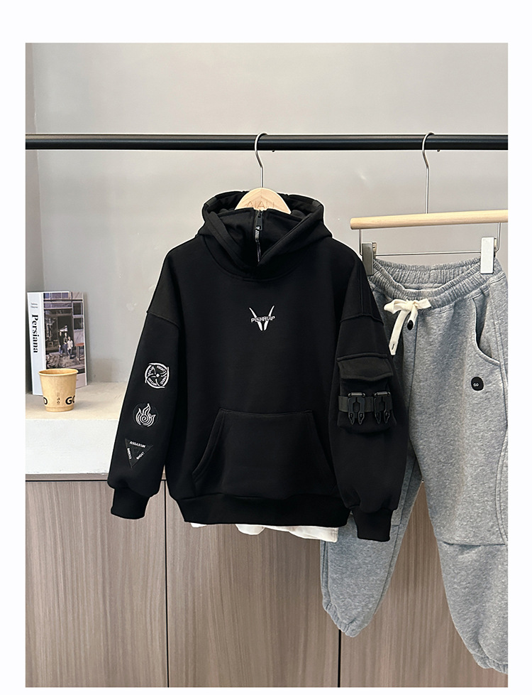 소년 기모 운동복 가을과 겨울 새로운 어린이 잘 생긴 작업 코트 중 및 대형 어린이 의류 학생 트렌디 후드 탑