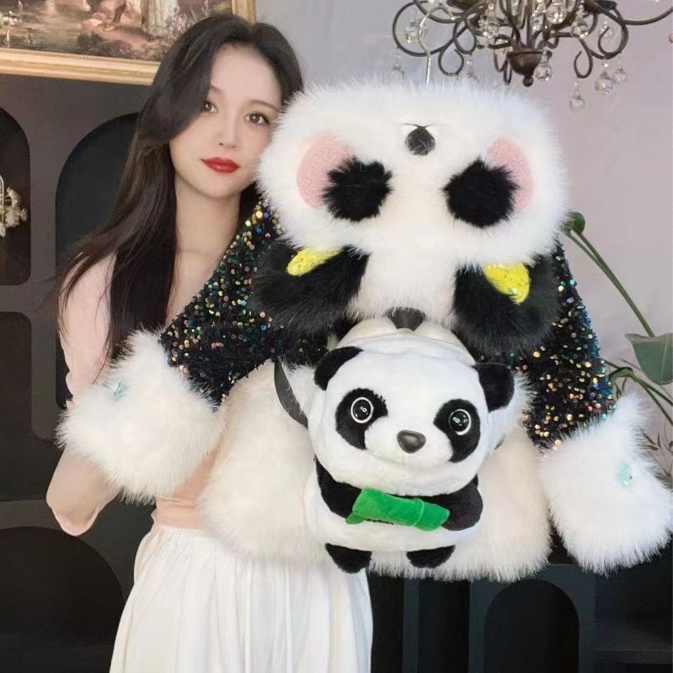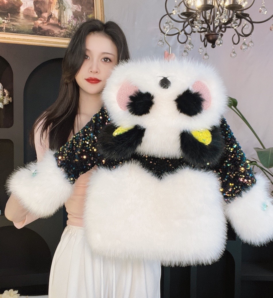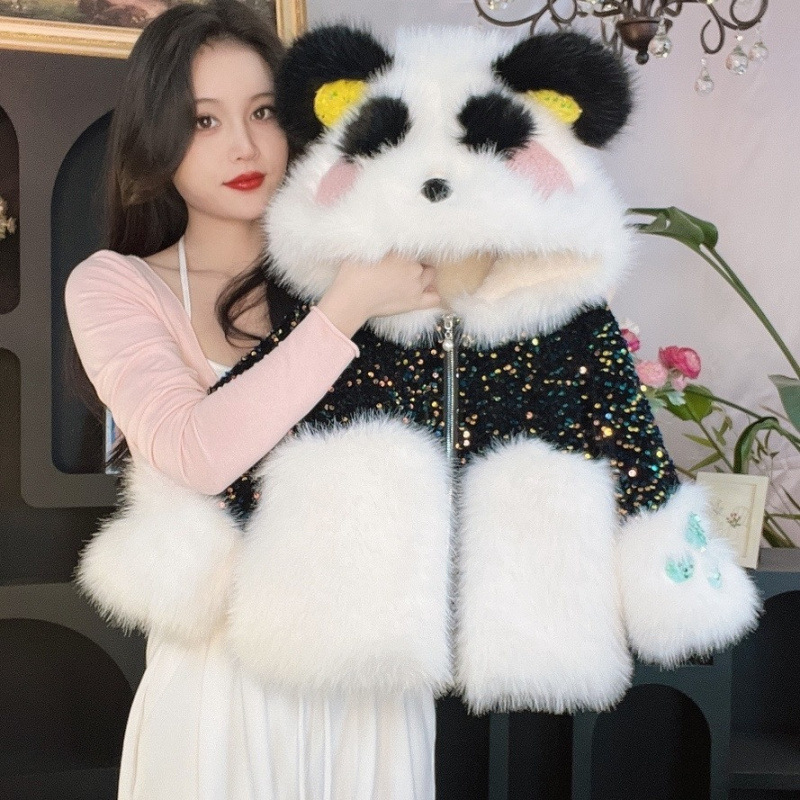 여자를위한 푹신한 코트 두꺼운 겨울 가짜 모피 만화 후드 팬더 옷스토어 가기