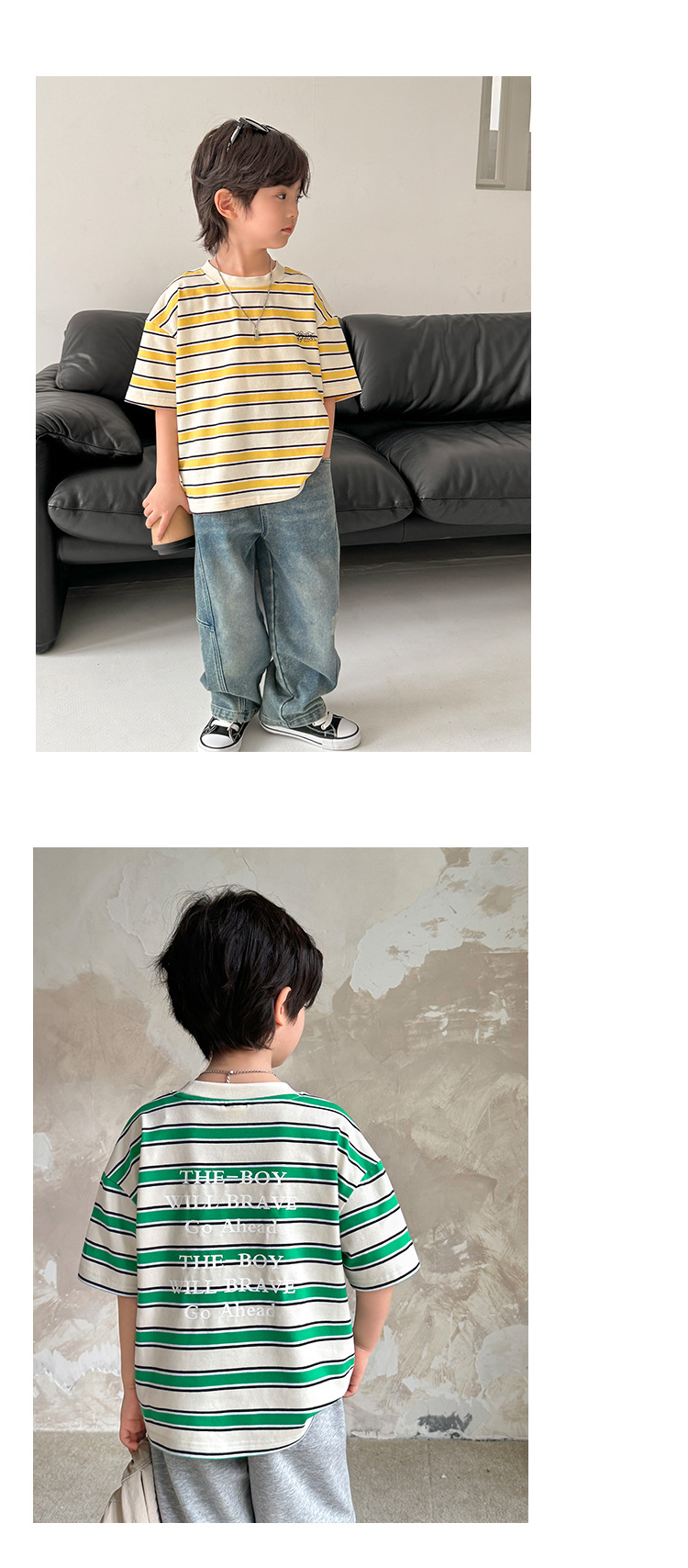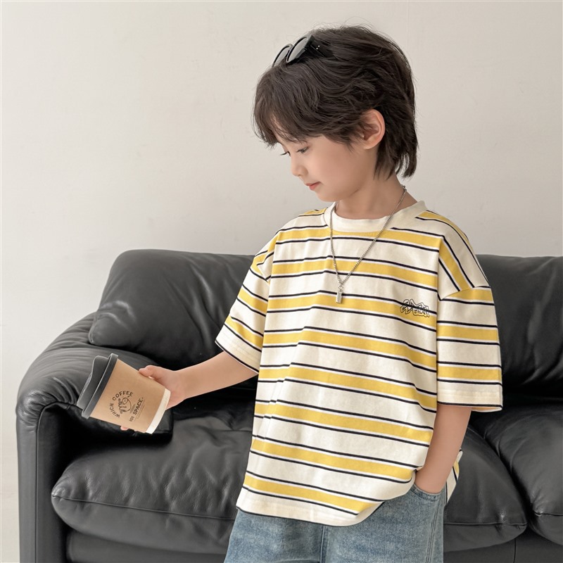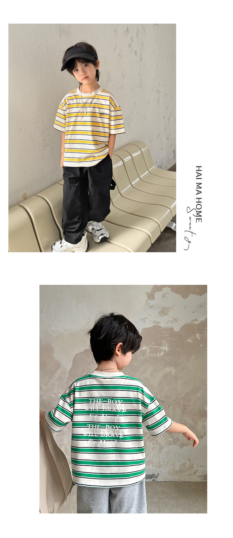 Haima Home 2025 여름 새 소년 줄무늬 면 반팔 티셔츠 소녀 여름 옷 반소매 중대형 어린이