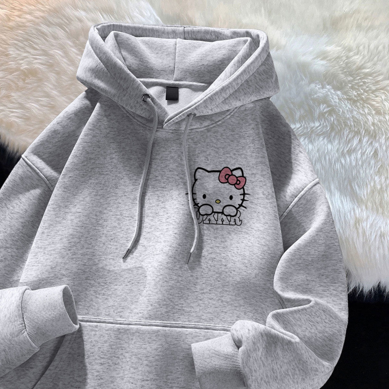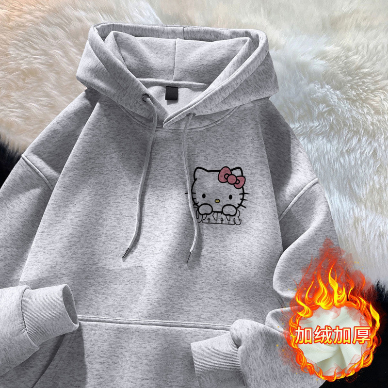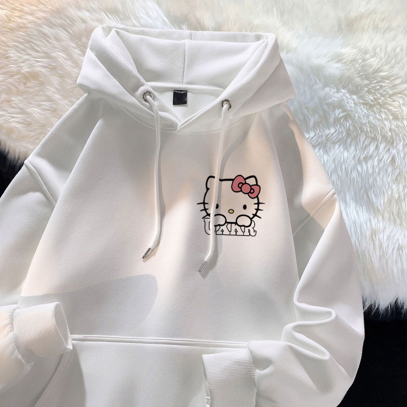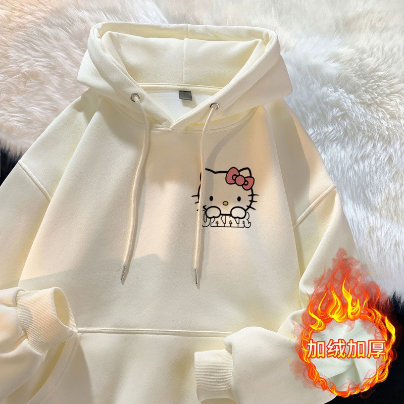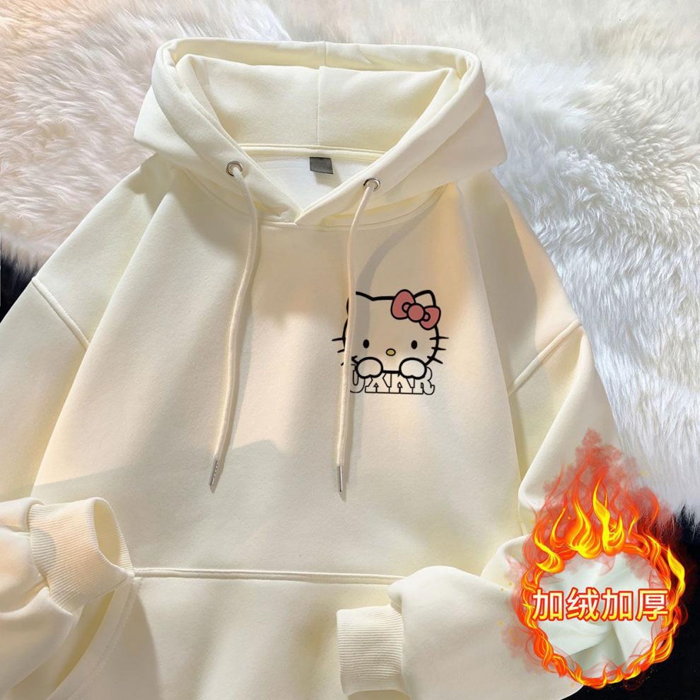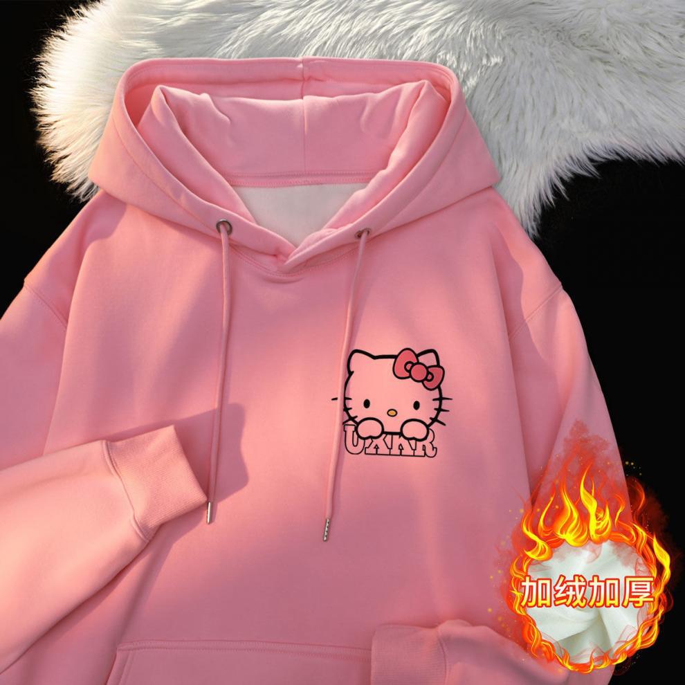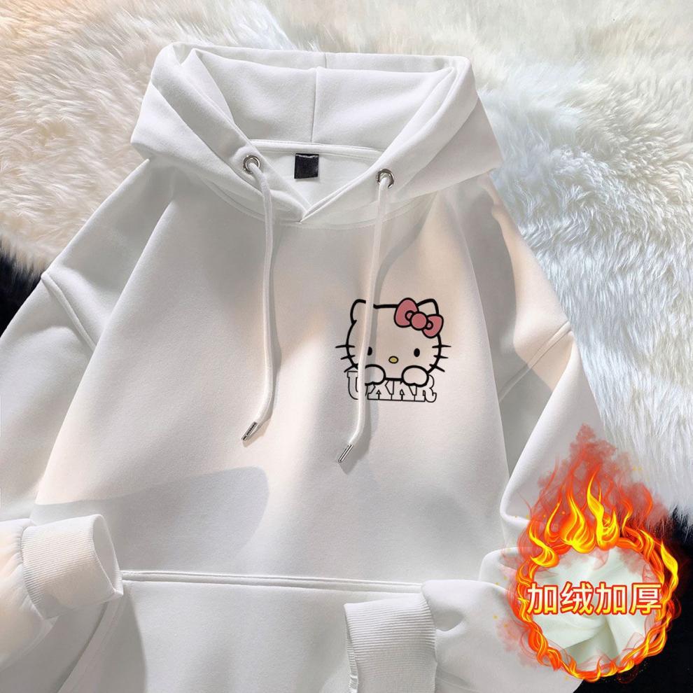 가을과 겨울 소녀 만화 스타일리시 학생 한국식 후드 스웨트 헬로 키티 인쇄 중대형 어린이를위한 느슨한 기모 탑스토어 가기