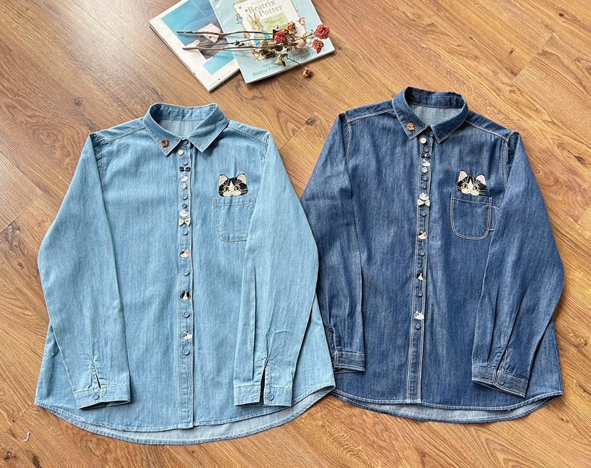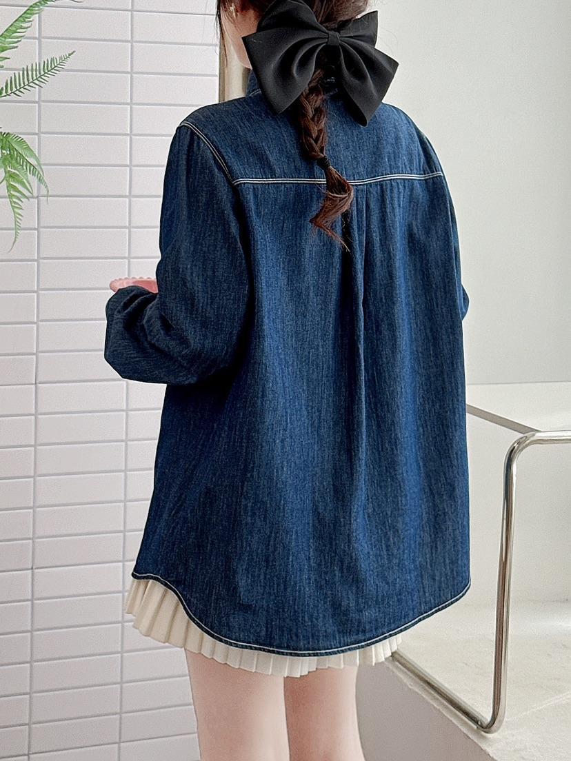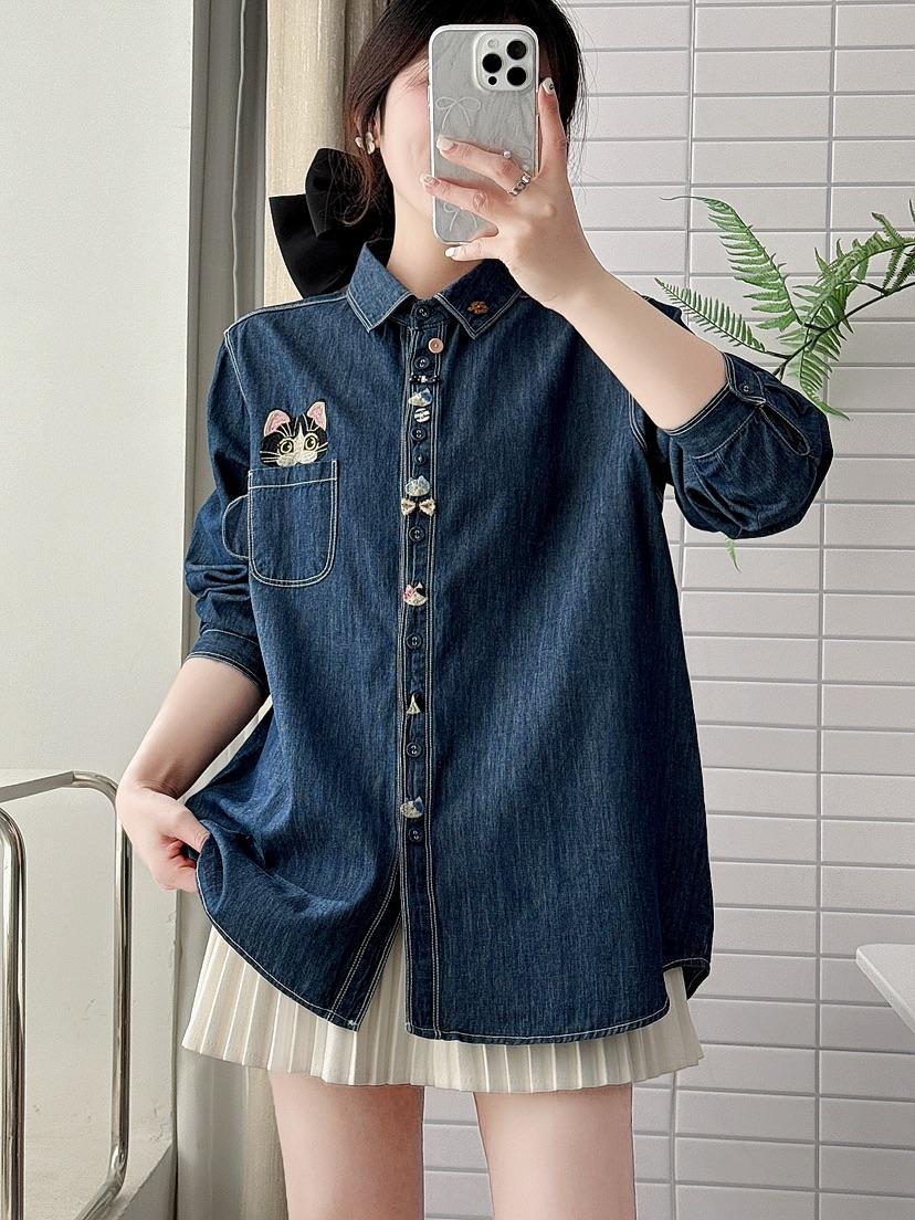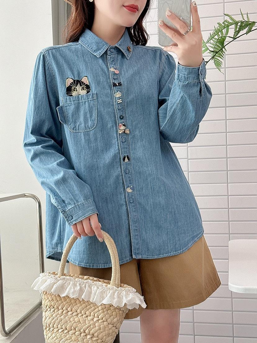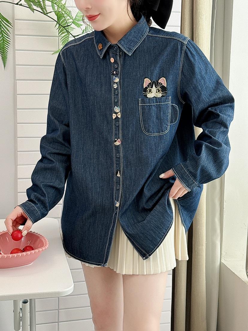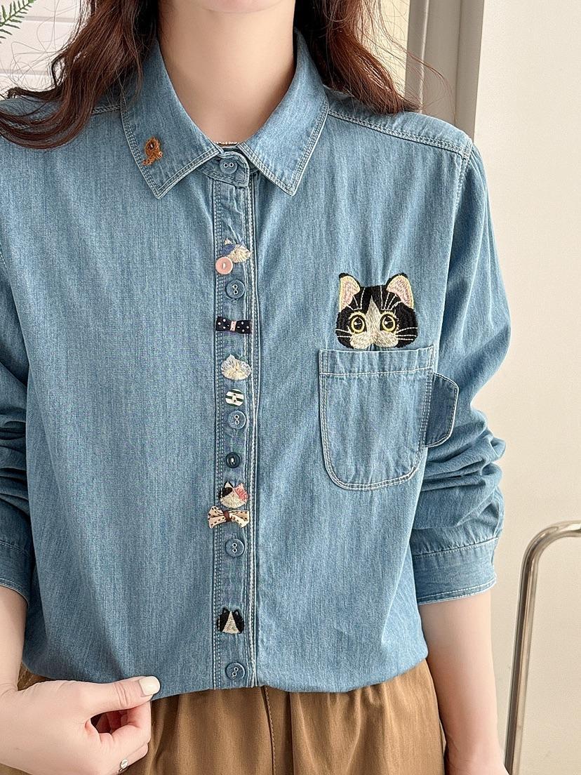 데님 긴 소매 셔츠 여성용 2025 봄 새로운 일본 대학 스타일 느슨한 탑 자수 포켓 고양이 라켓