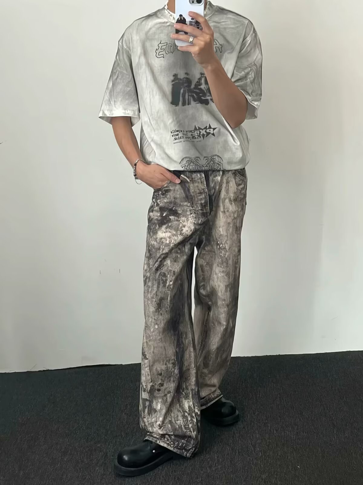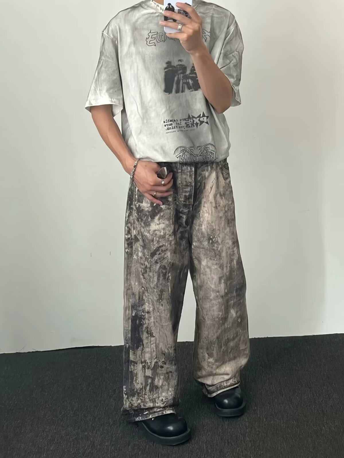 새로운 3D 디지털 위장 스플래시 잉크 인쇄 오래된 낮은 허리 넓은 다리 데님 바지 남성 및 면화 세대