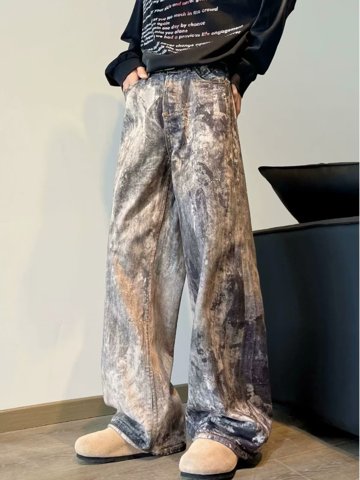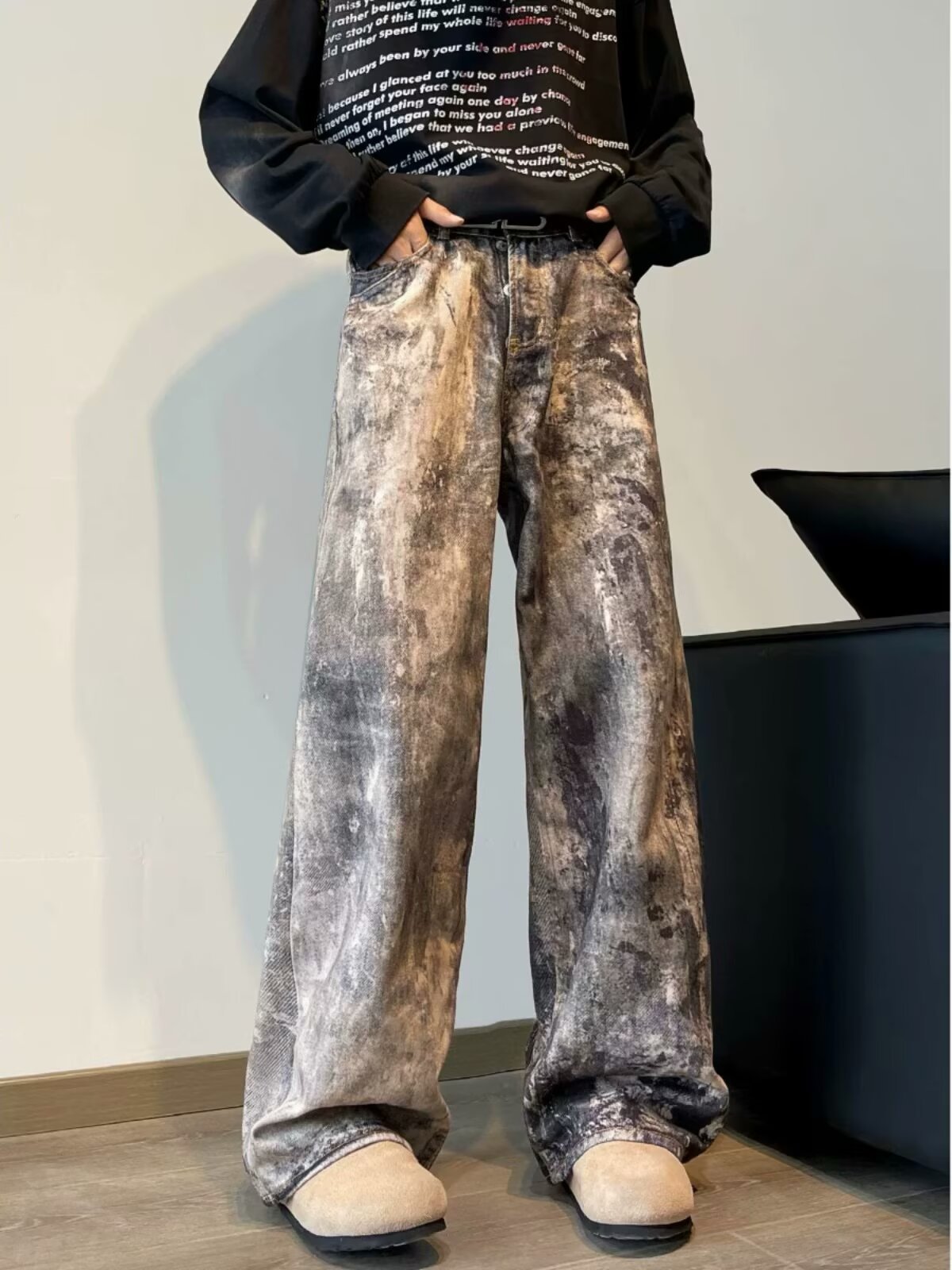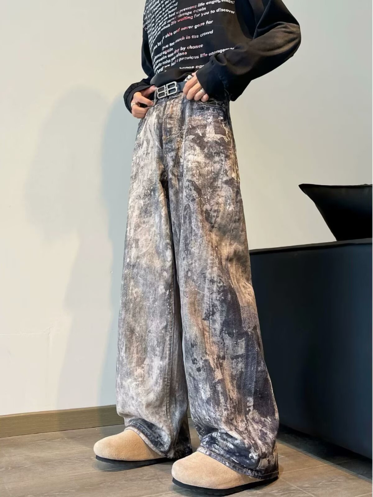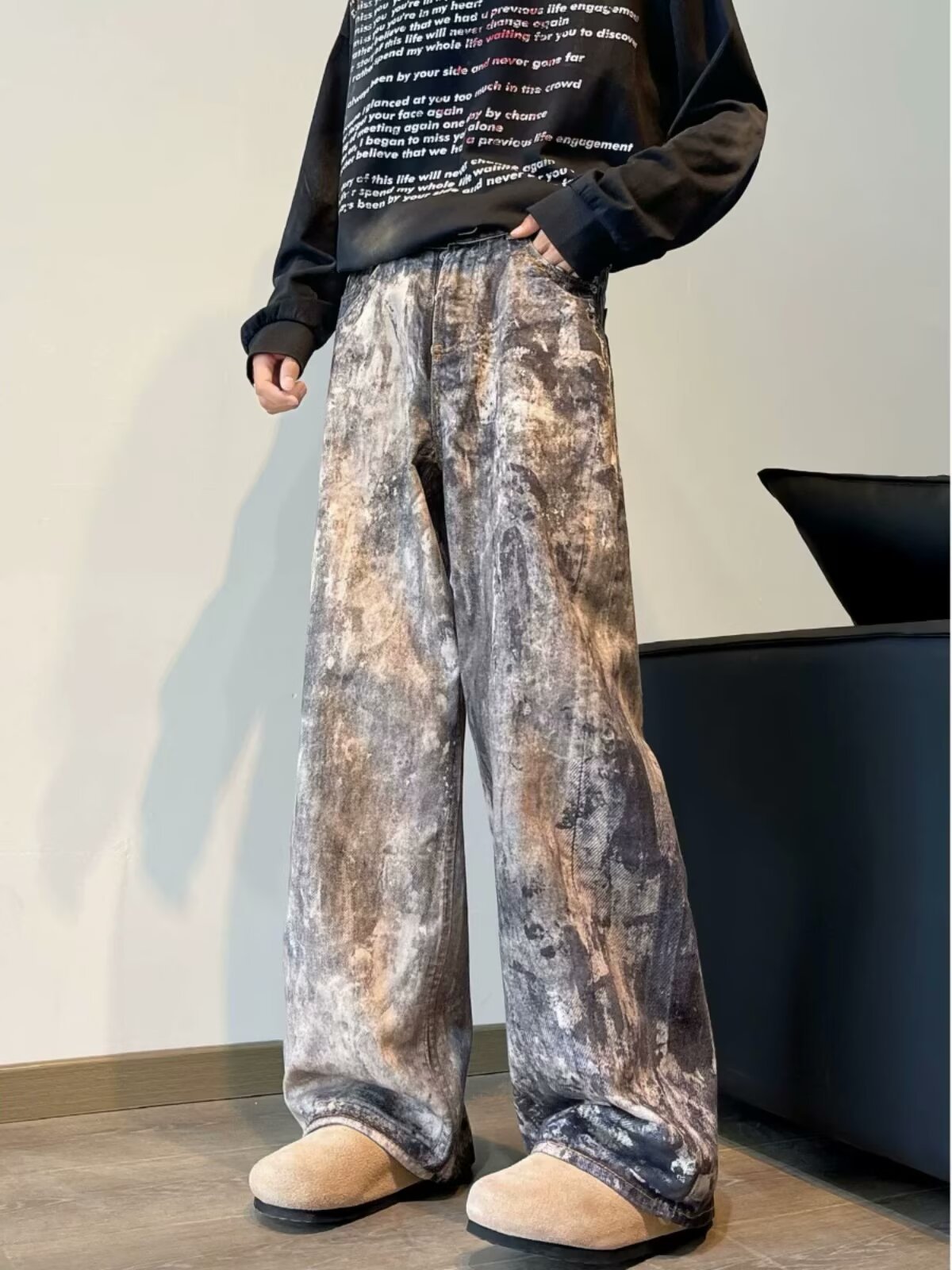새로운 3D 디지털 위장 스플래시 잉크 인쇄 오래된 낮은 허리 넓은 다리 데님 바지 남성 및 면화 세대스토어 가기