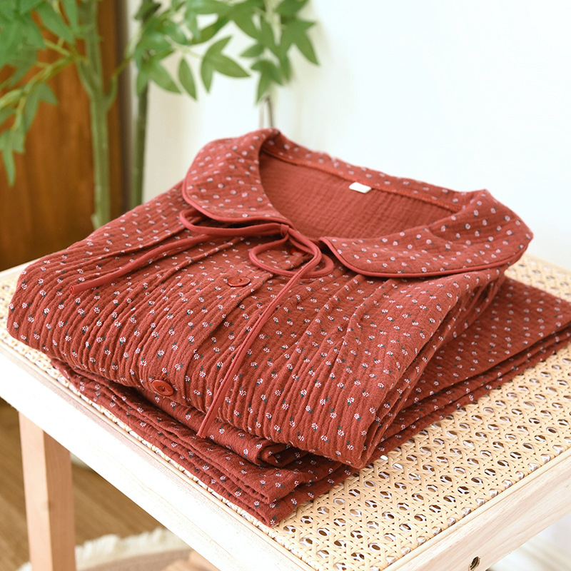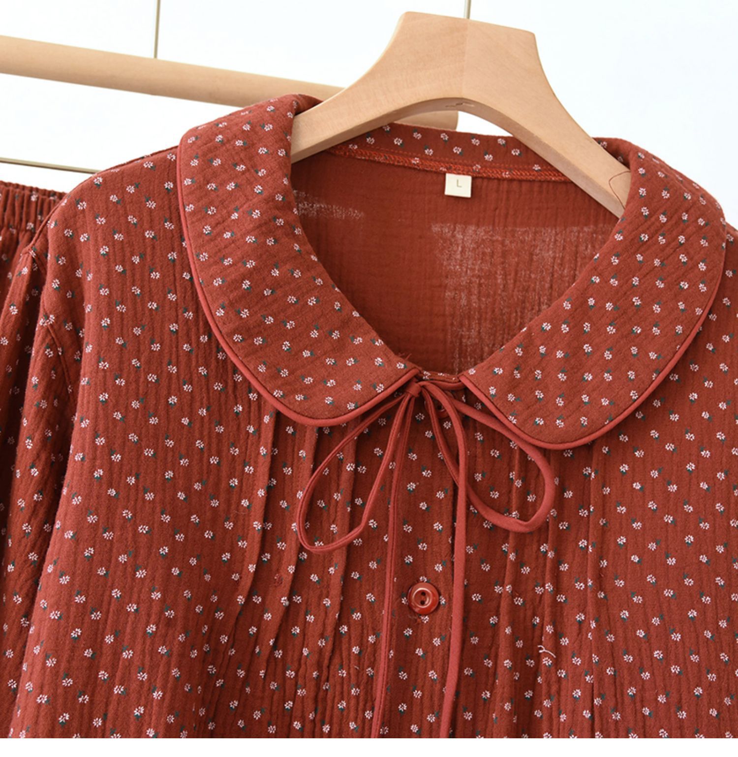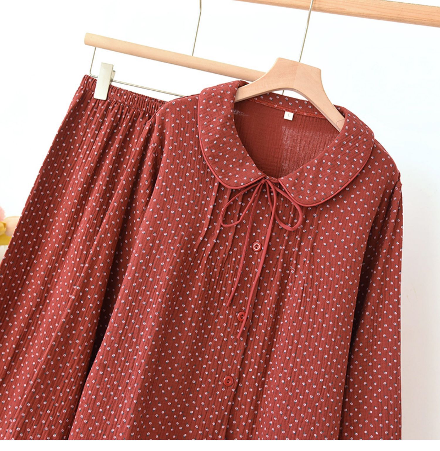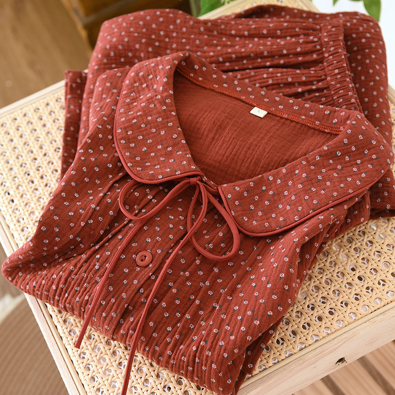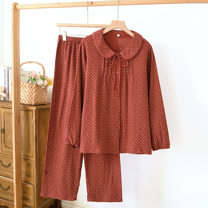 달콤한 봄과 가을 느슨한 세트 브닝 니언 레드 코튼 파자마 인형 칼라 거즈 긴 소매 카디건 홈 옷스토어 가기