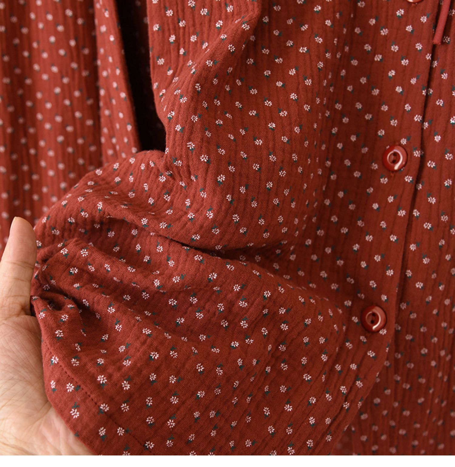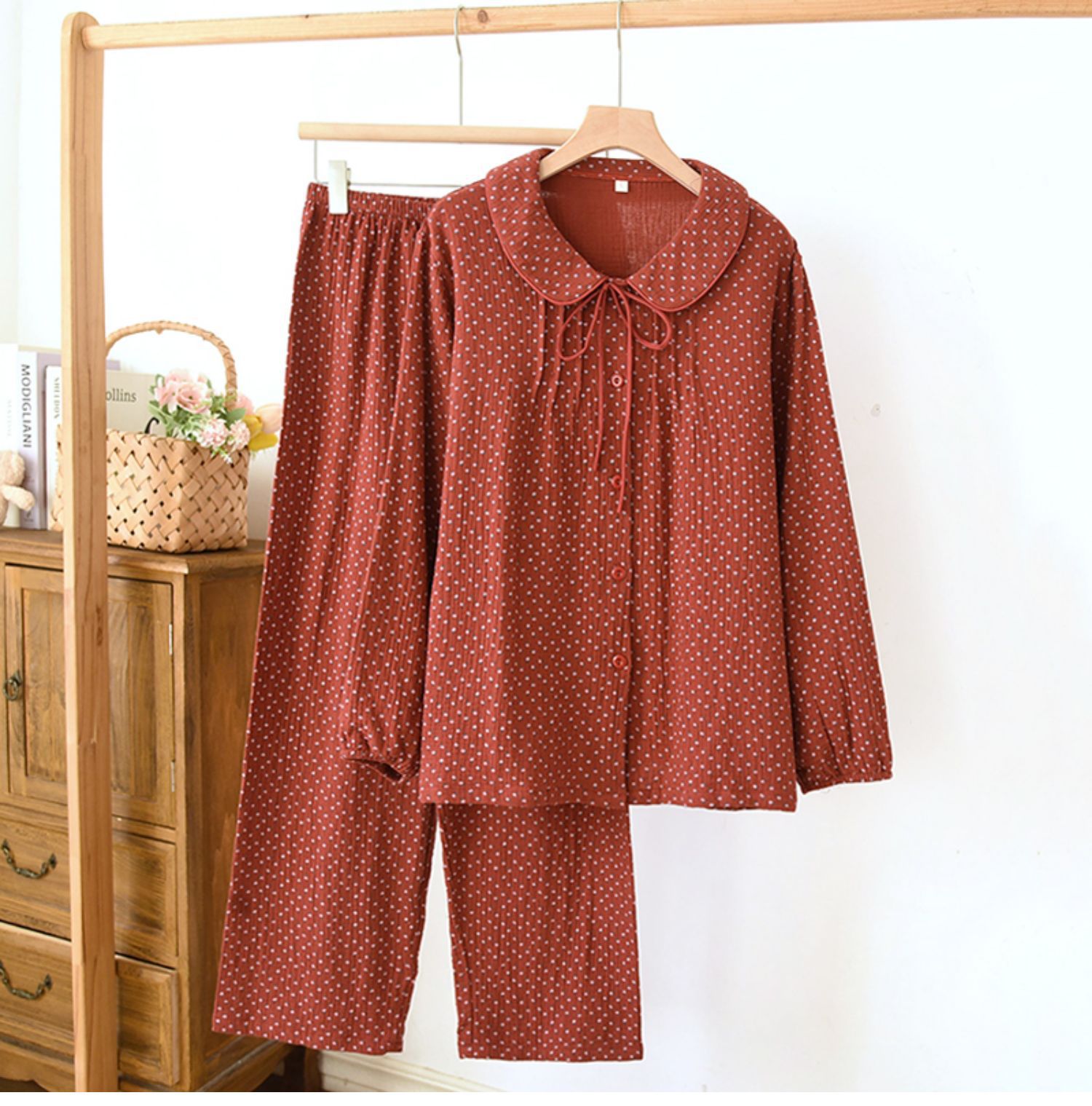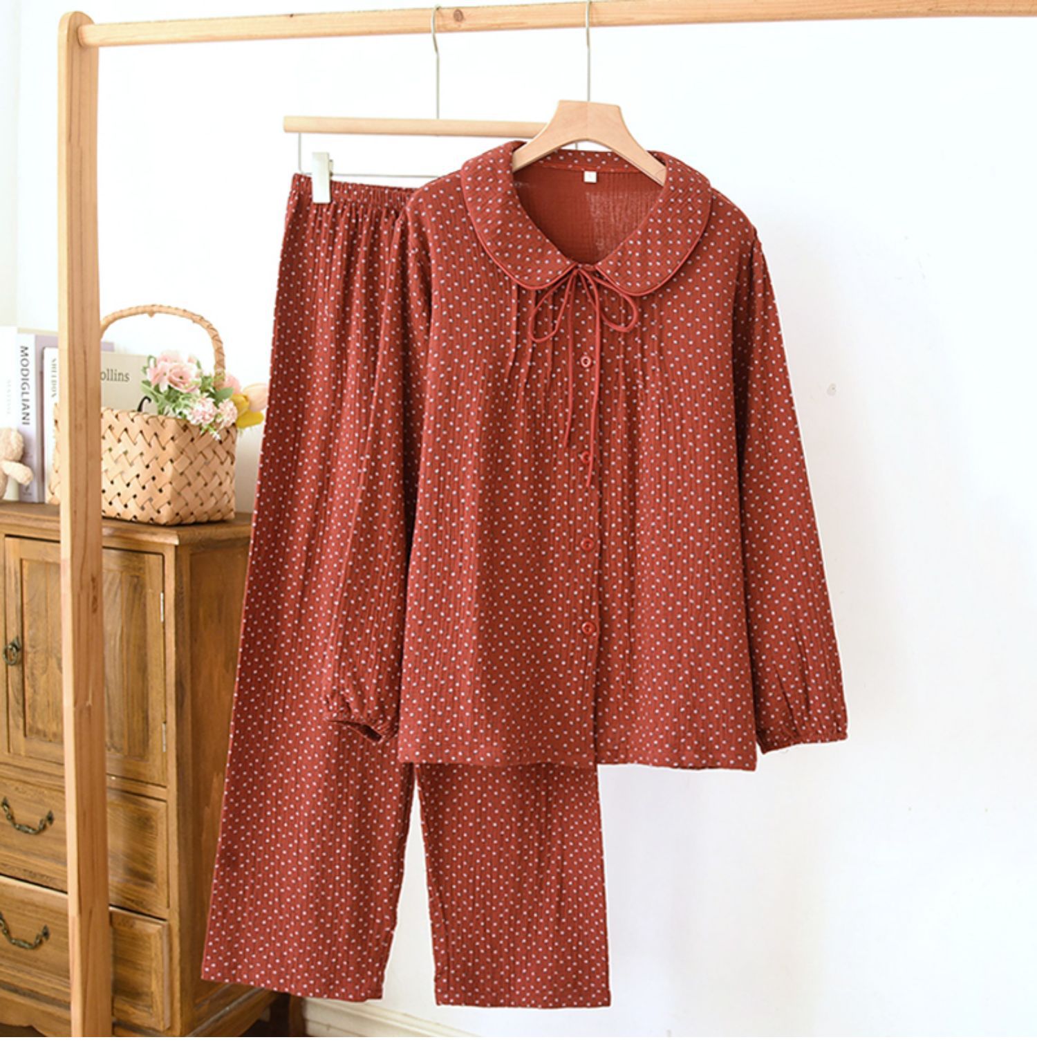 달콤한 봄과 가을 느슨한 세트 브닝 니언 레드 코튼 파자마 인형 칼라 거즈 긴 소매 카디건 홈 옷스토어 가기
