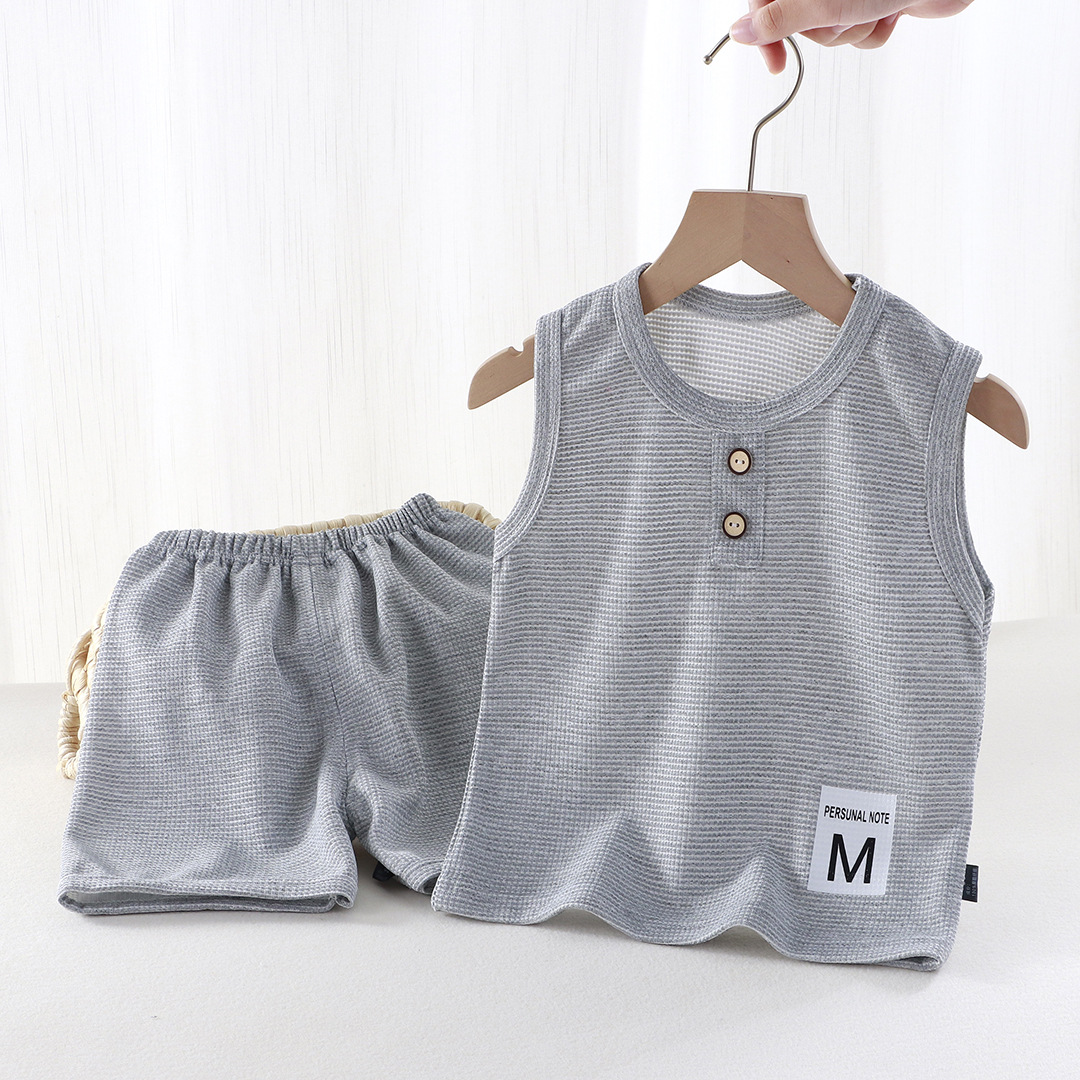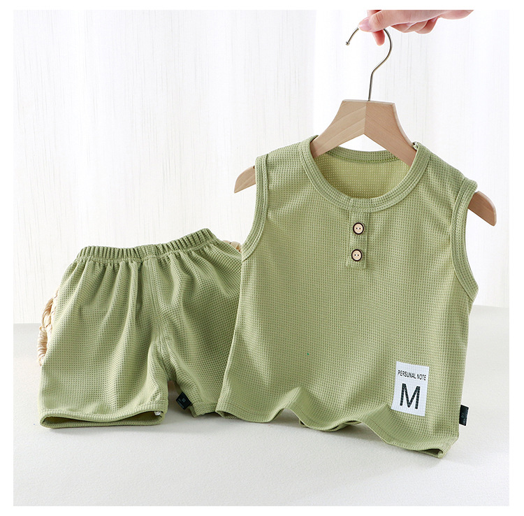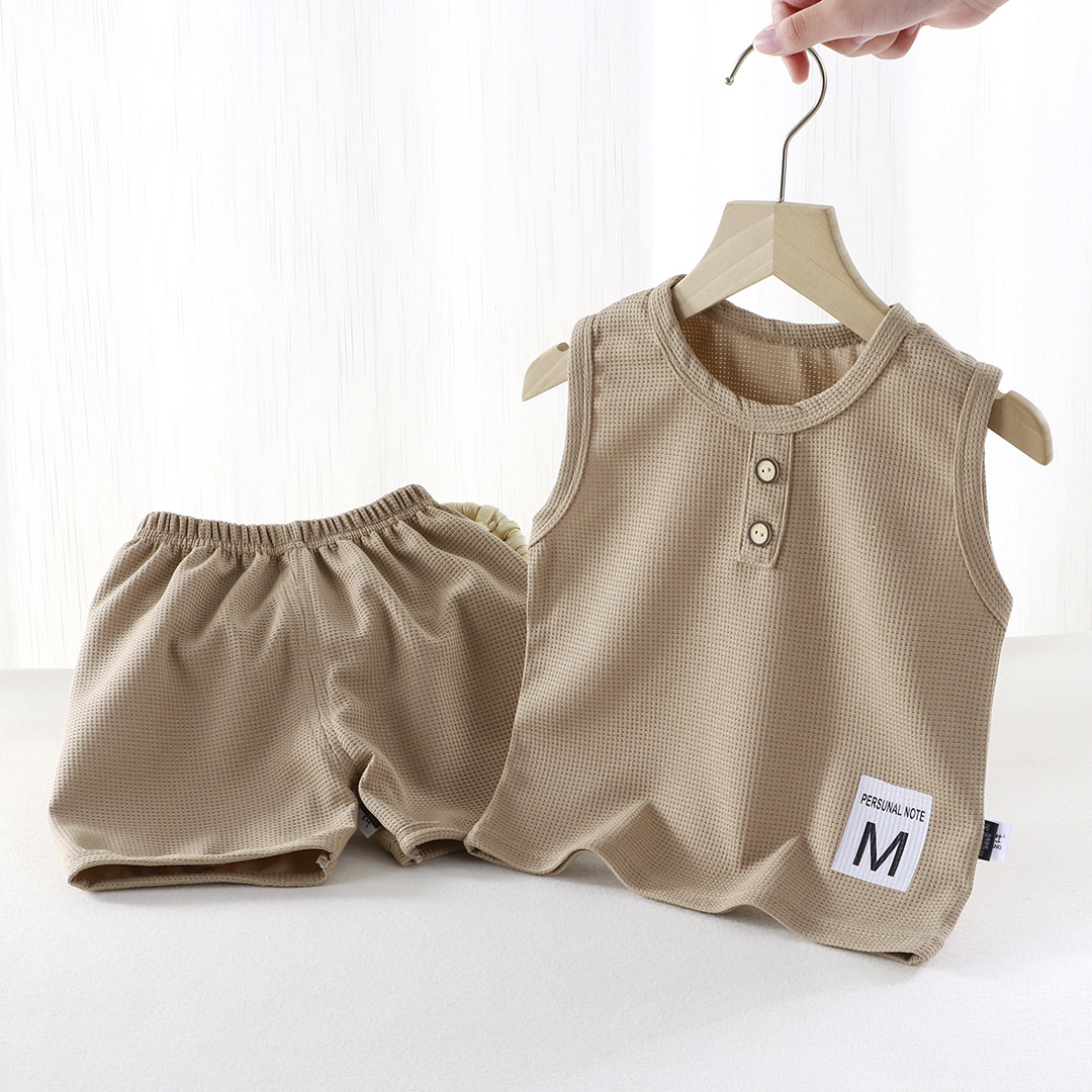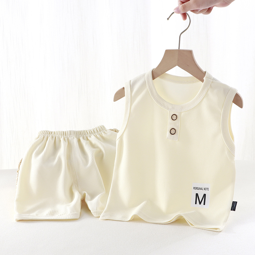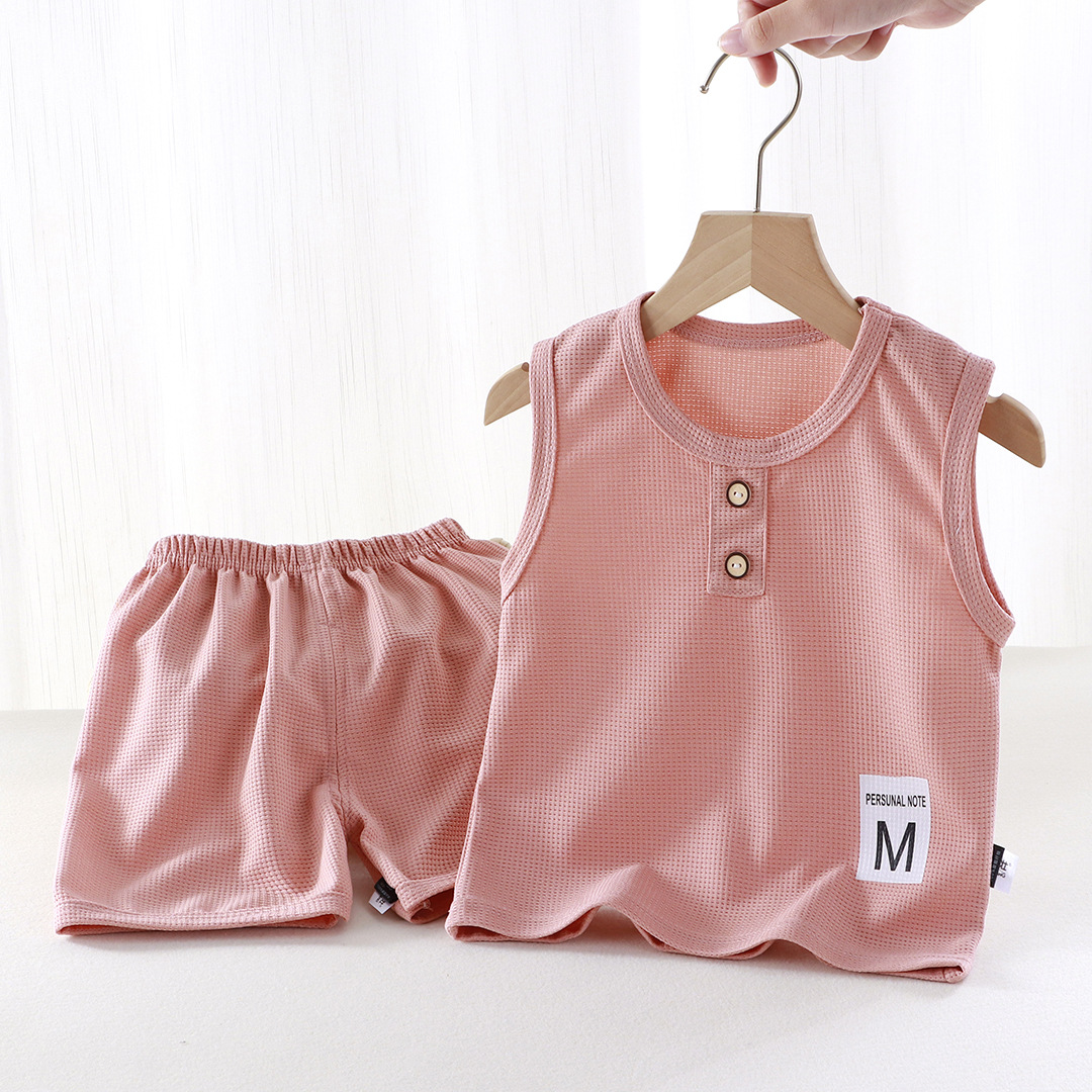 새로운 어린이 와플 조끼 세트 여름 아기 조끼 반바지 소년 소녀를위한 간단한 유행 투피스 세트