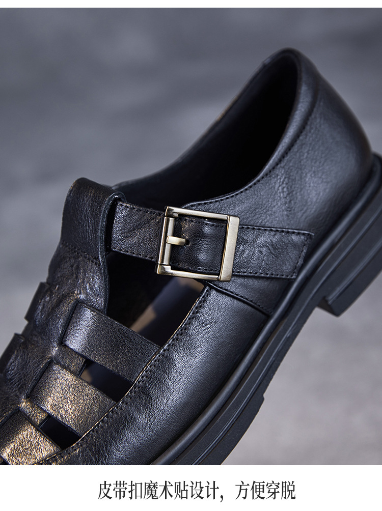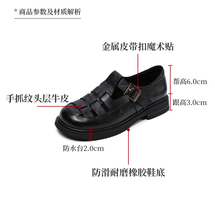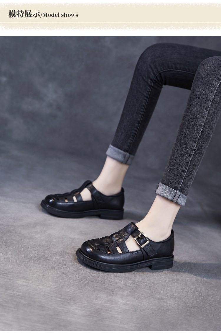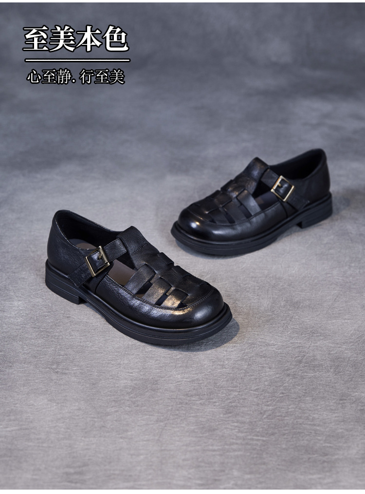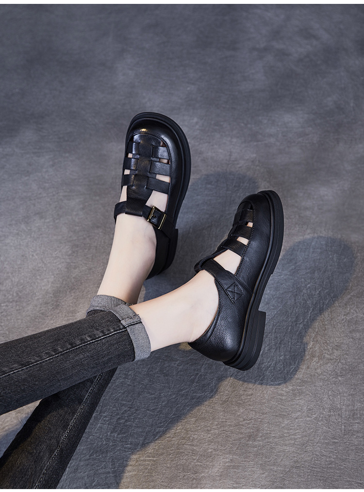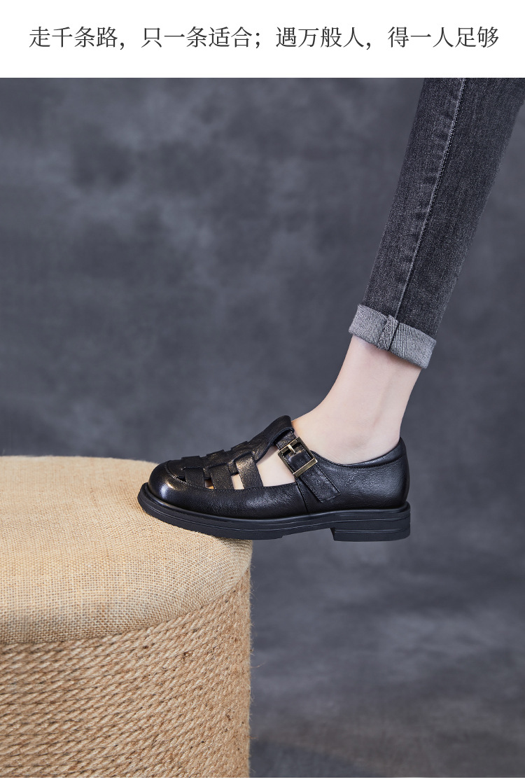 아름다운 정품 가죽 돼지 케이지 신발 여성 봄과 여름 2025 새로운 라운드 헤드 중공 플랫 벨크로 캐주얼 로마 샌들스토어 가기