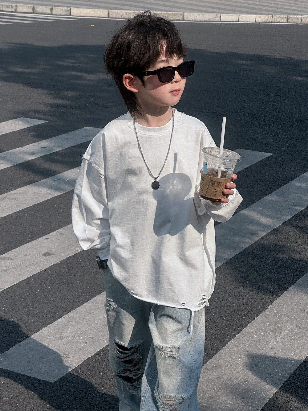 Xiner 2025 봄과 여름 새로운 어린이 부러진 버 긴 소매 티셔츠 코튼 헤비 230g 바닥 셔츠 소년 조수스토어 가기