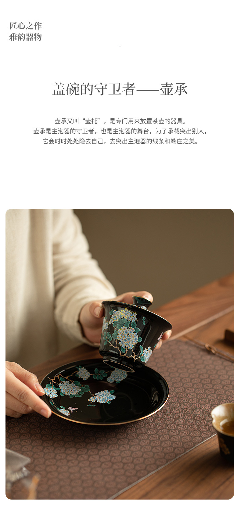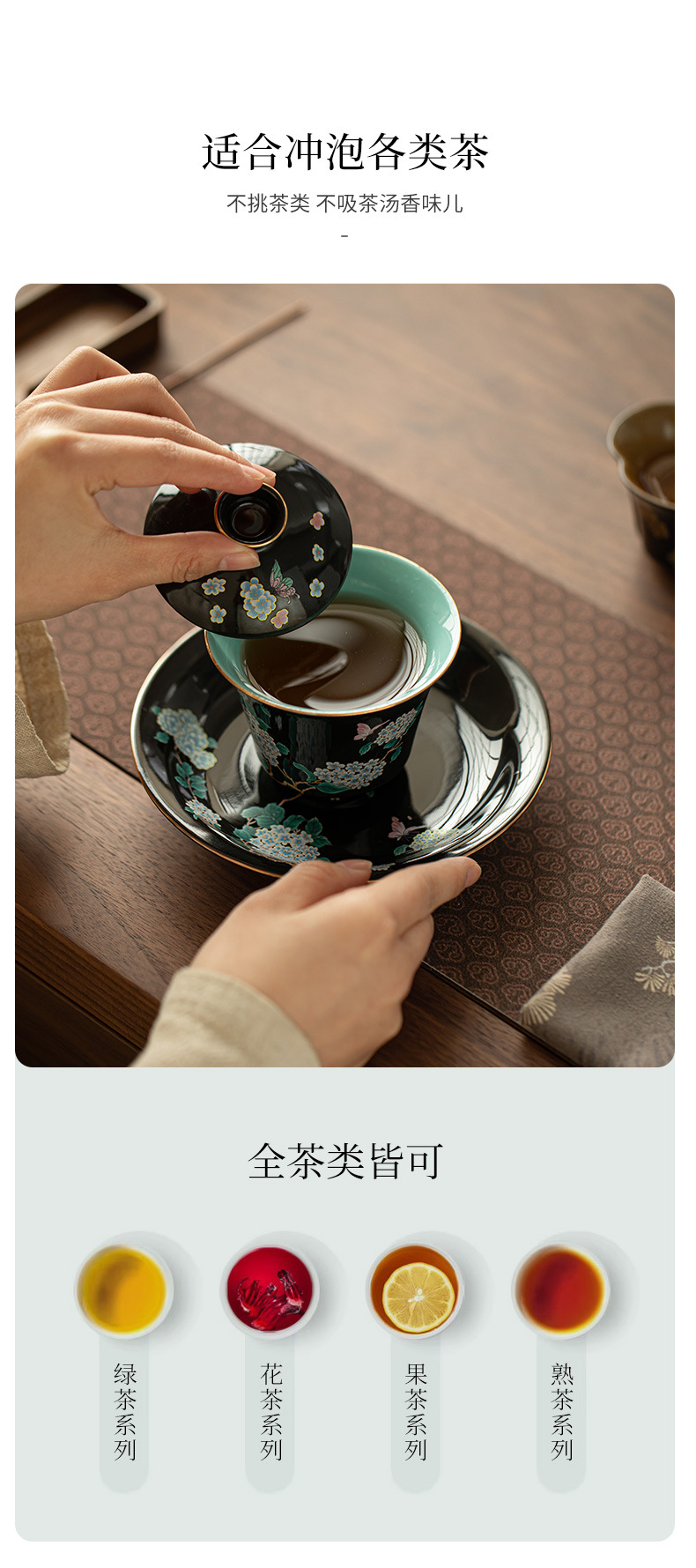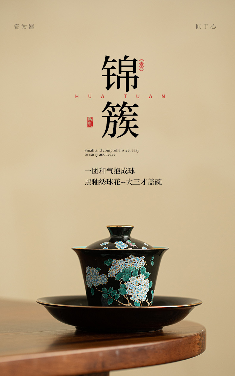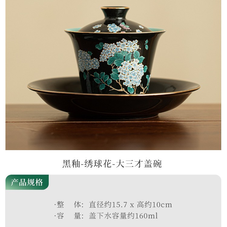 Jingdezhen 검은 유약 수국 꽃 3 인재 커버 그릇 세라믹 차 세트 손으로 만든 Filigree 차 그릇 푹신한 차 그릇 쿵푸 차 세트스토어 가기
