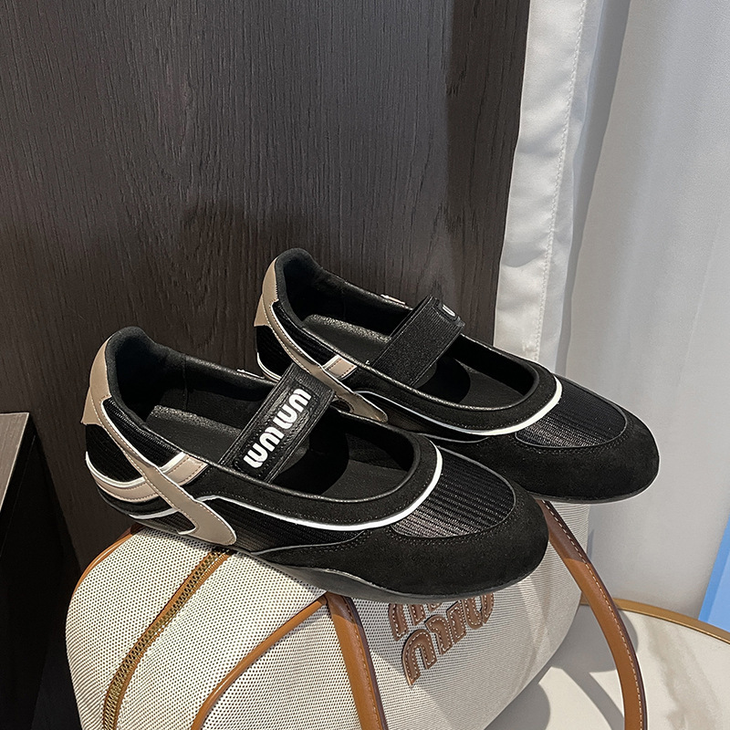 Miu 정품 가죽 메쉬 컬러 블록 플랫 슈즈 여성의 2025 년 초 봄 라운드 발가락 슬립 온 캐주얼 메리 제인 신발스토어 가기