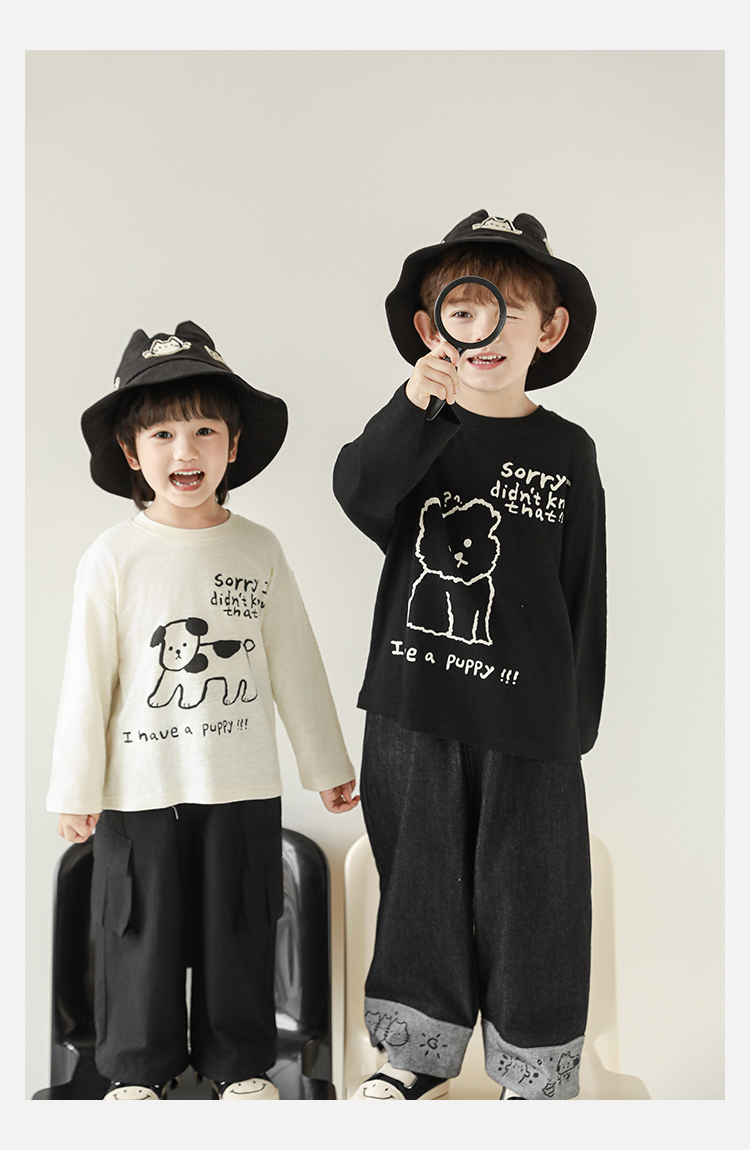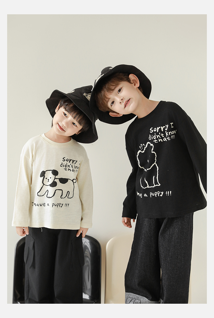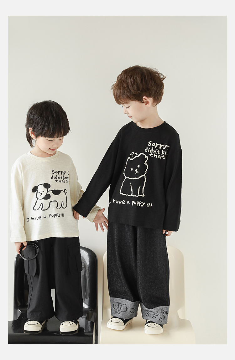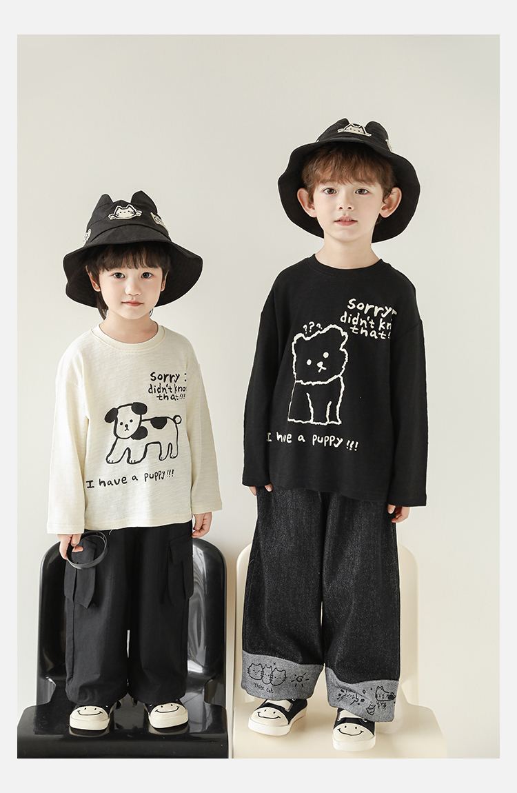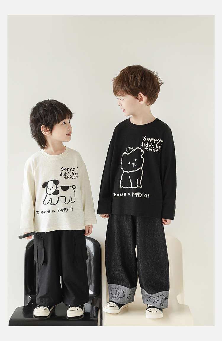 Wuri Boys의 긴 소매 크루 넥 만화 강아지 티셔츠 2025 봄 어린이 패션 루즈 탑스토어 가기