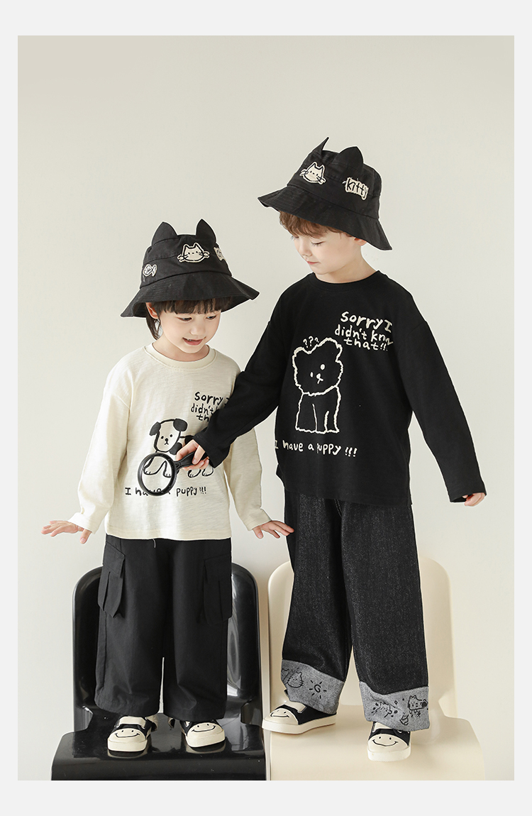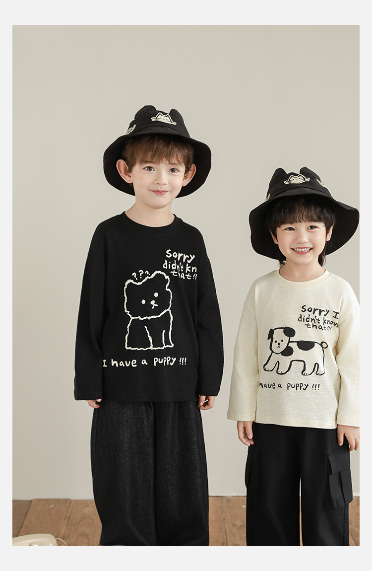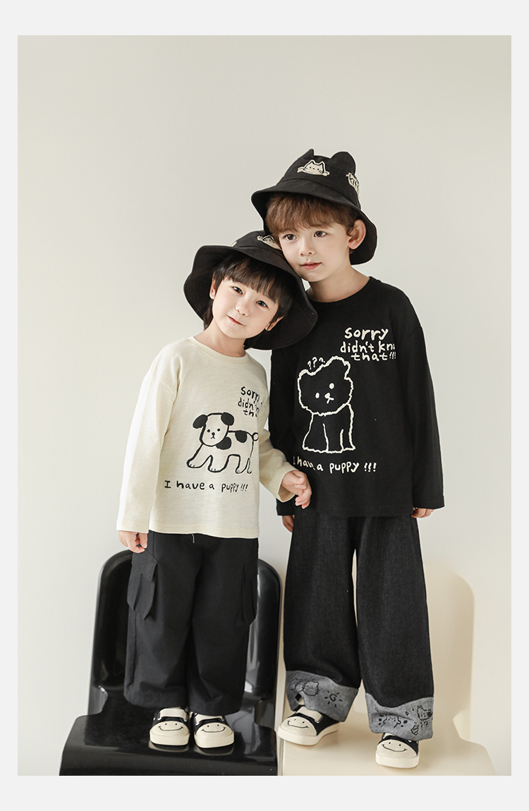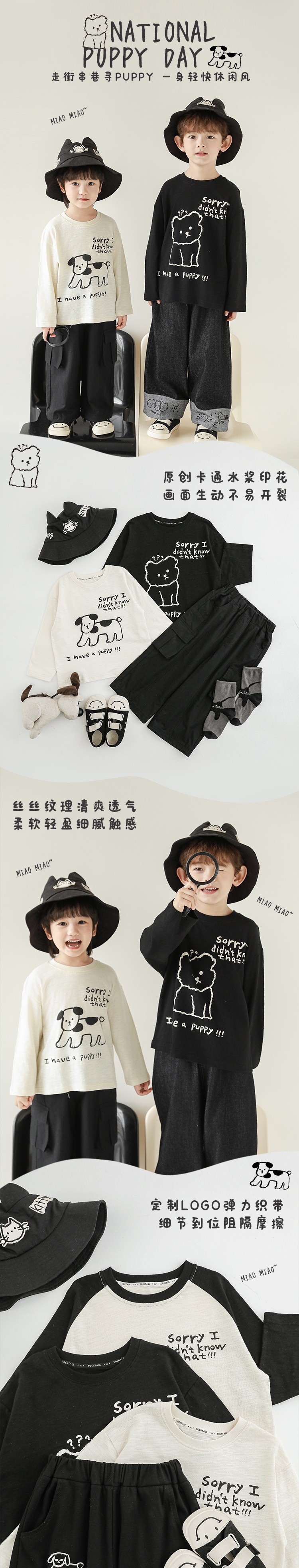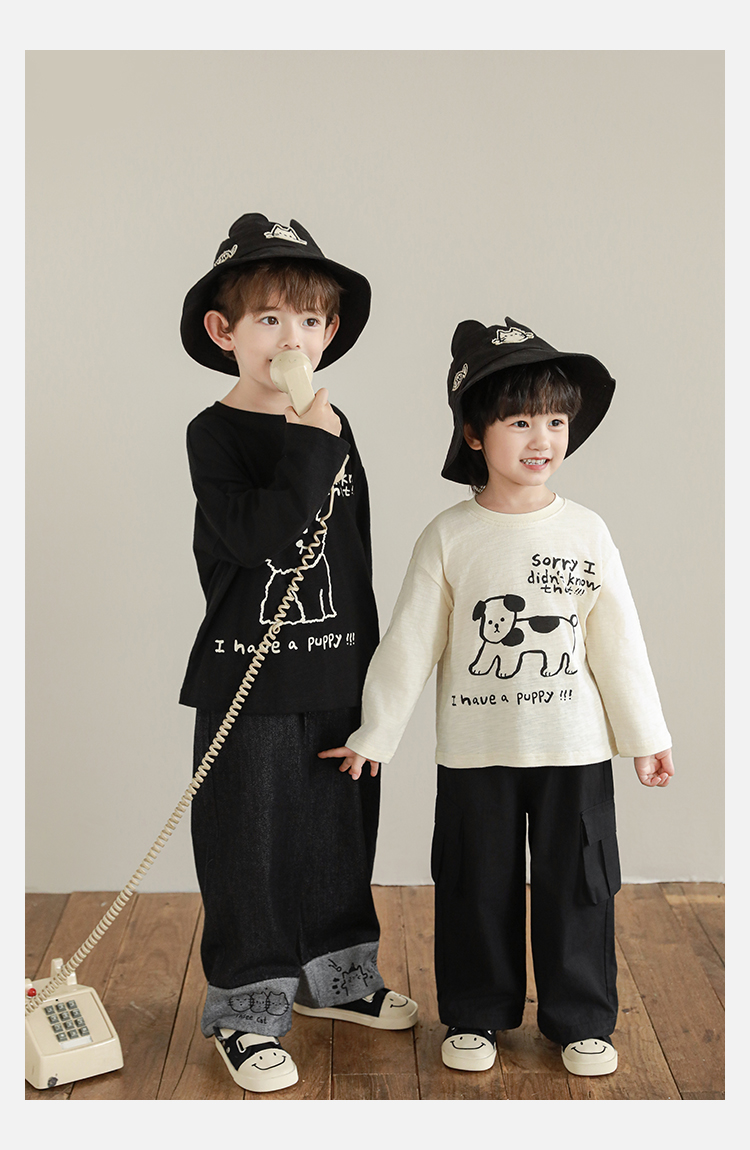 Wuri Boys의 긴 소매 크루 넥 만화 강아지 티셔츠 2025 봄 어린이 패션 루즈 탑스토어 가기