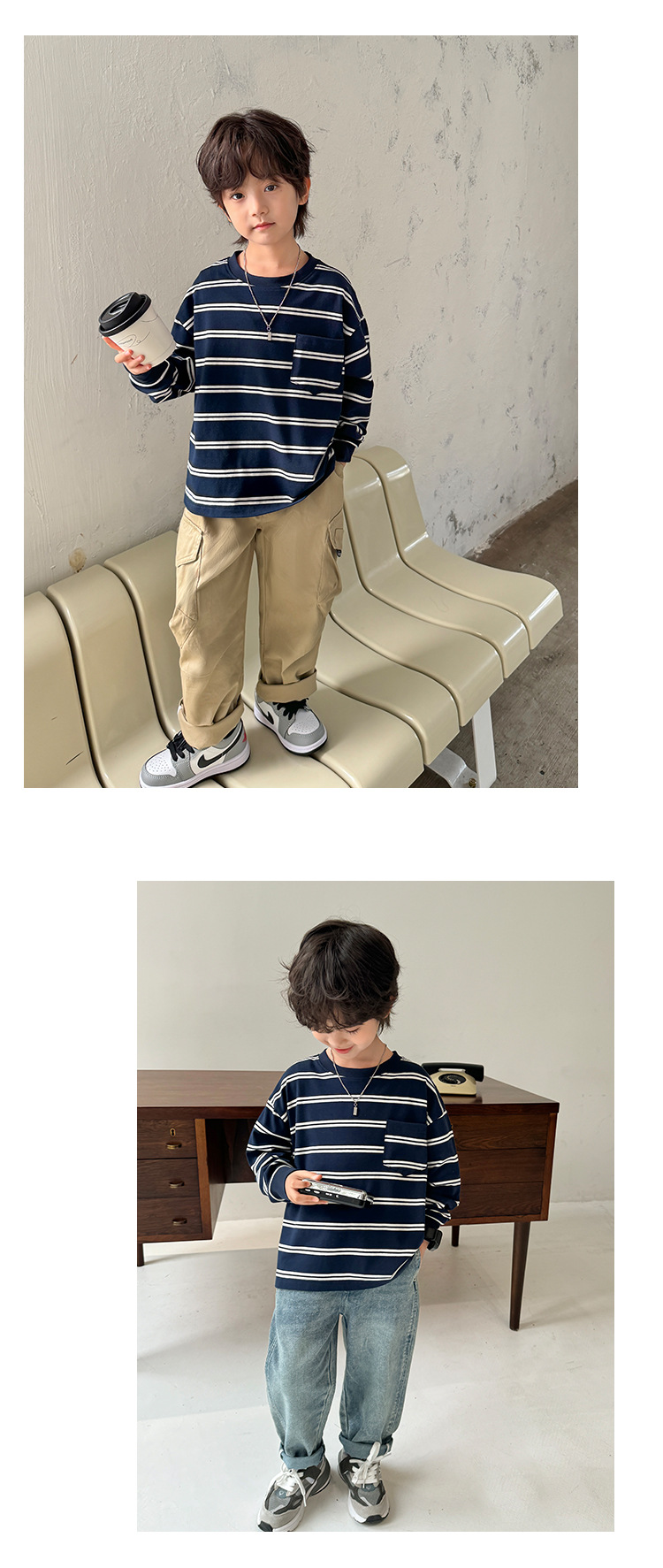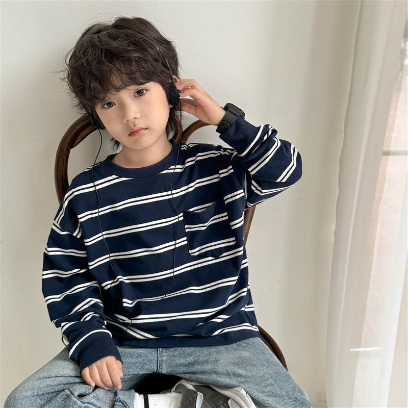 Haima Home 2025 새로운 가을 스타일 소년의 세련된 긴팔 줄무늬 티셔츠 순면 가을 옷 한국 스타일 아동복 유행스토어 가기