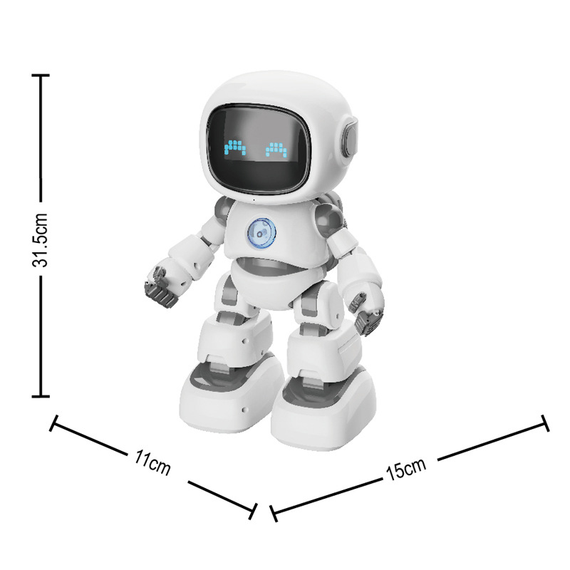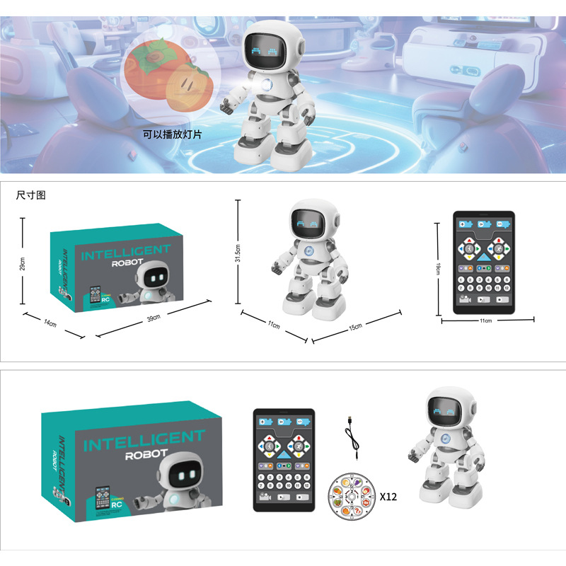 功能:步行和滑行(前进/后退/左转/右转),,头能左右转,手可以上下抬放。音乐和跳舞。编程功能,面部灯光表情功能,头部触摸感应功能。语音对话功能,投影功能(配12张投影片,每张有8个图案)。