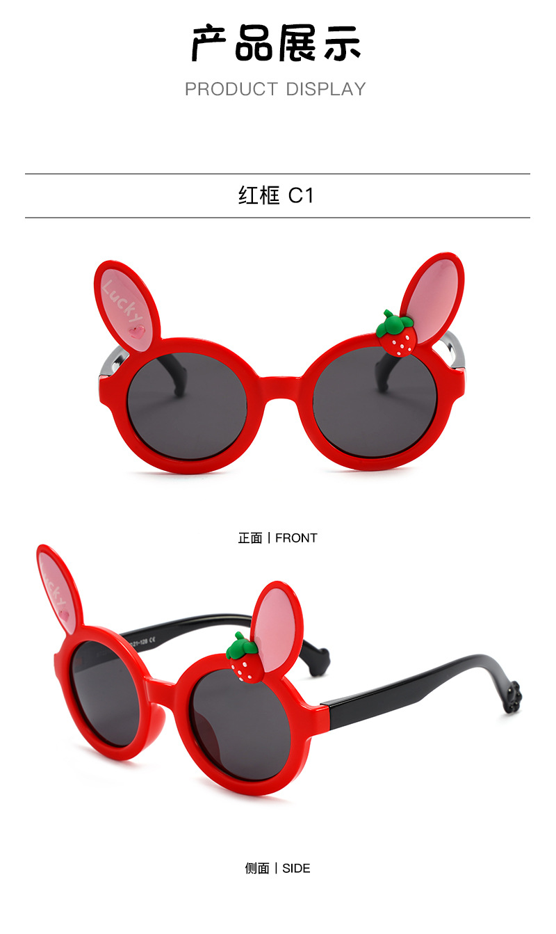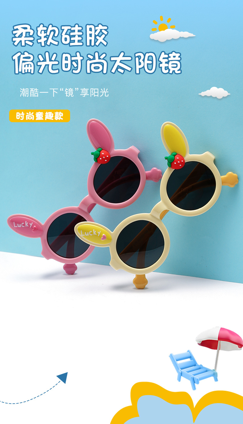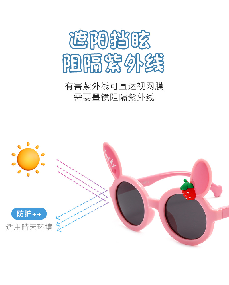 새로운 어린이 귀여운 착용 선글라스 남성 토끼 귀 딸기 장식 선글라스 여성 편광 양산 안경 도매