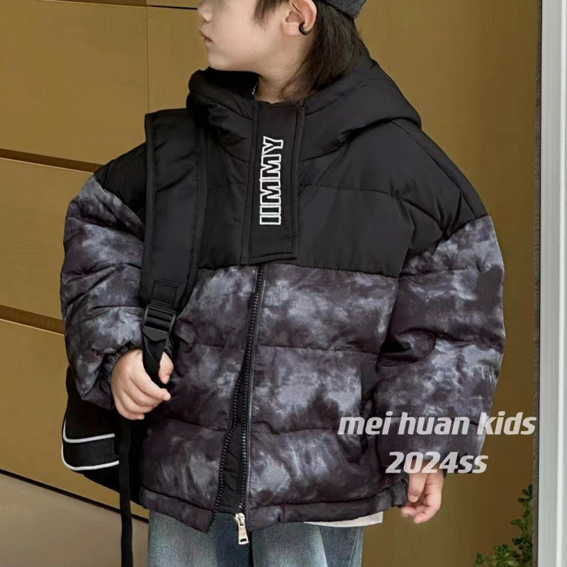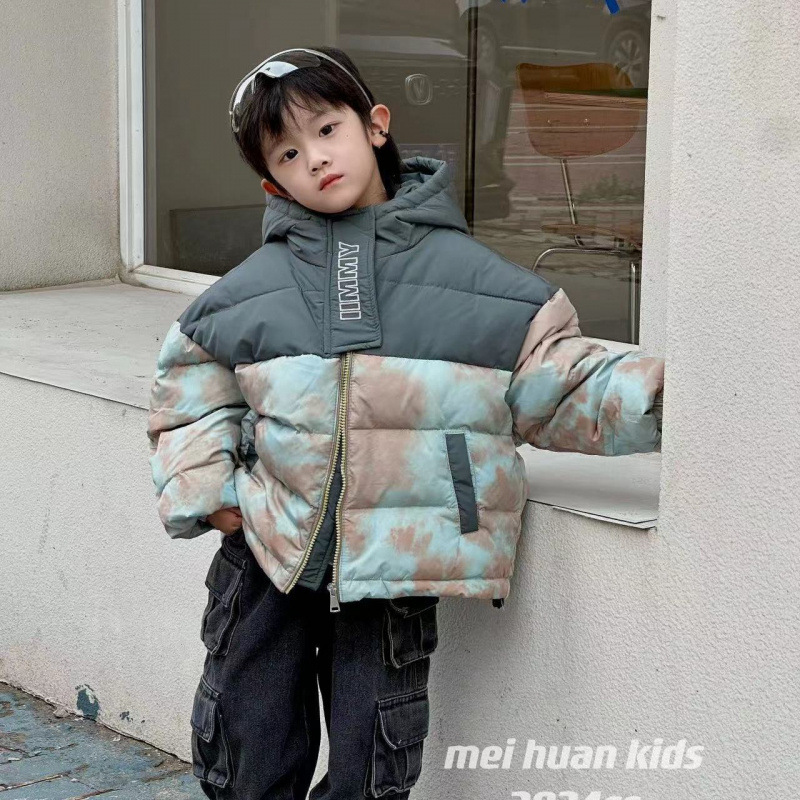 2024 겨울 새 어린이 짧은 다운 재킷 중 큰 어린이 따뜻한 타이-염료 옷 소년 소녀를위한 두꺼운 후드 자켓