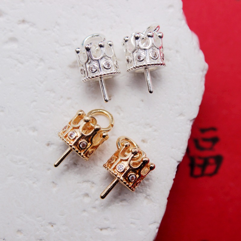 14K包金保色银色镶锆石皇冠吊针珍珠玉石半孔DIY手链项链手工饰品